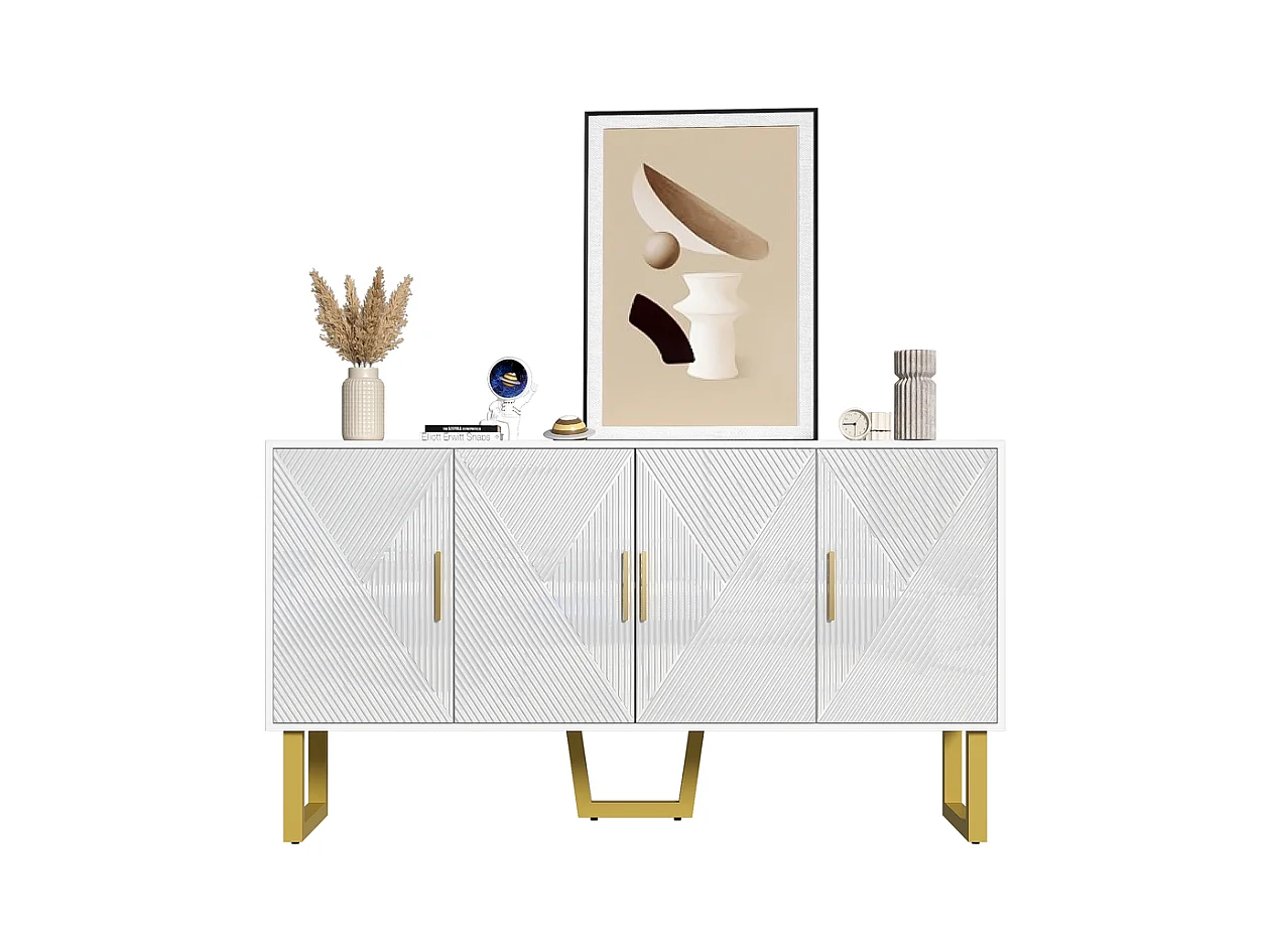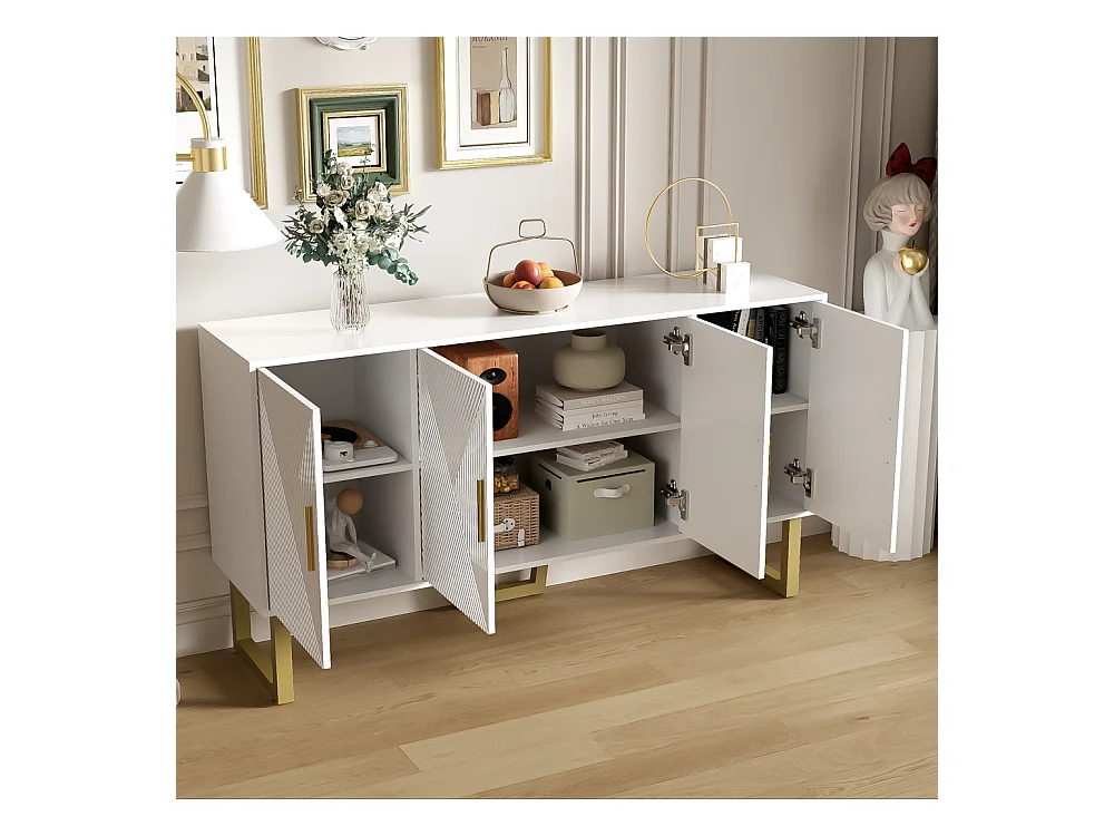 Buffet moderne luxe 4 portes texturées brillantes poignées dorées étagères réglables en hauteur Blanc