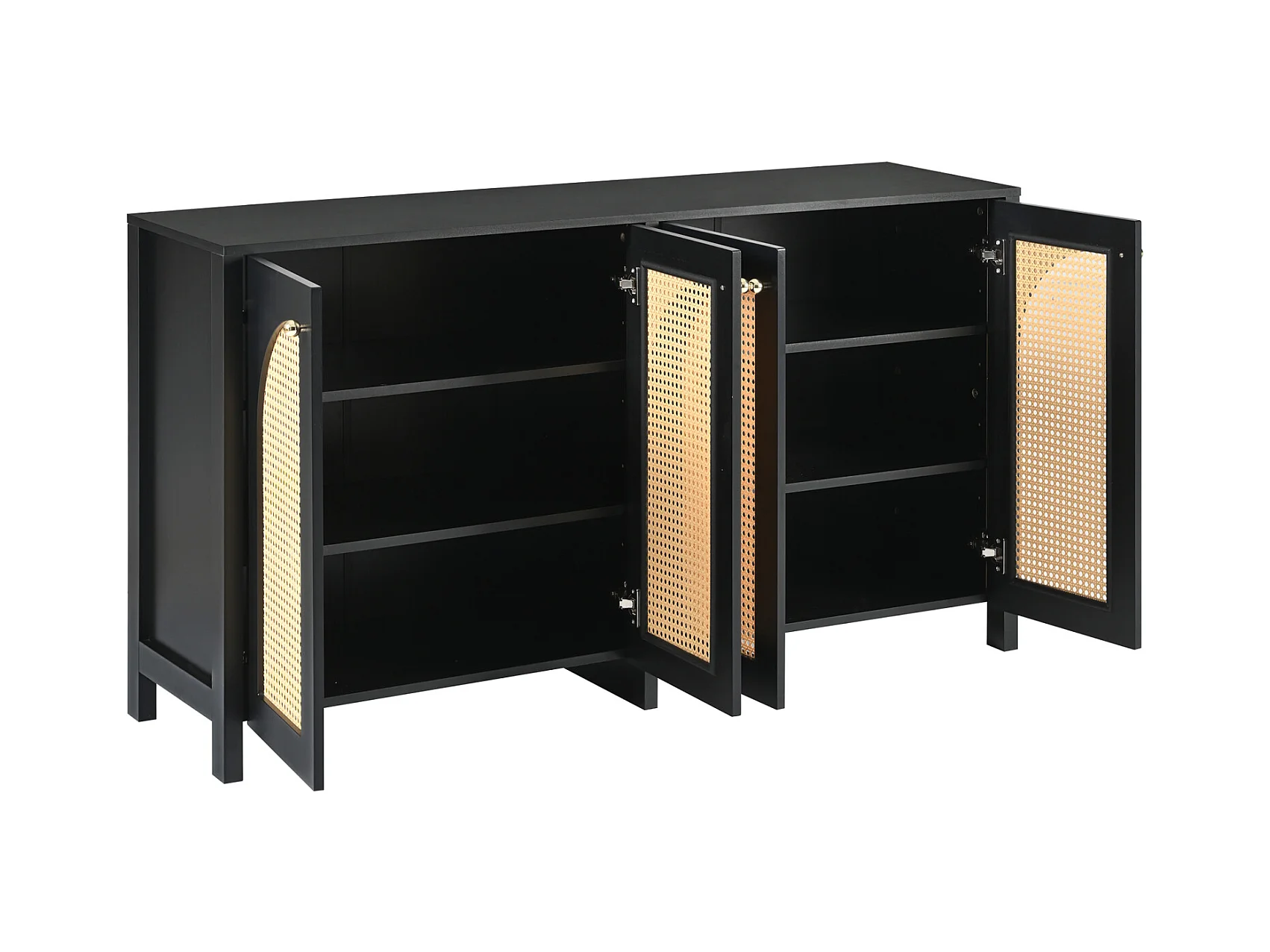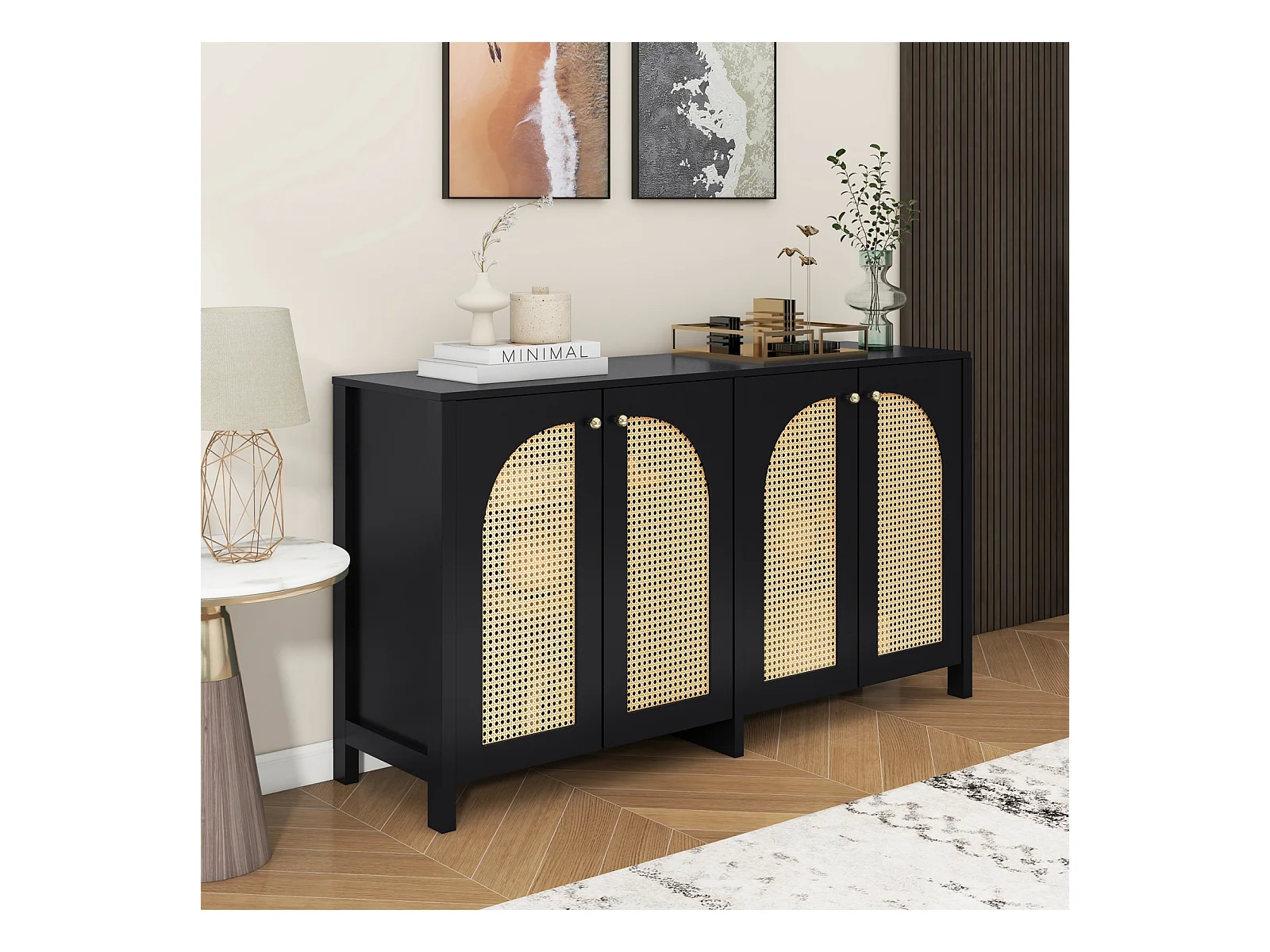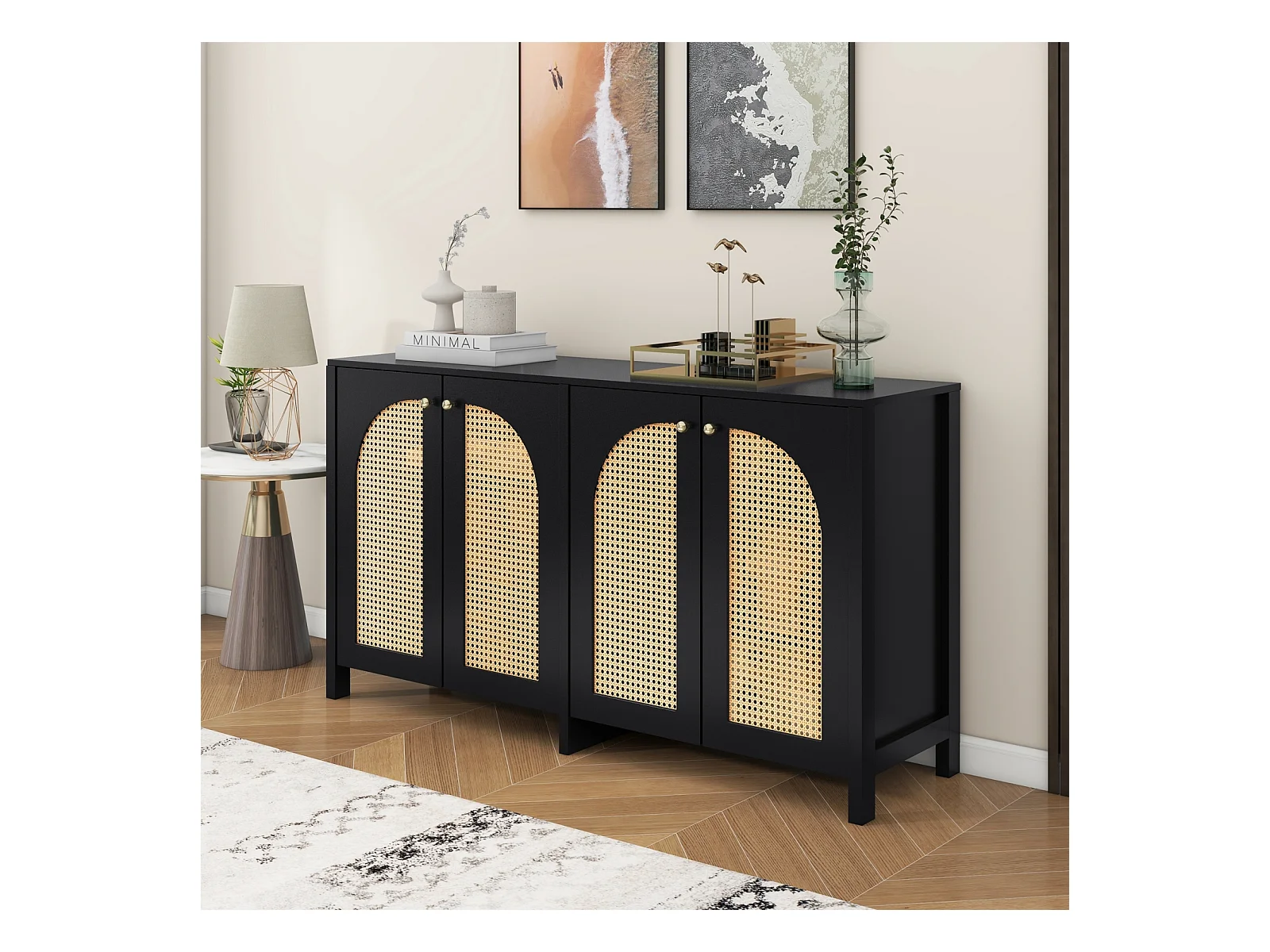 Buffet moderne minimaliste 4 portes en rotin avec poignées métal – Meuble pratique pour salle à manger, salon et cuisine – Noir