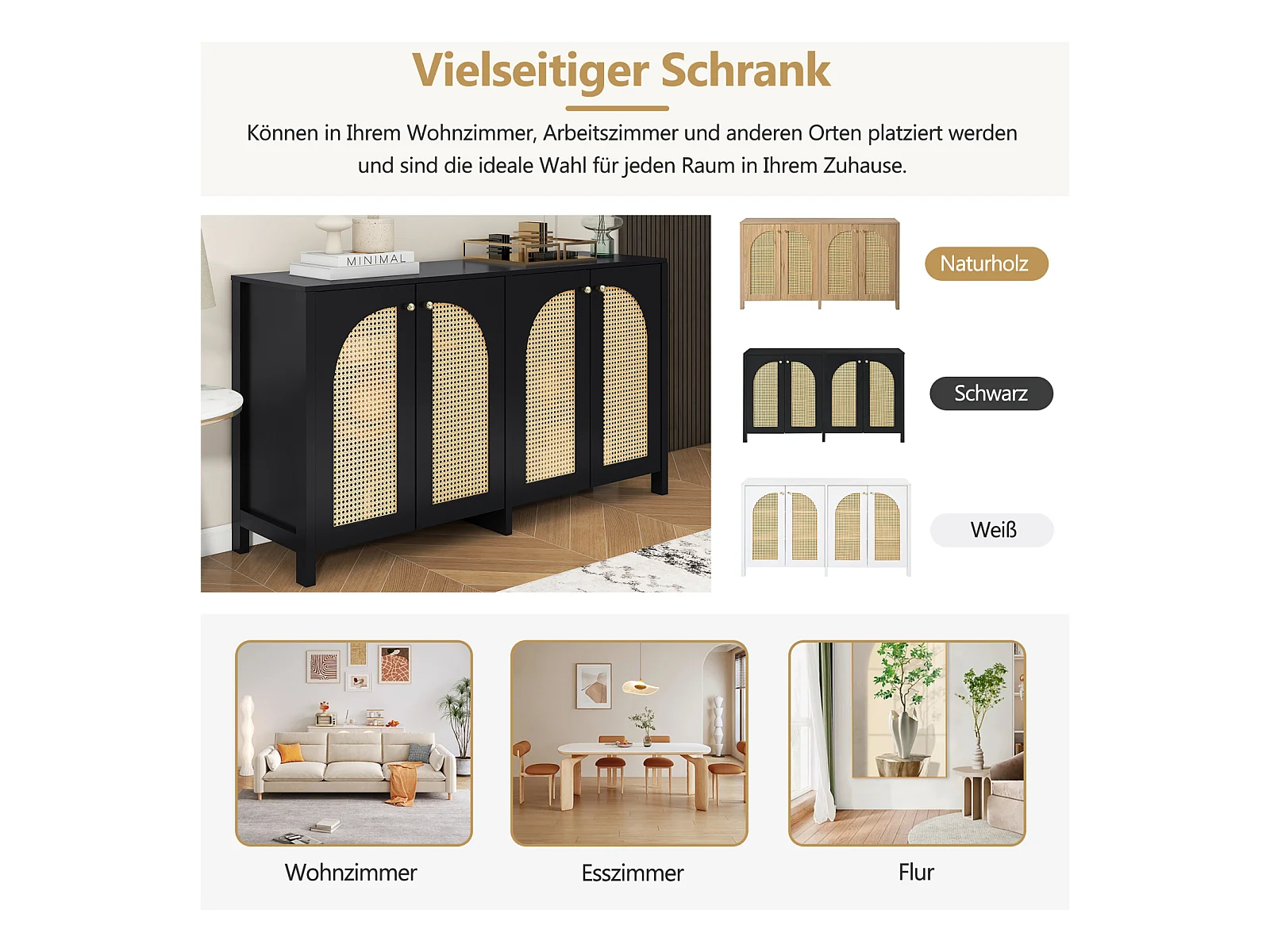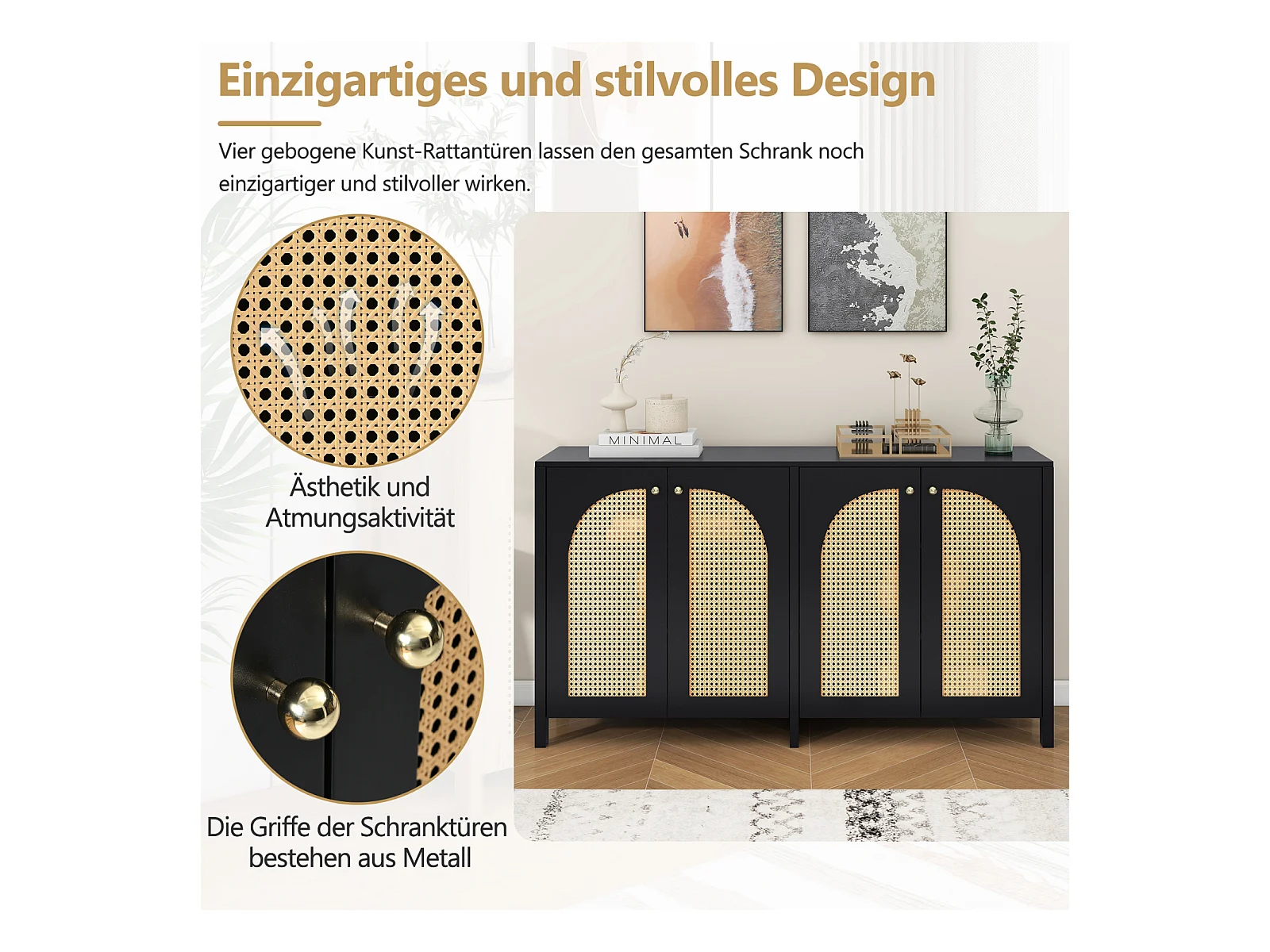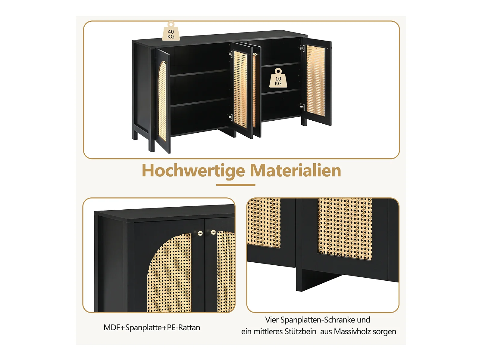 Buffet moderne minimaliste 4 portes en rotin avec poignées métal – Meuble pratique pour salle à manger, salon et cuisine – Noir