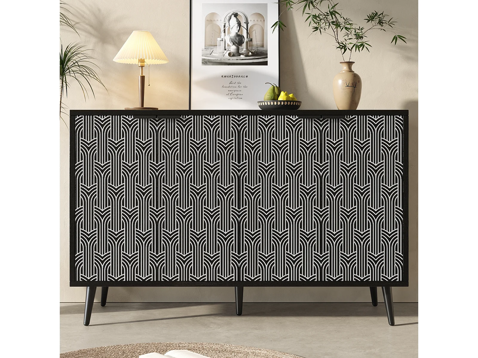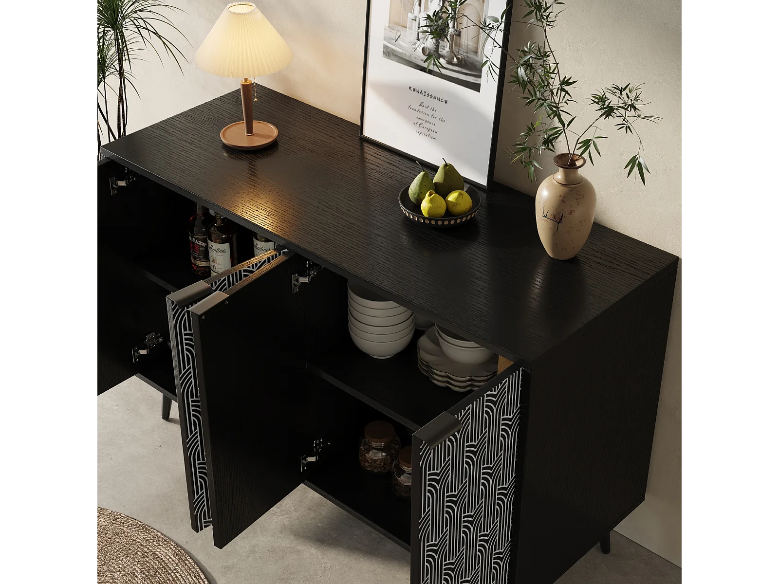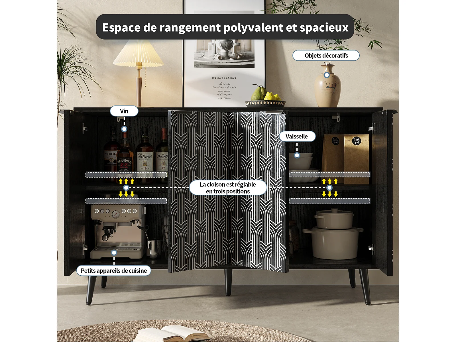 Buffet noir 120x35x78 cm, design de porte unique, motif chevron sculpté, anti-basculement, autoportant, idéal salle à manger et salon
