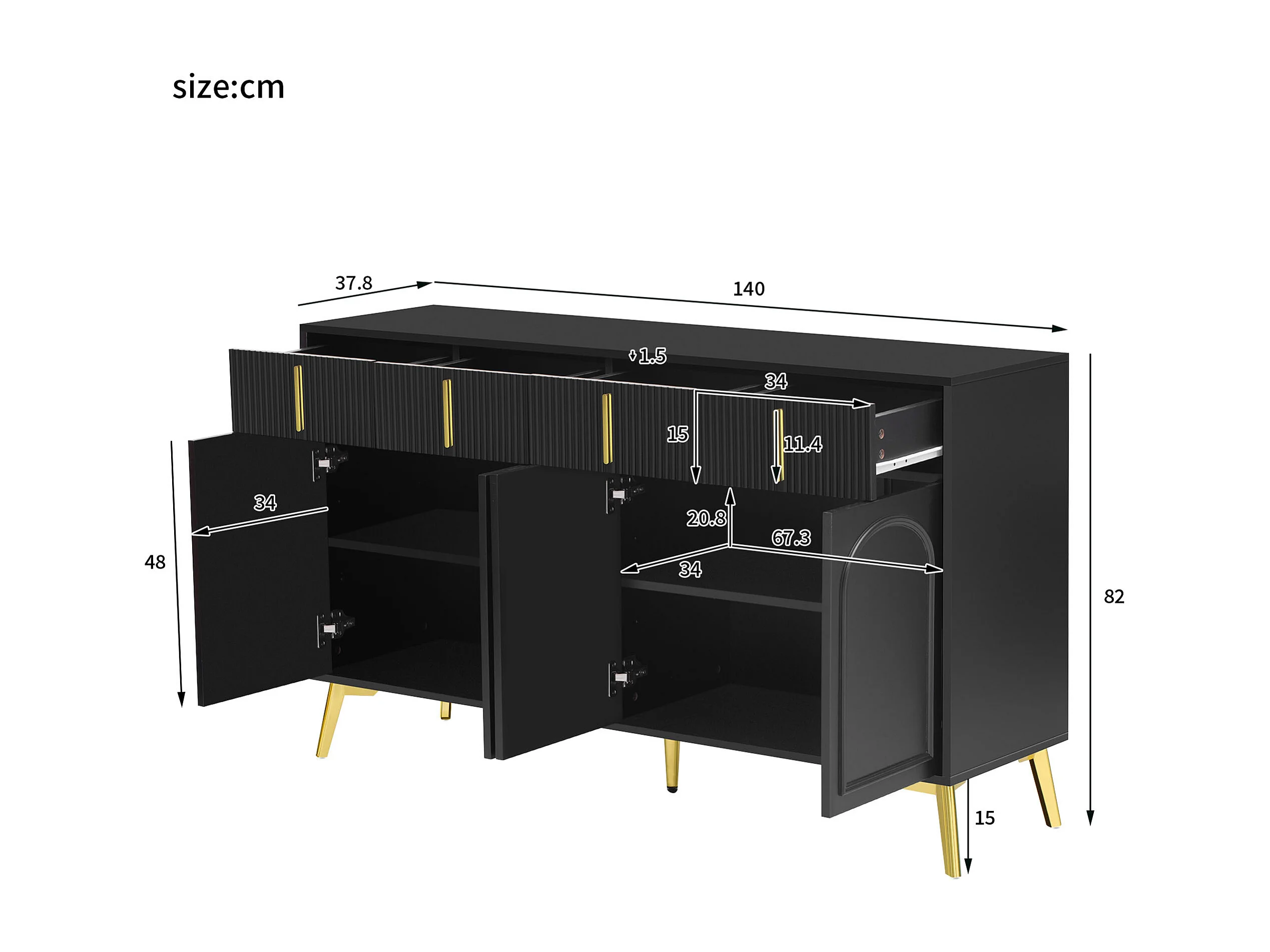 Buffet noir 4 portes 4 tiroirs avec poignées et pieds dorés 140*37,8*82cm CHADDANS