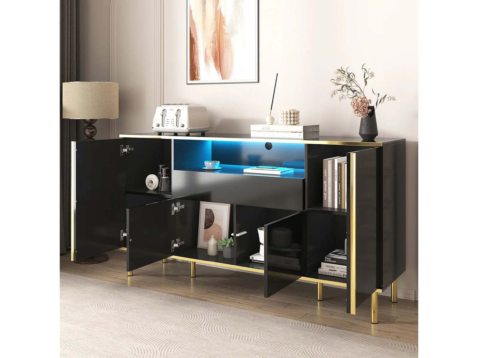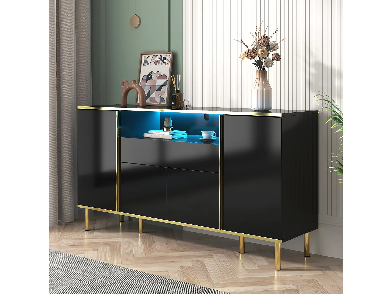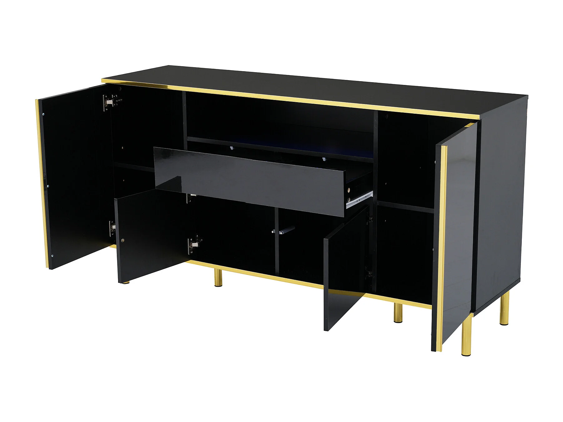 Buffet noir brillant 150x40x80 cm, 1 tiroir, armoire de rangement multifonction, idéal chambre et salon, style moderne