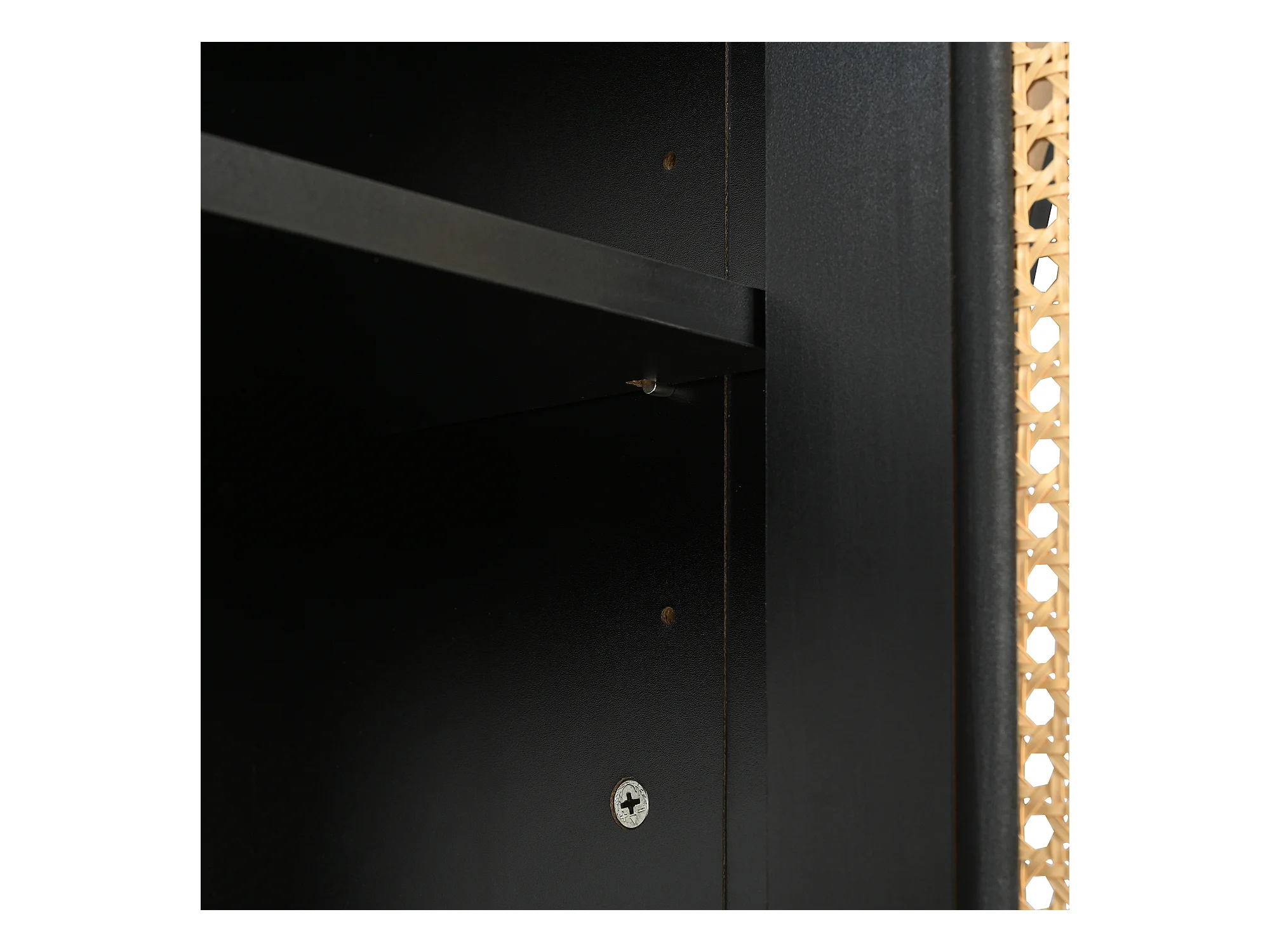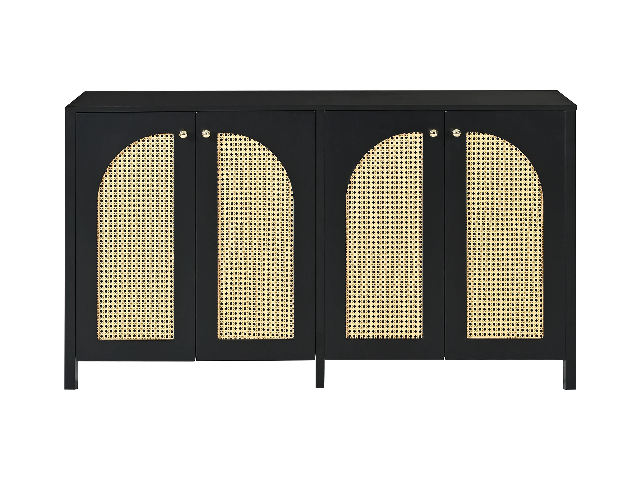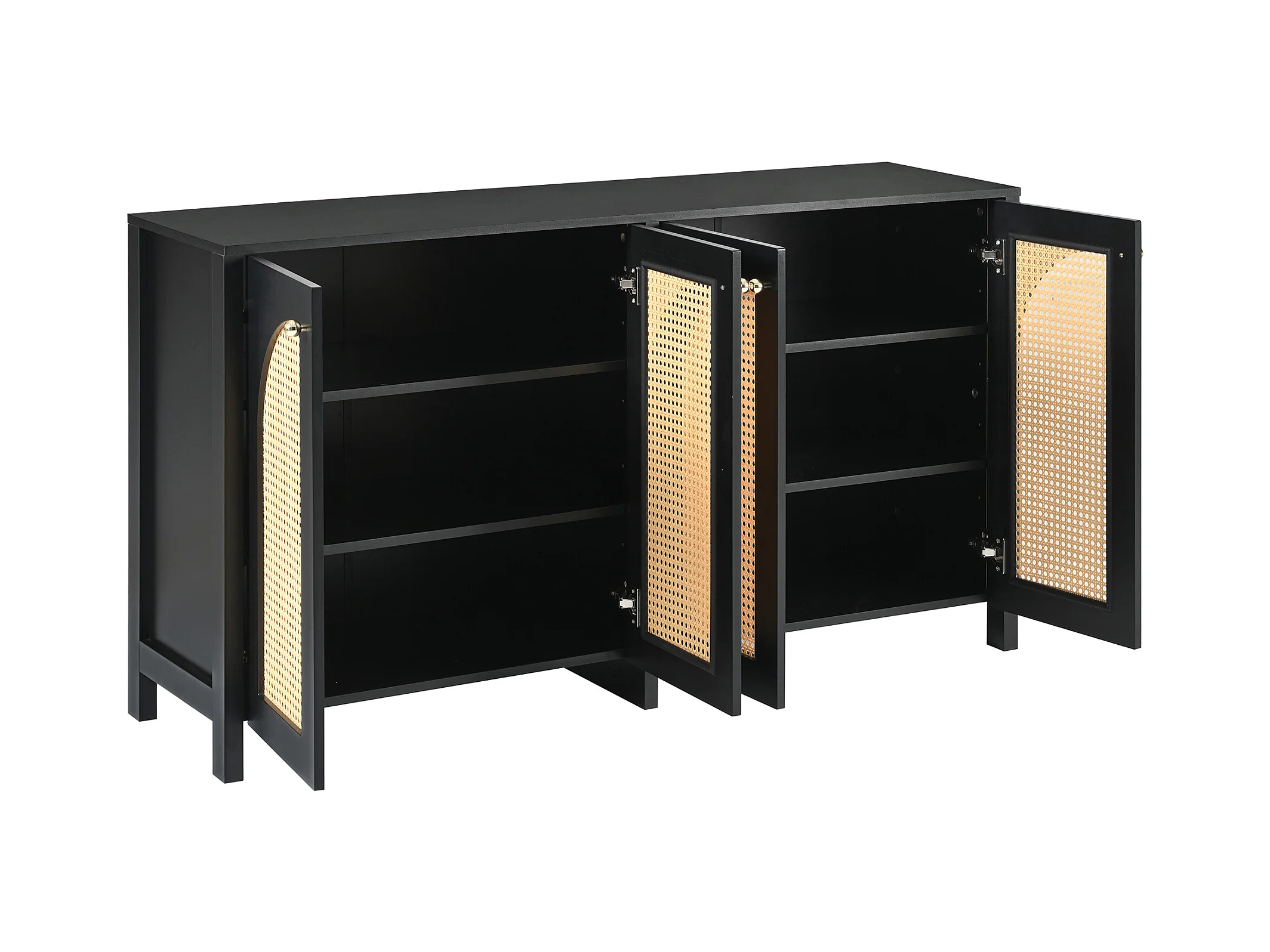 Buffet noir avec 4 portes en rotin et étagères réglables, 140x80x40 cm