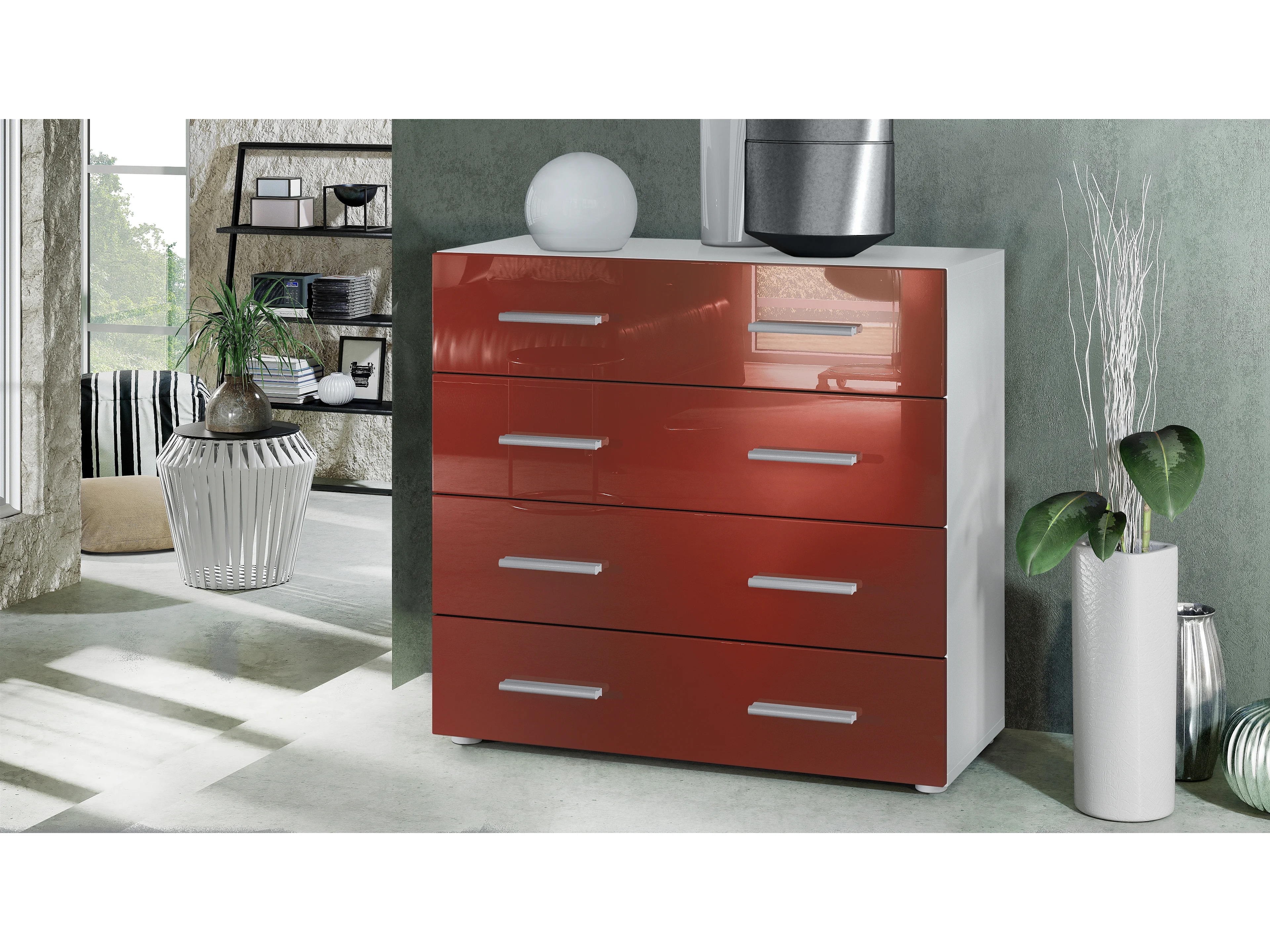 Buffet Pavos, Commode avec 4 tiroirs, blanc mat/bordeaux haute brillance (76 x 72 x 35 cm)