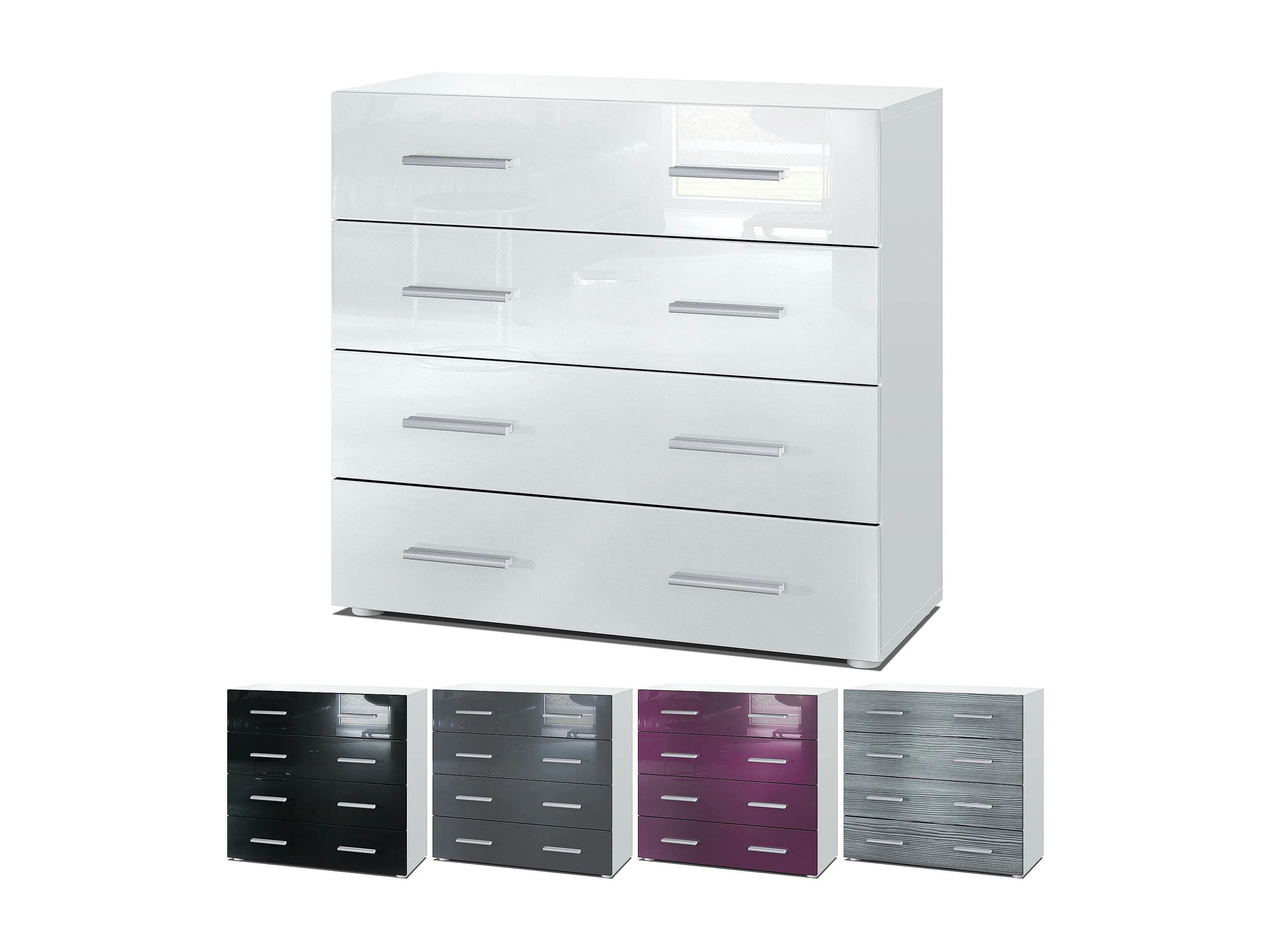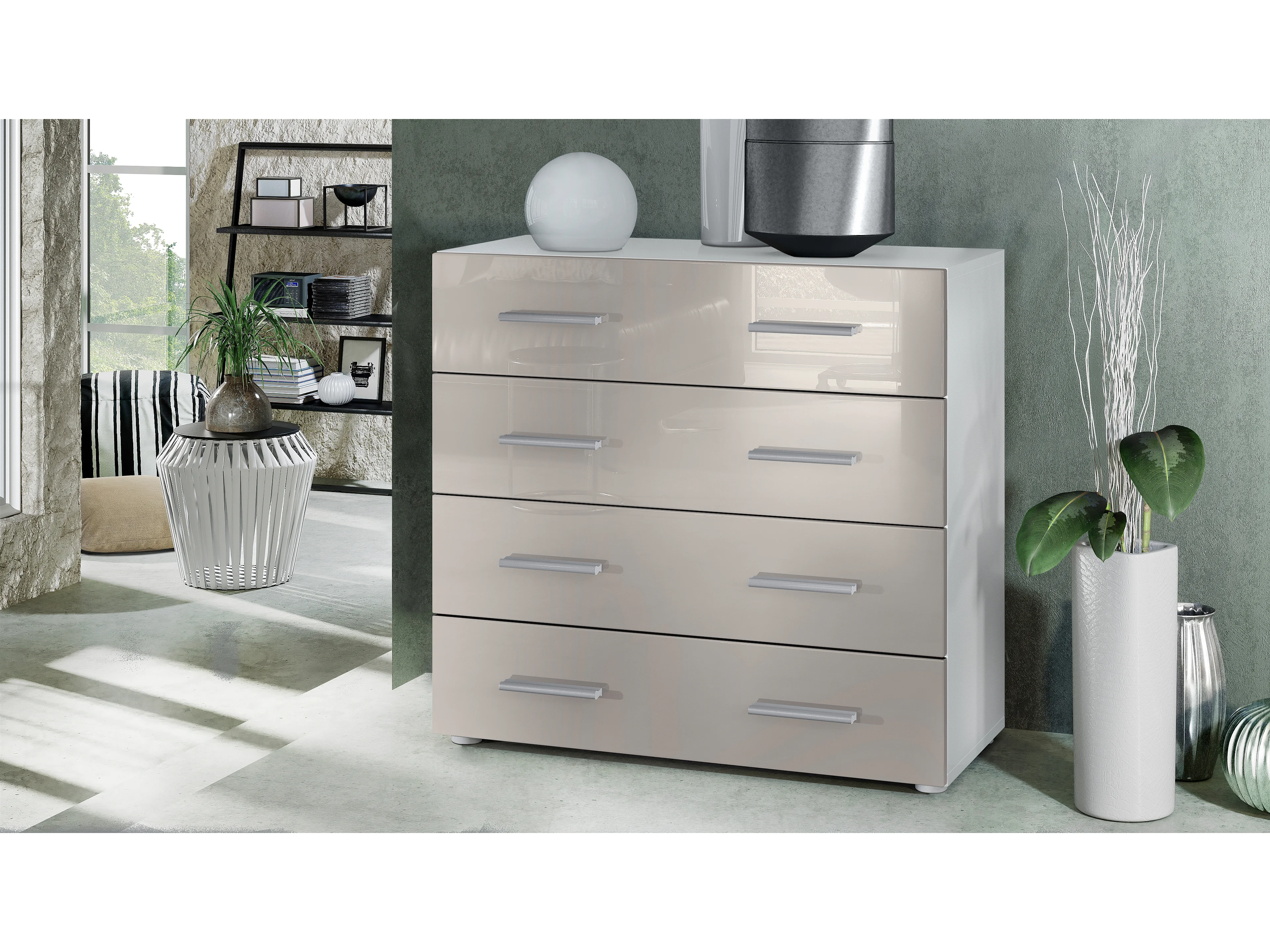 Buffet Pavos, Commode avec 4 tiroirs, blanc mat/gris sable haute brillance (76 x 72 x 35 cm)