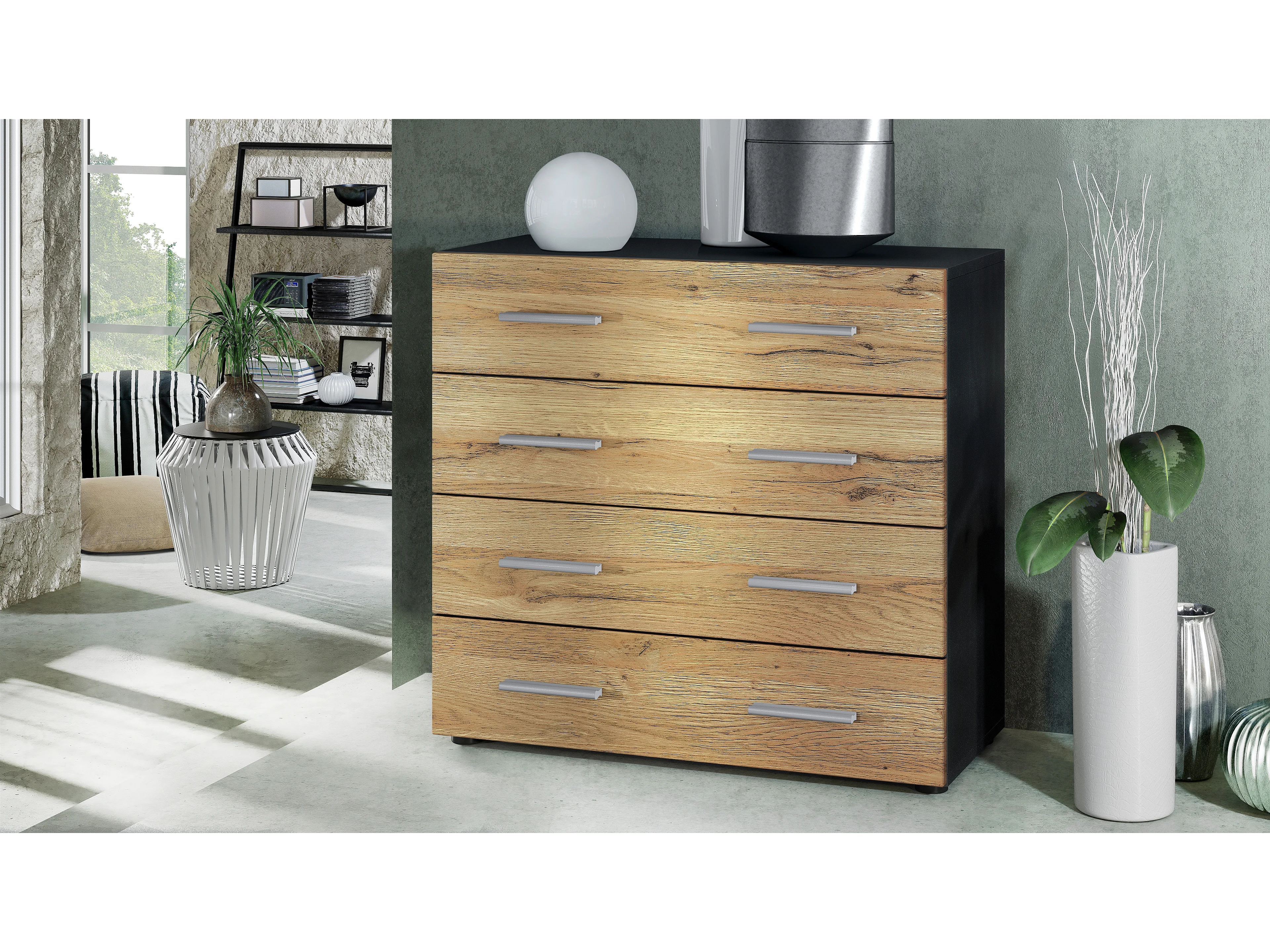 Buffet Pavos, Commode avec 4 tiroirs, noir mat/chêne nature (76 x 72 x 35 cm)