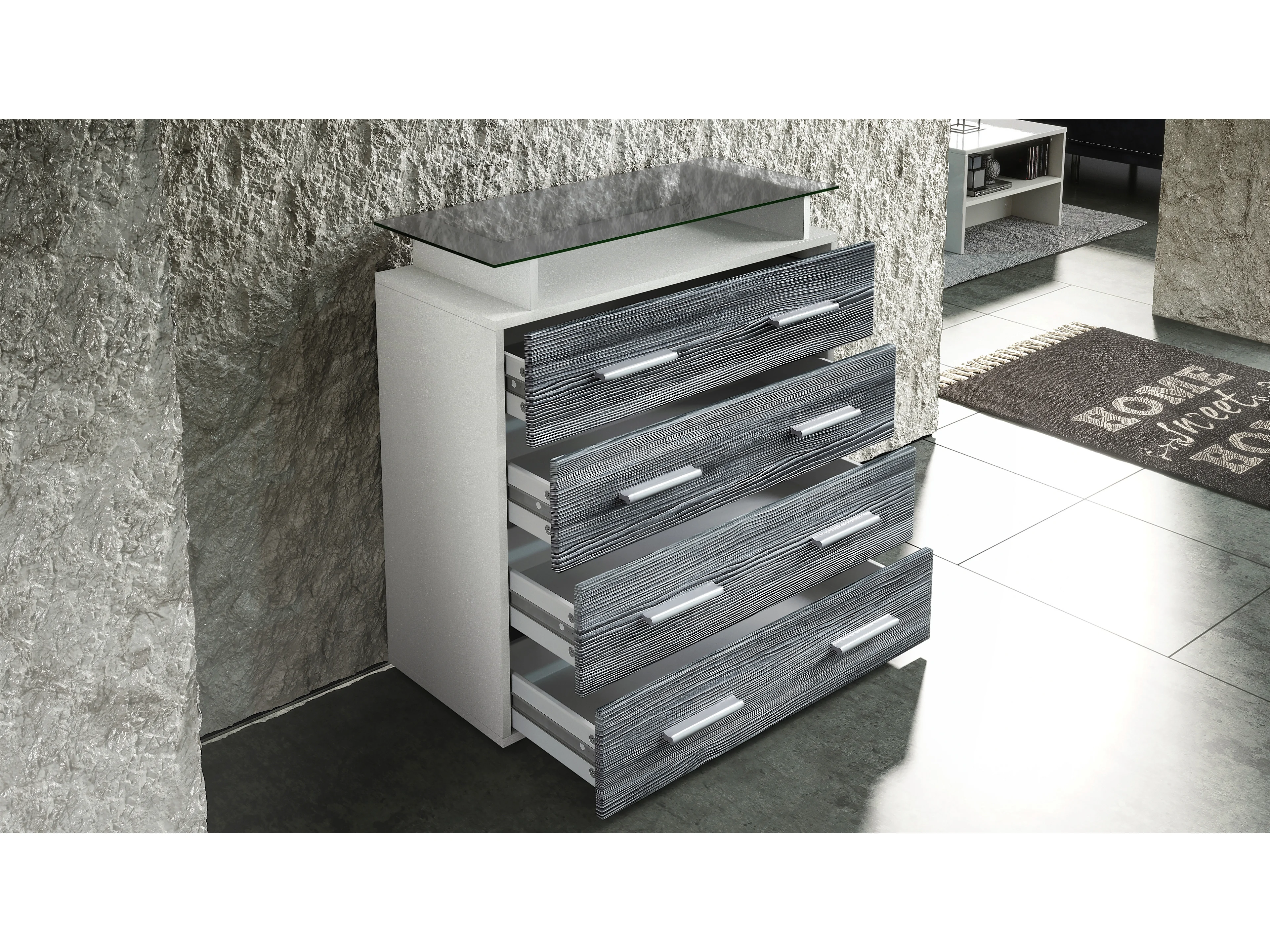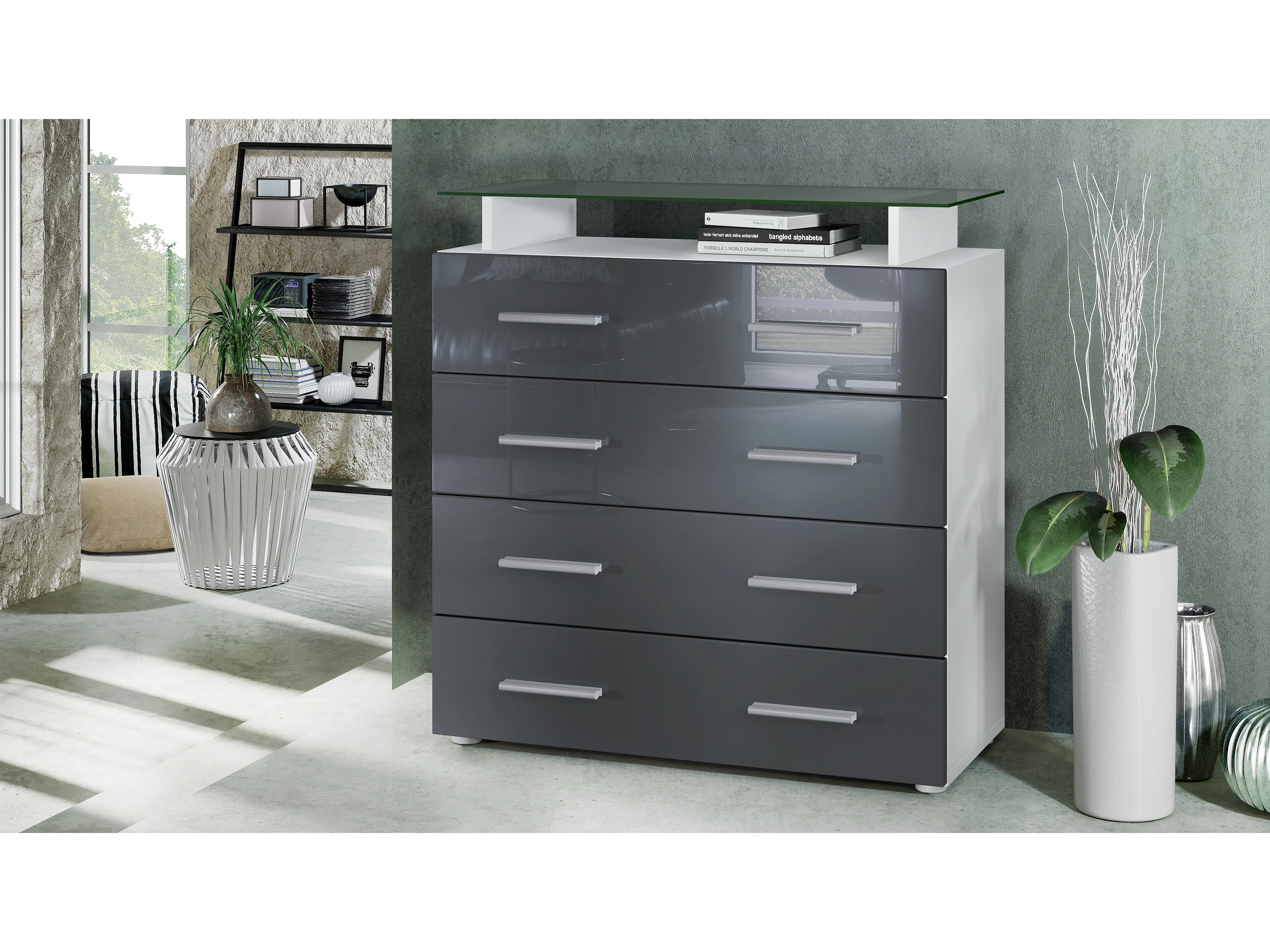 Buffet Pavos V2, Commode avec 4 tiroirs et mini-étagère en verre, blanc mat/gris haute brillance (76 x 81 x 35 cm)