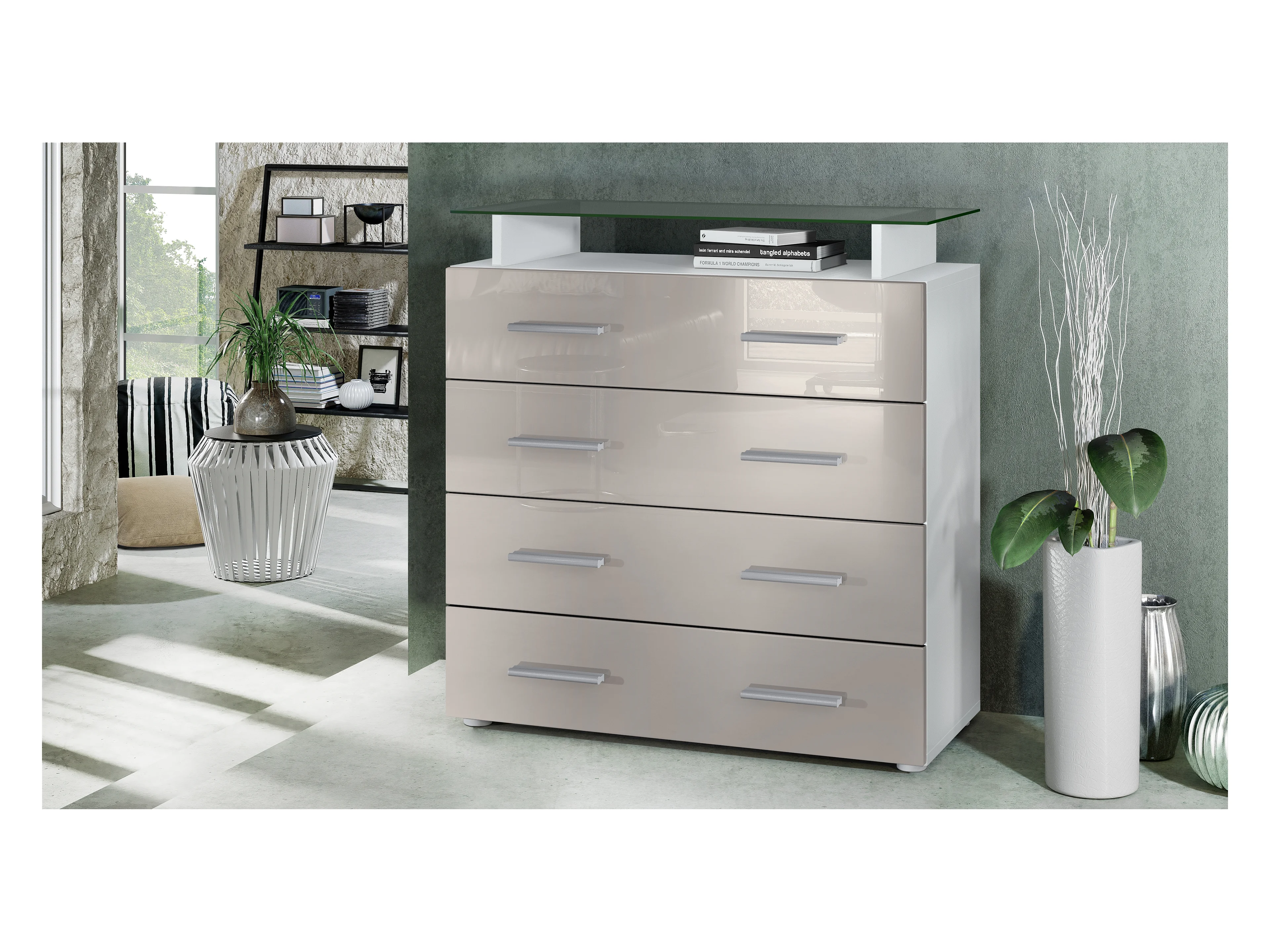 Buffet Pavos V2, Commode avec 4 tiroirs et mini-étagère en verre, blanc mat/gris sable haute brillance (76 x 81 x 35 cm)