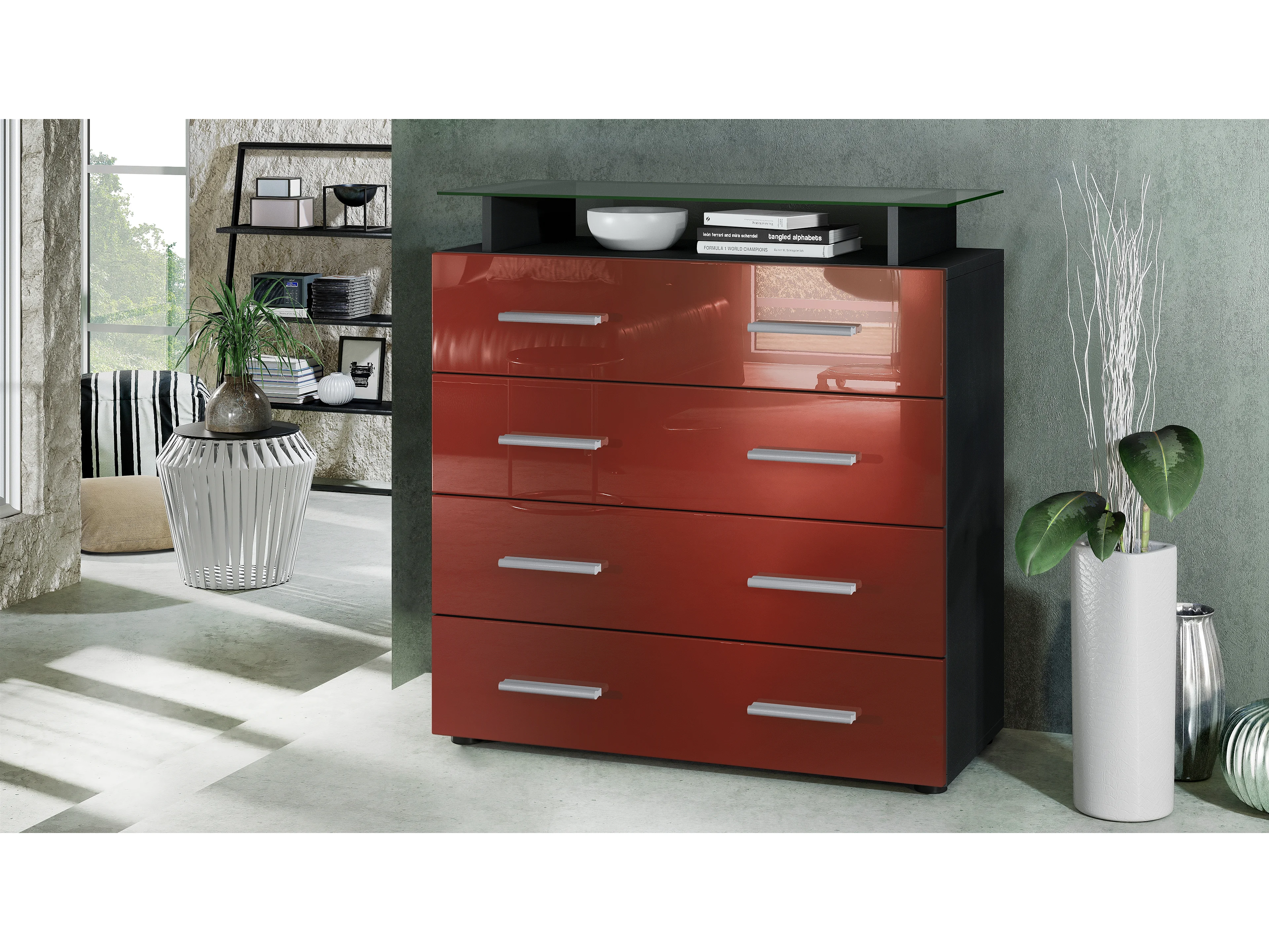 Buffet Pavos V2, Commode avec 4 tiroirs et mini-étagère en verre, noir mat/bordeaux haute brillance (76 x 81 x 35 cm)