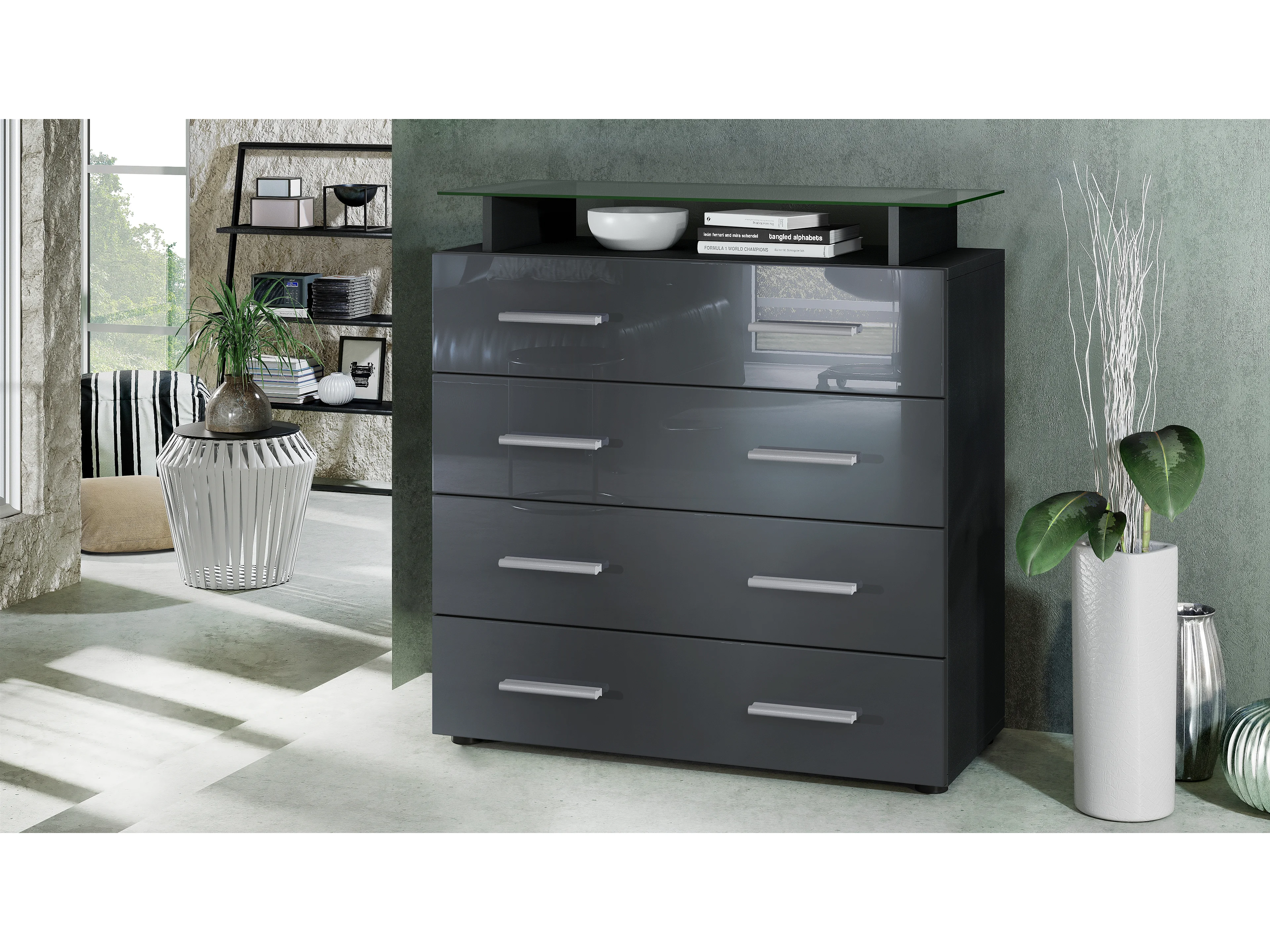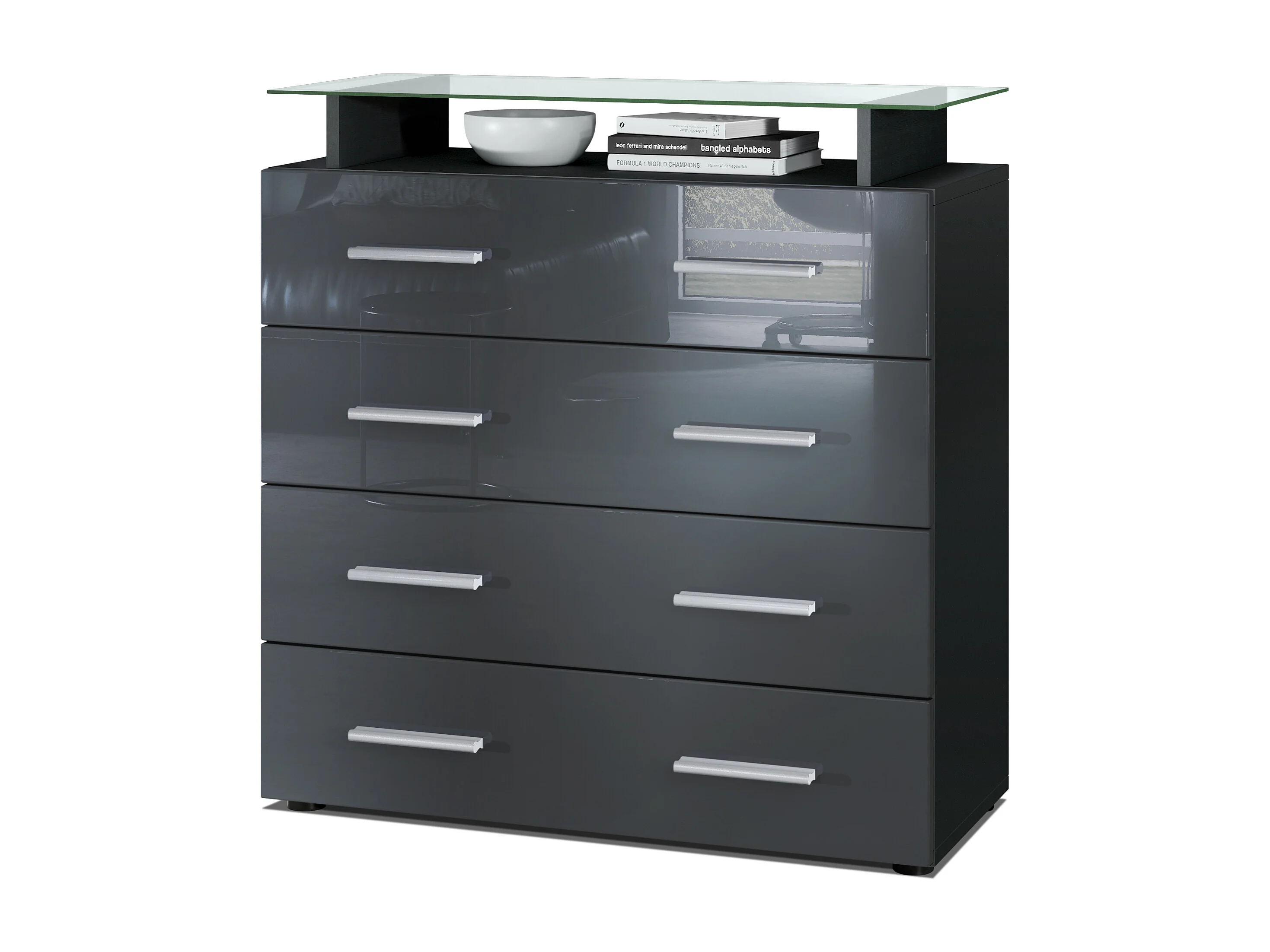 Buffet Pavos V2, Commode avec 4 tiroirs et mini-étagère en verre, noir mat/gris haute brillance (76 x 81 x 35 cm)