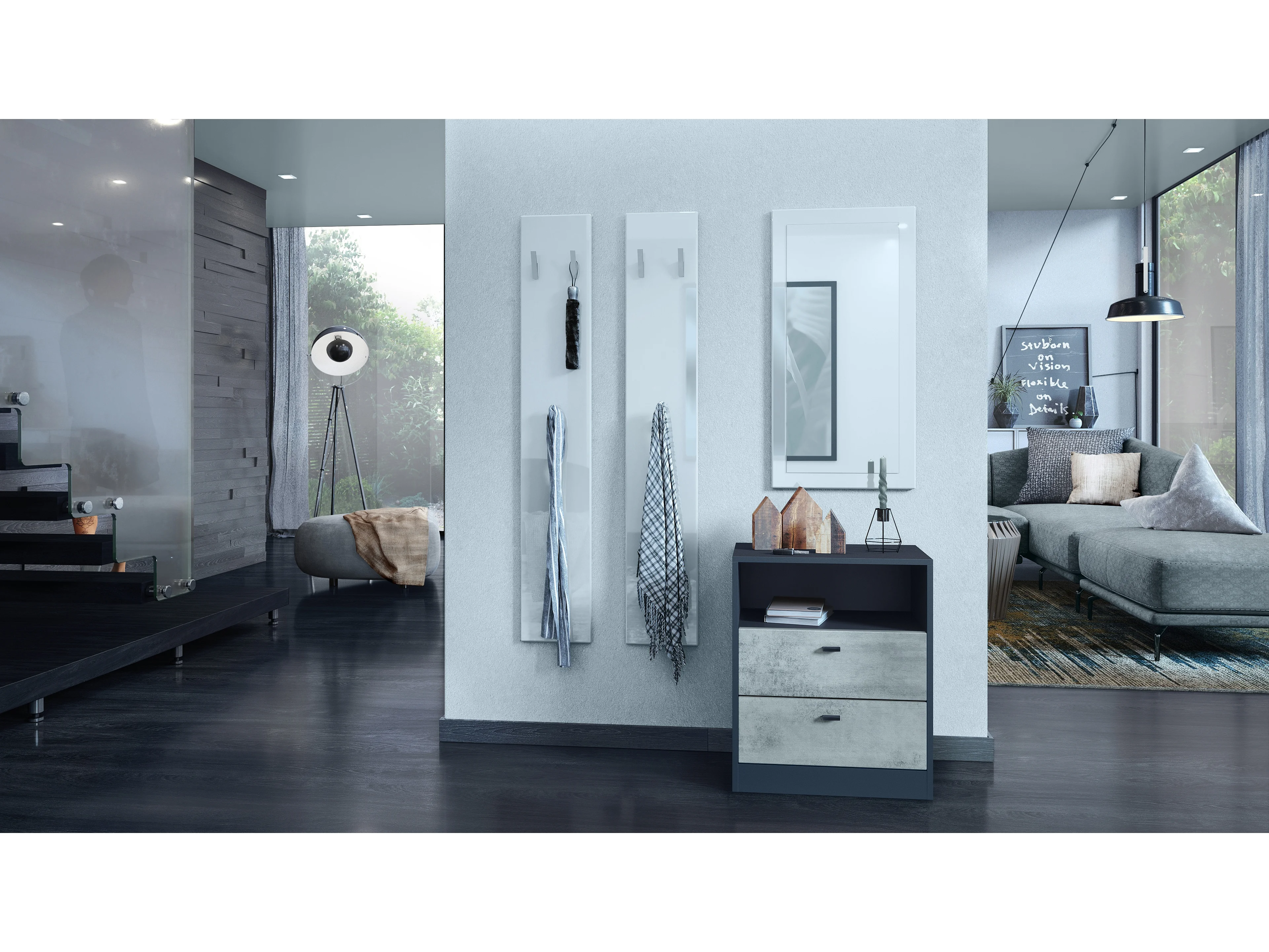 Buffet Armoire Metro, Corps en Blanc haute brillance / Façades en Blanc haute brillance avec une insertion en Aspect Béton Oxyde, incl. L'éclairage LED