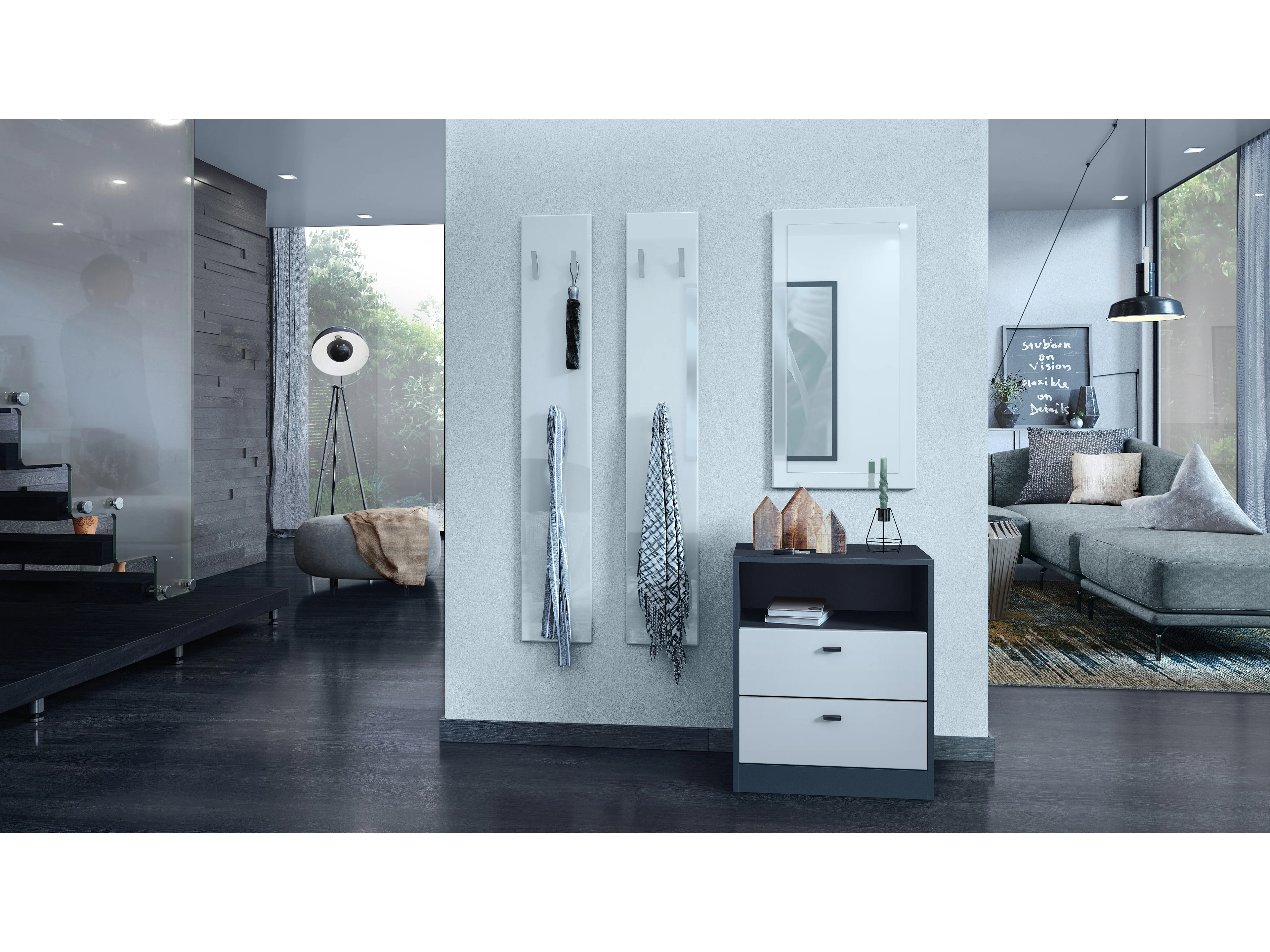 Commode Buffet Pino V2, avec 3 tiroirs & 1 compartiment ouvert, Anthracite mat /Blanc haute brillance sans LED (56 x 86,5 x 36 cm)