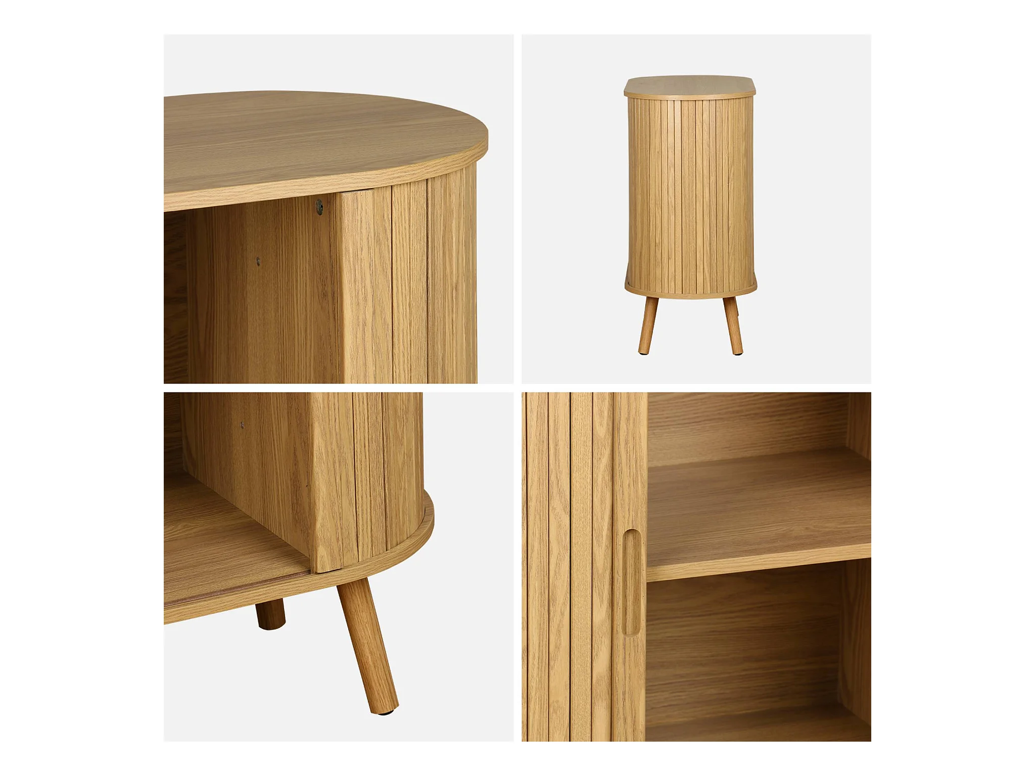 Buffet scandinave ovale 2 portes coulissantes. 4 compartiments. 3 tiroirs. décor bois rainuré. teinte naturelle. L 150 x P 40 x H 79cm