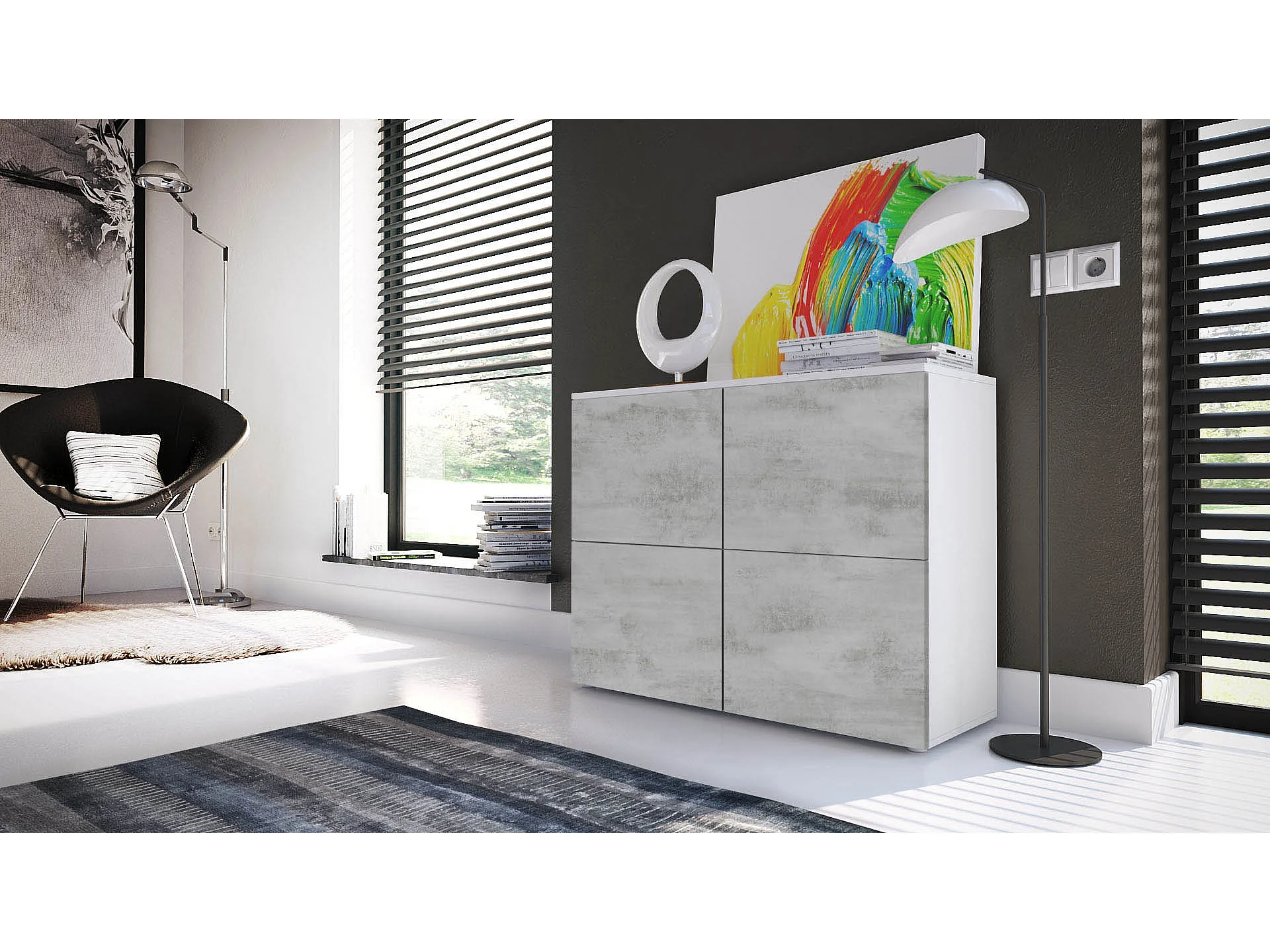 Buffet Rova, Commode avec 4 portes, Blanc mat/Aspect Béton Oxyde (92 x 72 x 35 cm)