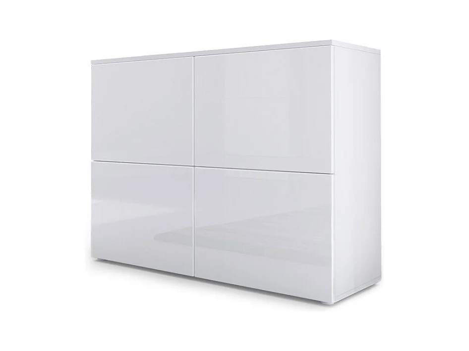 Buffet Rova, Commode avec 4 portes, Blanc mat/Blanc haute brillance (92 x 72 x 35 cm)