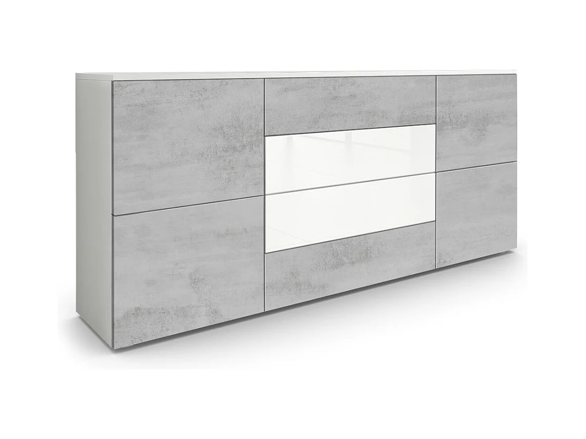 Buffet Rova, Commode avec 4 portes et 4 tiroirs, Blanc mat/Aspect Béton Oxyde (166 x 72 x 35 cm)