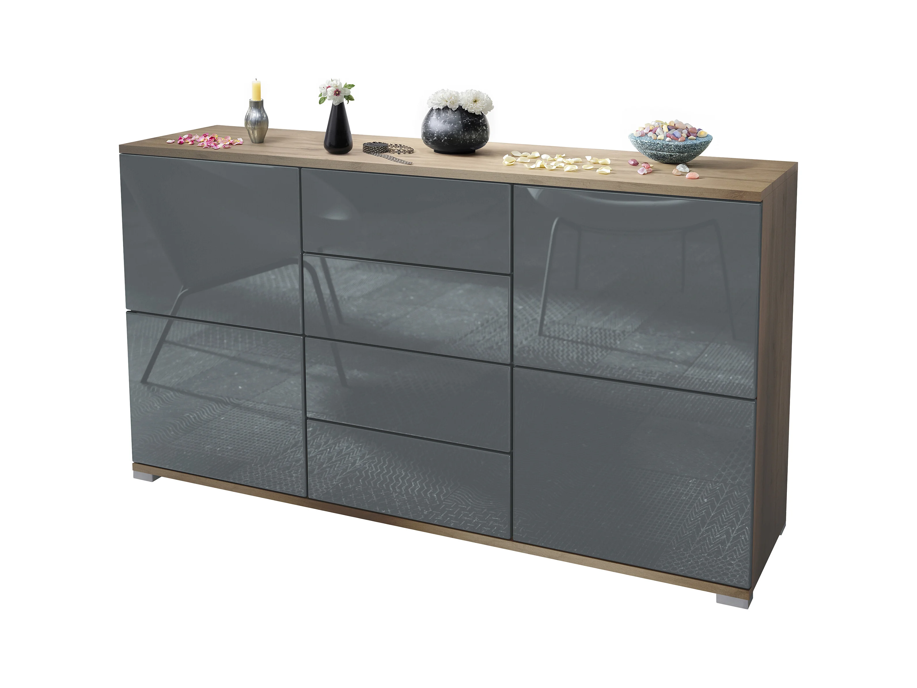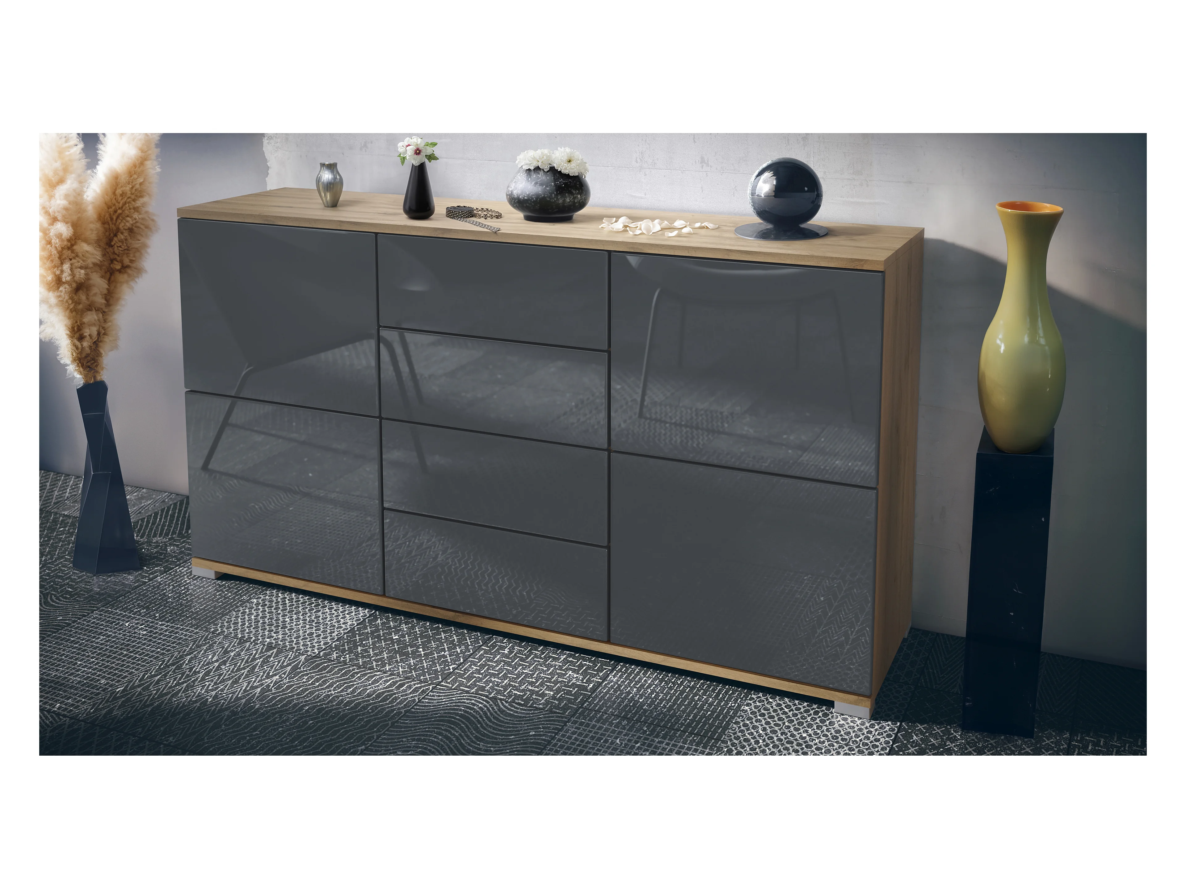 Buffet Rova V1 – Meuble avec 4 Portes et 4 Tiroirs, Chêne Evoke/gris haute brillance (138,5 x 75,5 x 35)