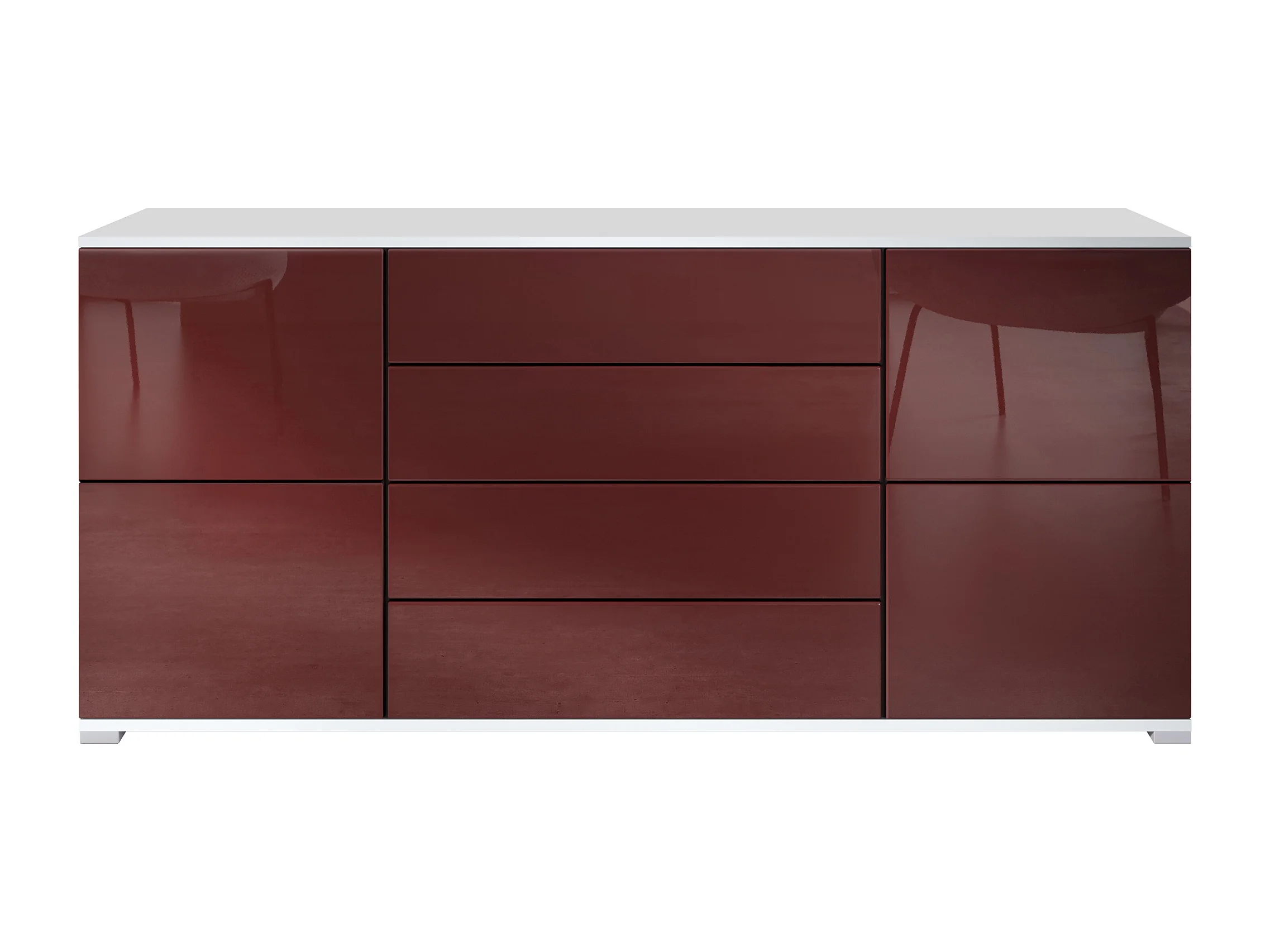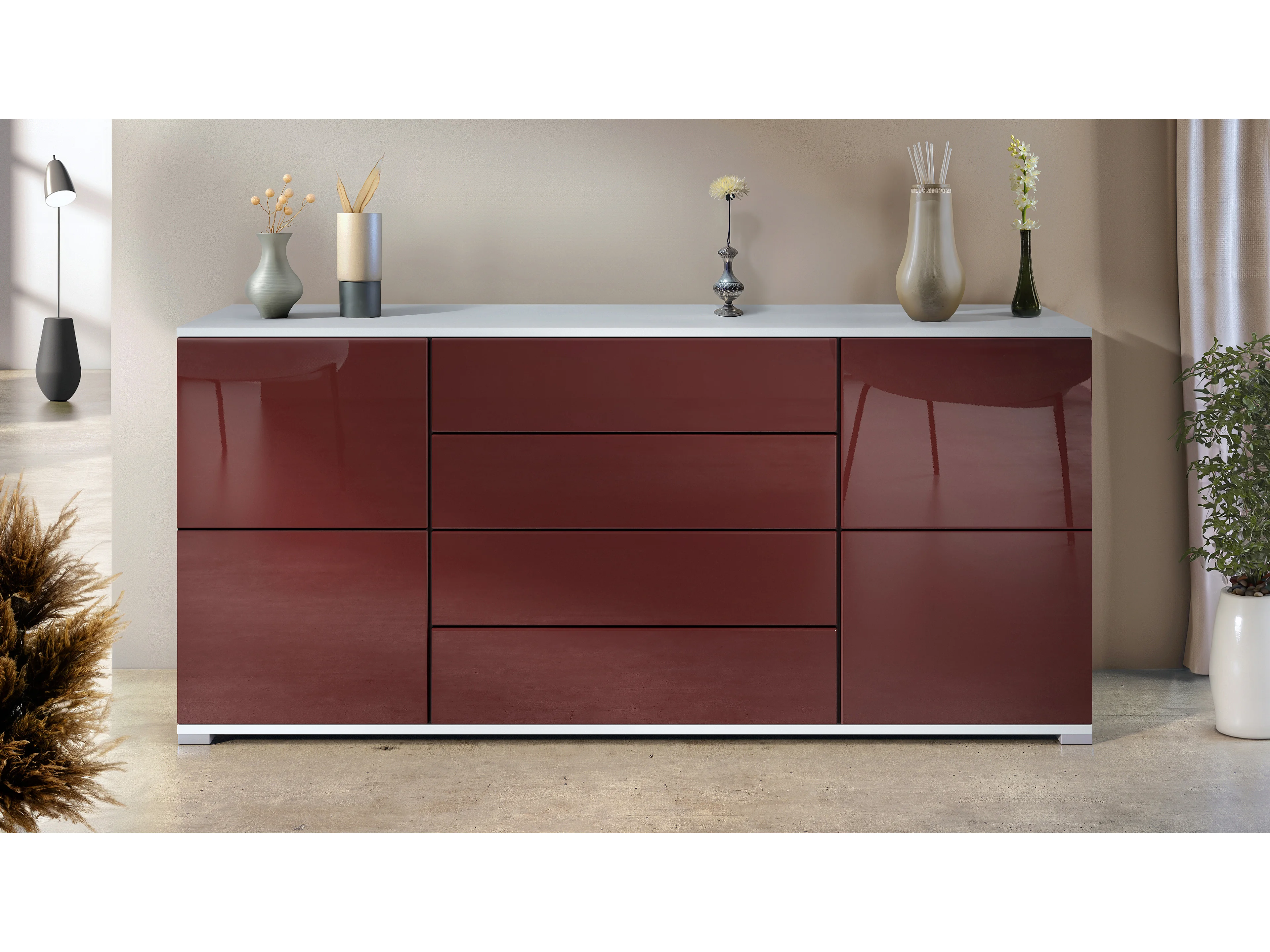 Buffet Rova V2 – Meuble avec 4 Portes et 4 Tiroirs, blanc mat/bordeaux haute brillance (166,5 x 75,5 x 35)