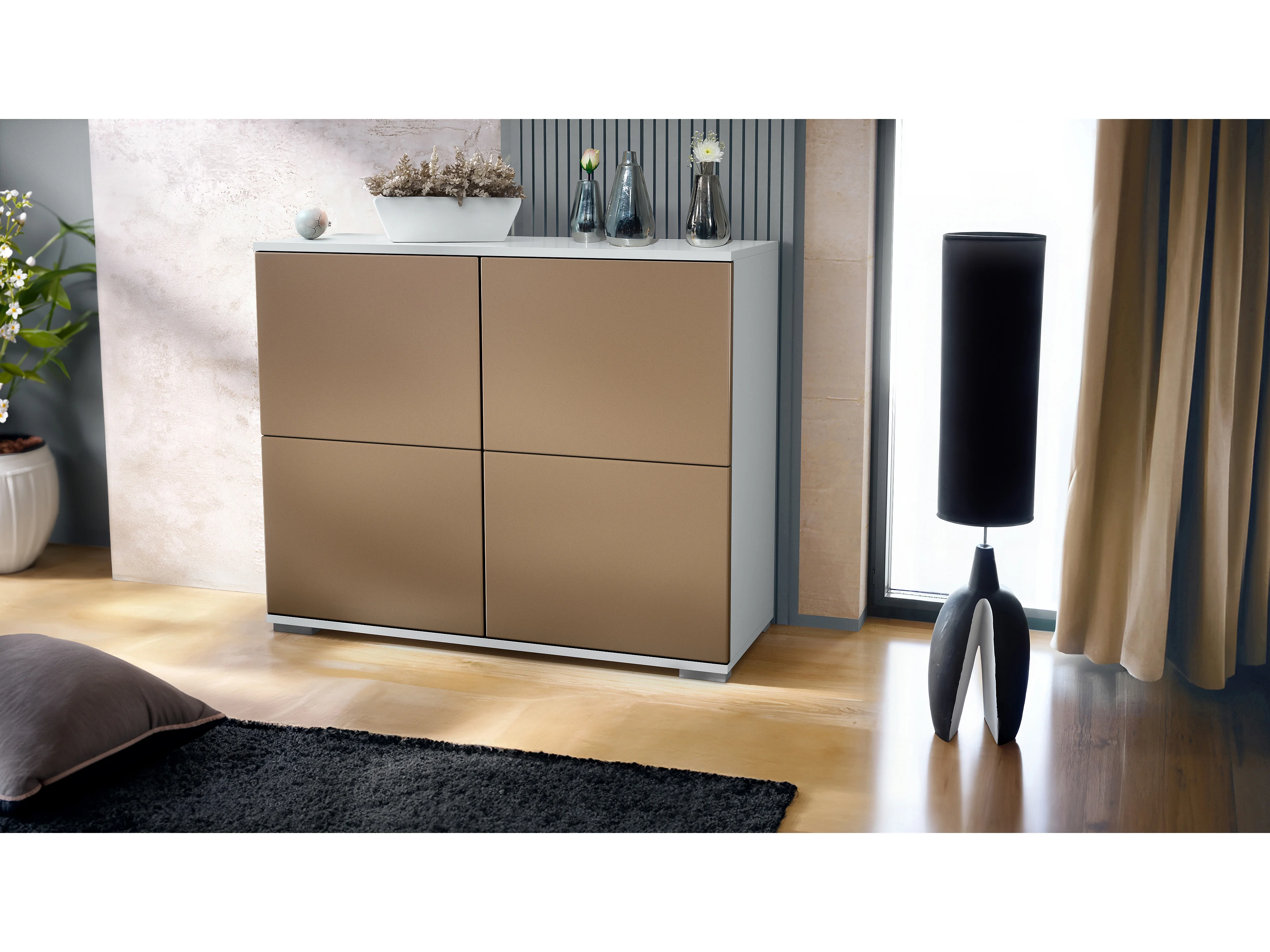 Buffet Rova V3 – Meuble de cuisine moderne avec 4 portes Push-to-Open blanc mat / aspect bronzé (92,5 x 75.5 x 35)