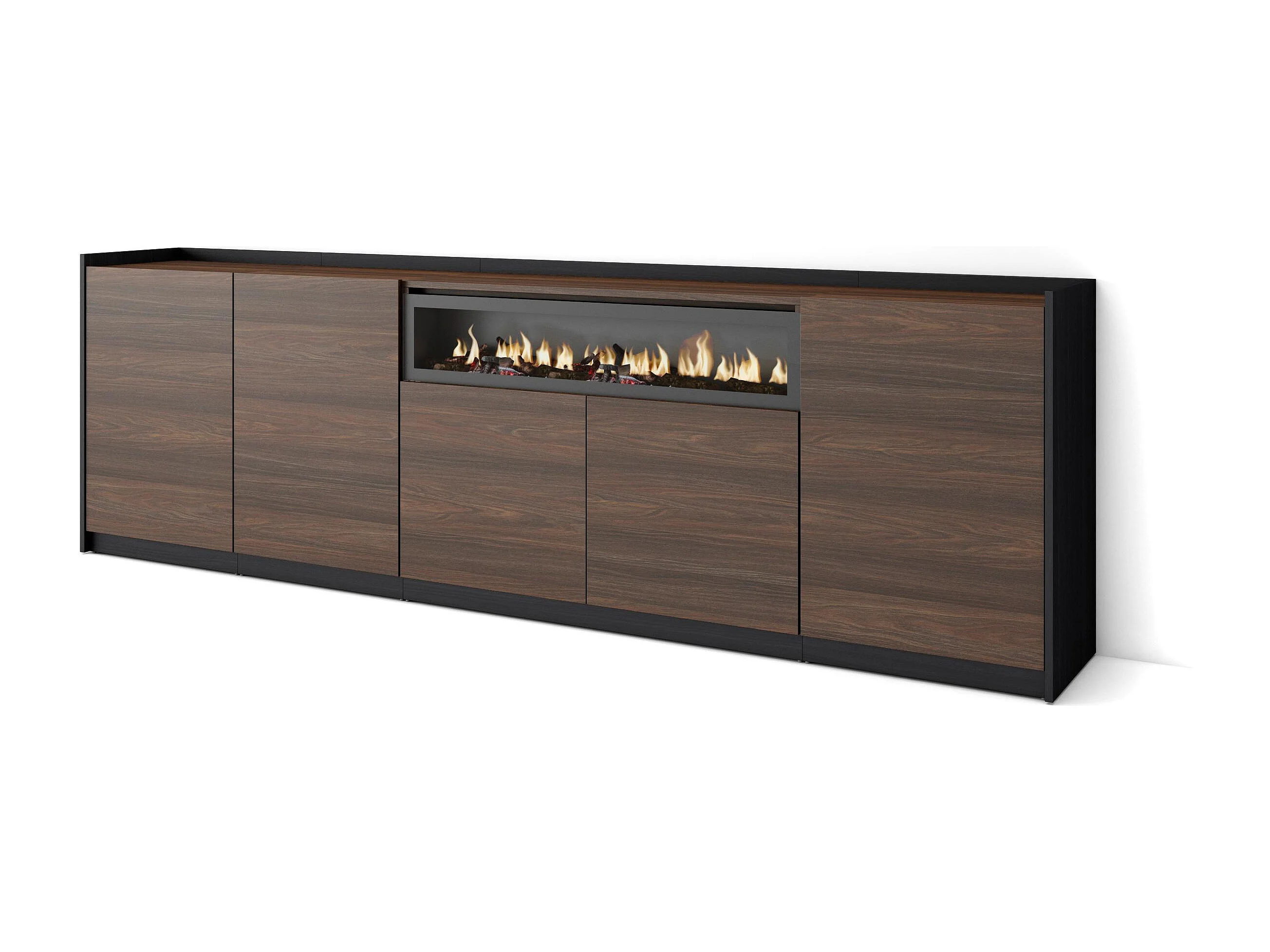 Buffet salon et cuisine, 260x80x37 cm, 5 Portes, Cheminée électrique, Chêne foncé et Noir