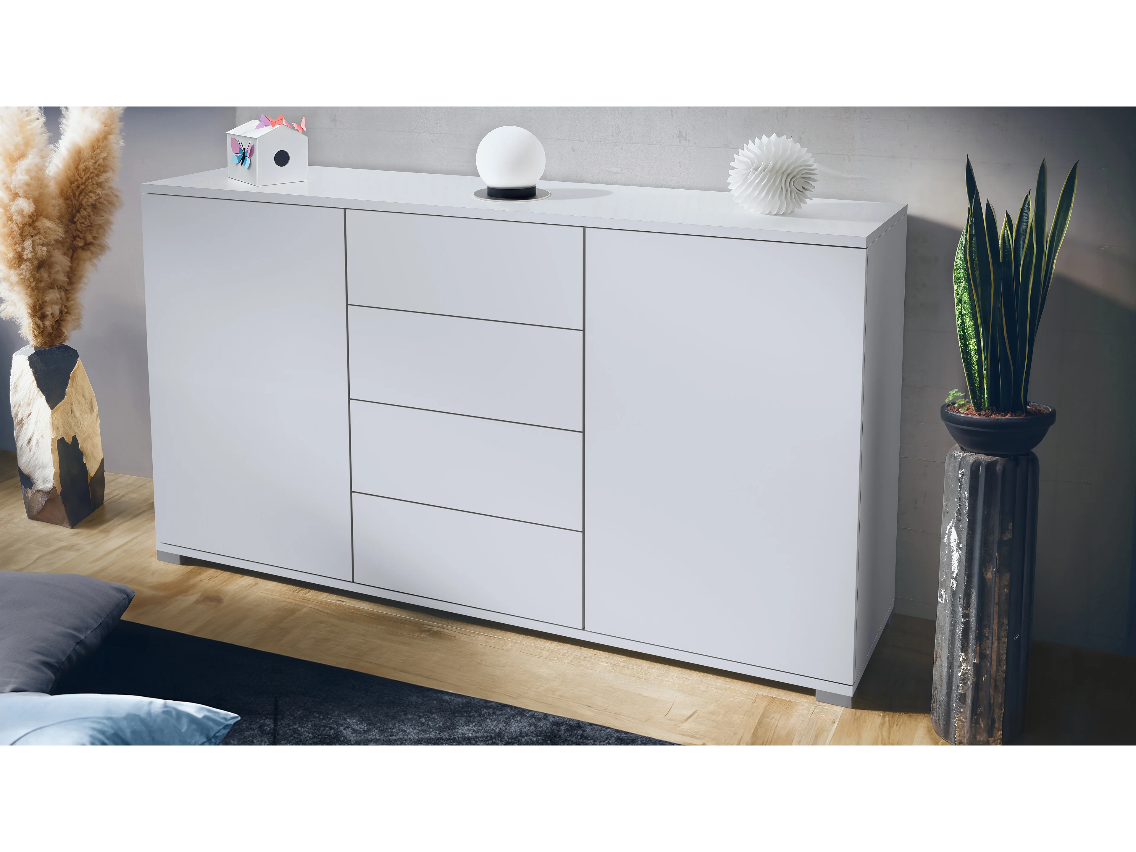 Buffet Santo V1, Enfilade avec 2 portes et 4 tiroirs, blanc mat / blanc mat (138,5 x 75,5 x 35 cm)