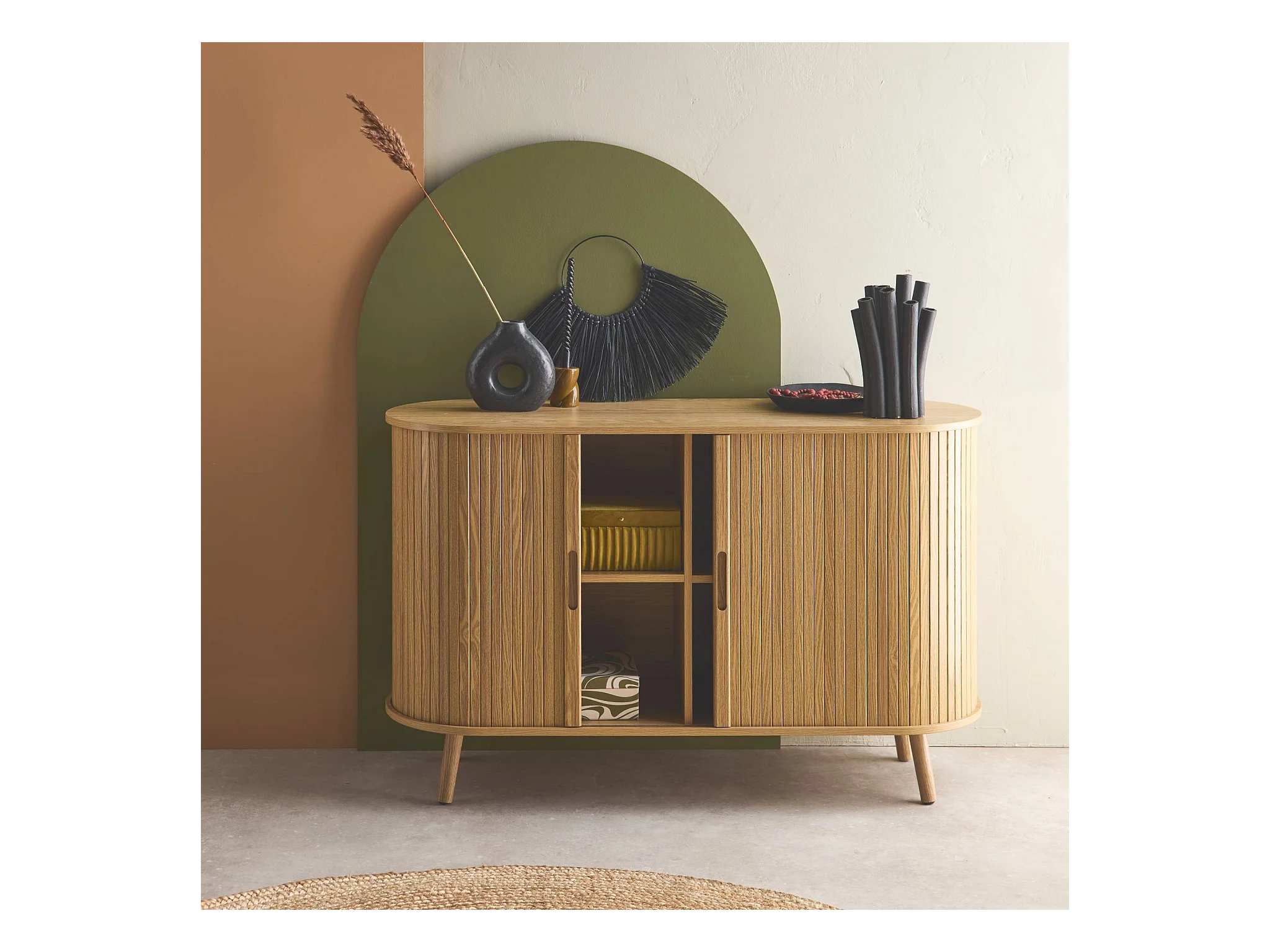 Buffet scandinave 2 portes coulissantes. 4 compartiments. décor bois rainuré. couleur naturelle. buffet bas. L 120 x P 40 x H 75cm