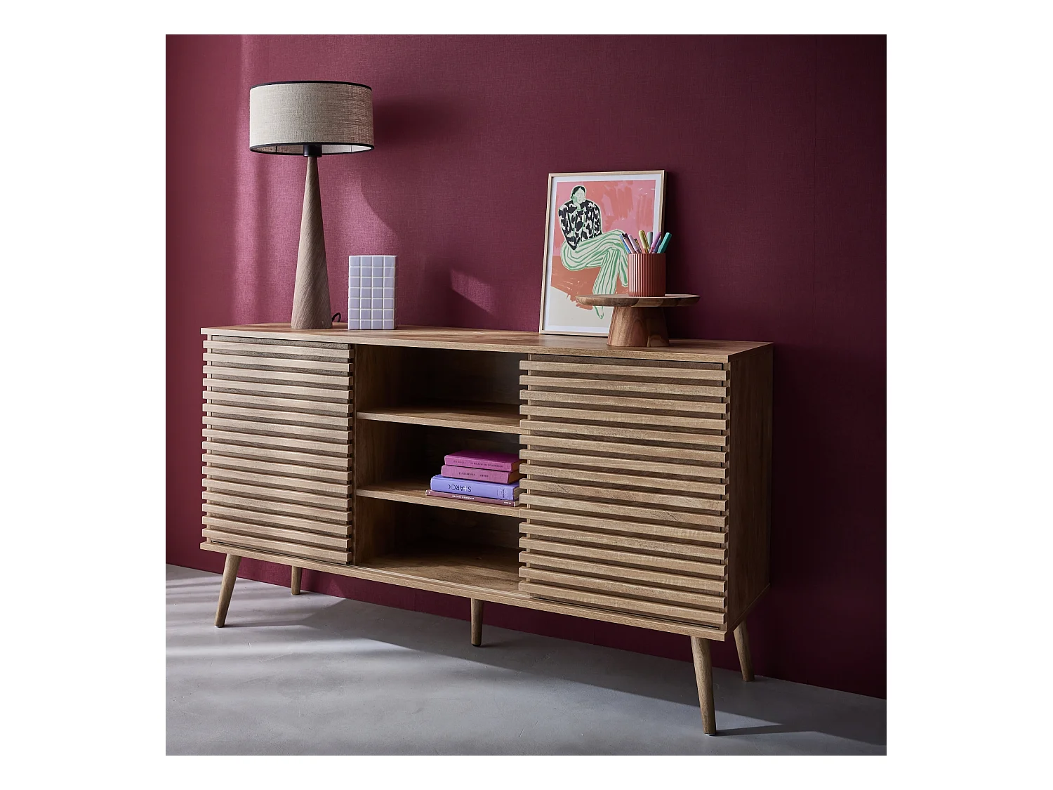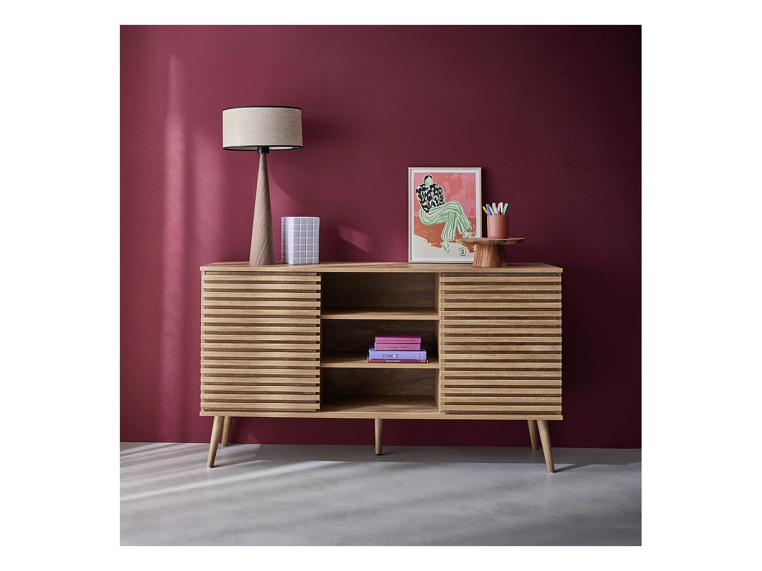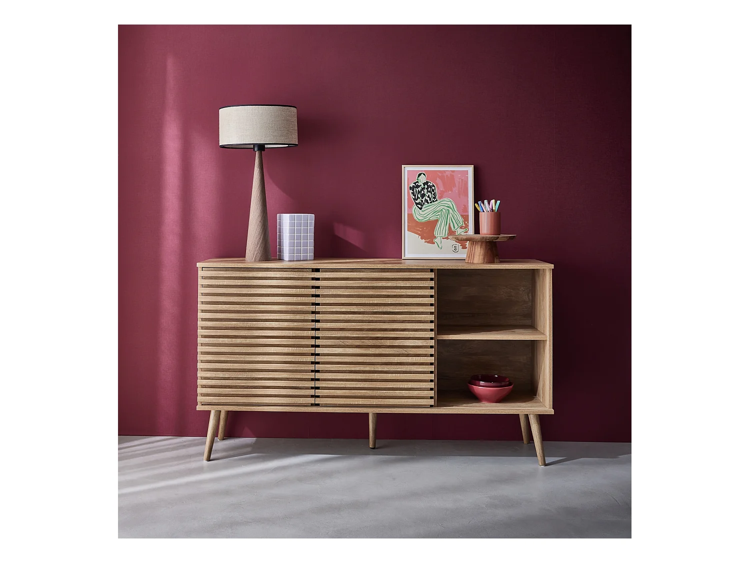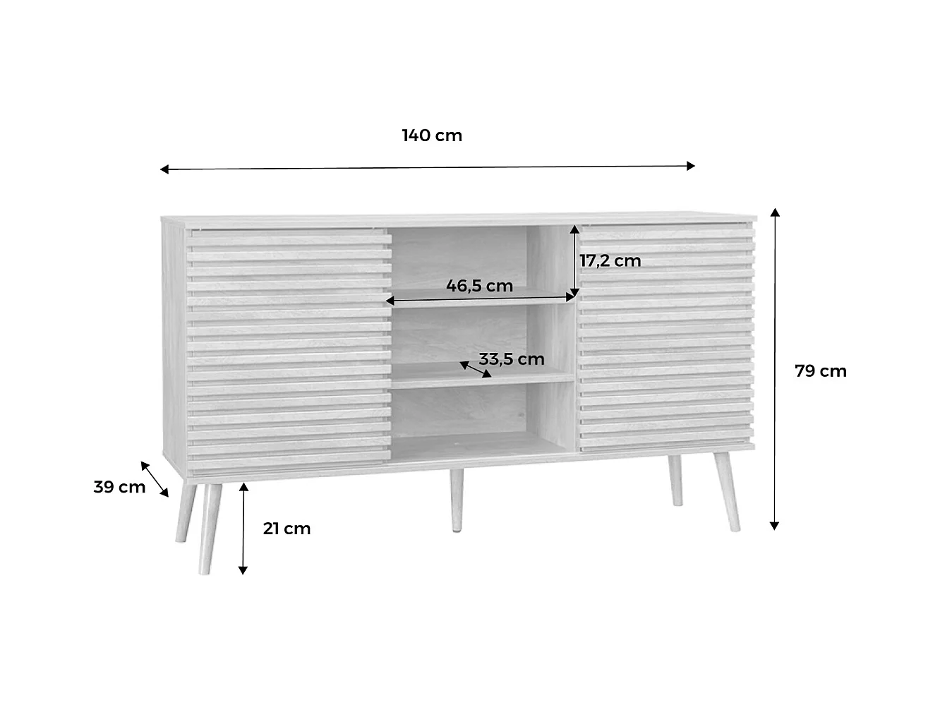 Buffet scandinave décor bois avec 2 portes coulissantes rainurées et 4 étagères. buffet bas. L 140