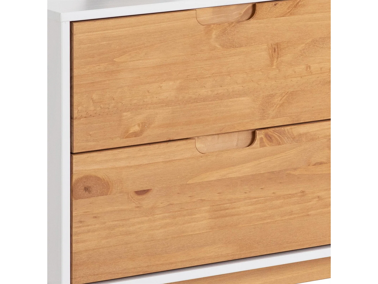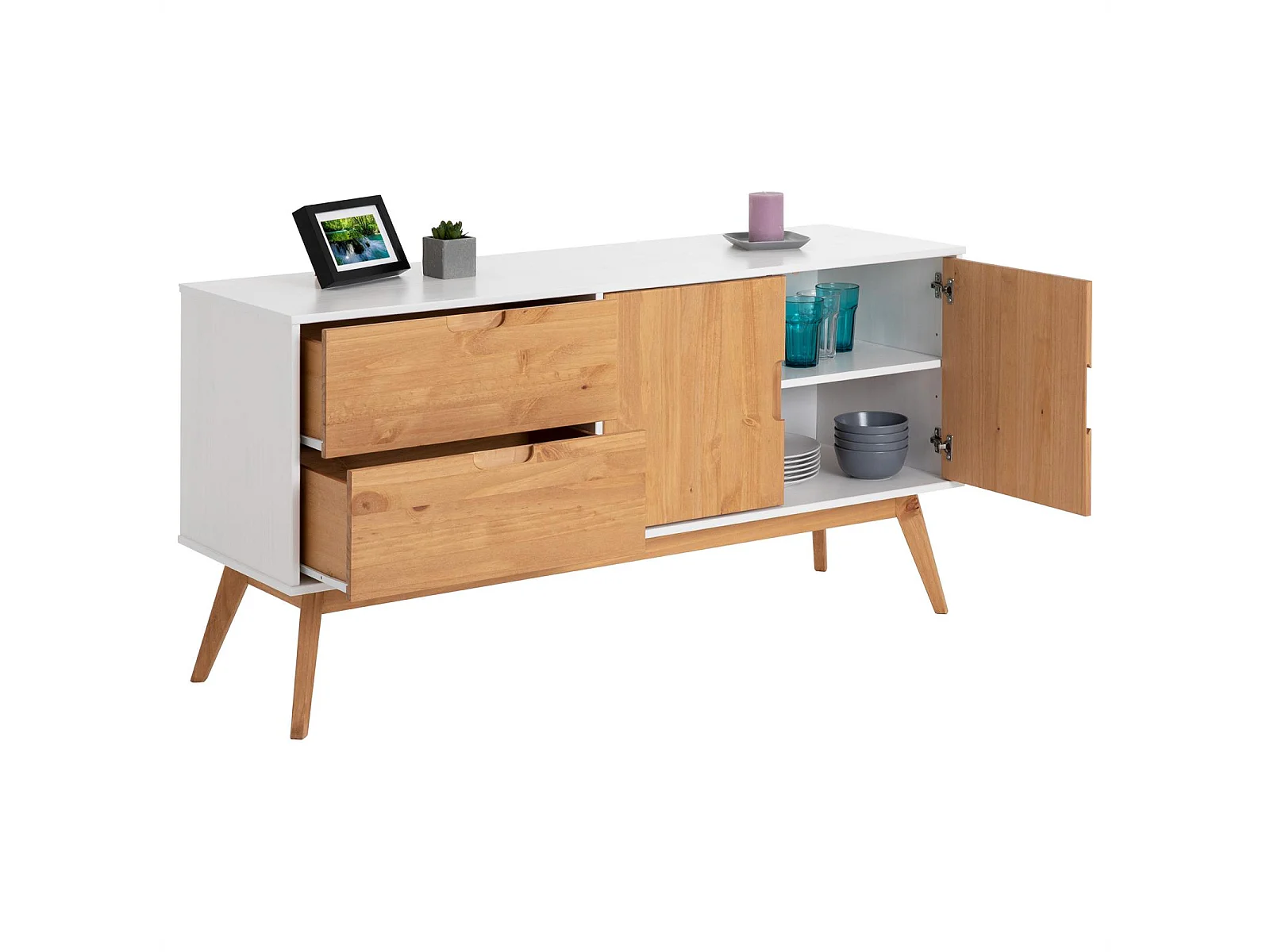 Buffet TIVOLI design vintage scandinave nordique commode bahut vaisselier 2 tiroirs 2 portes, pin massif finition blanc/bois teinté