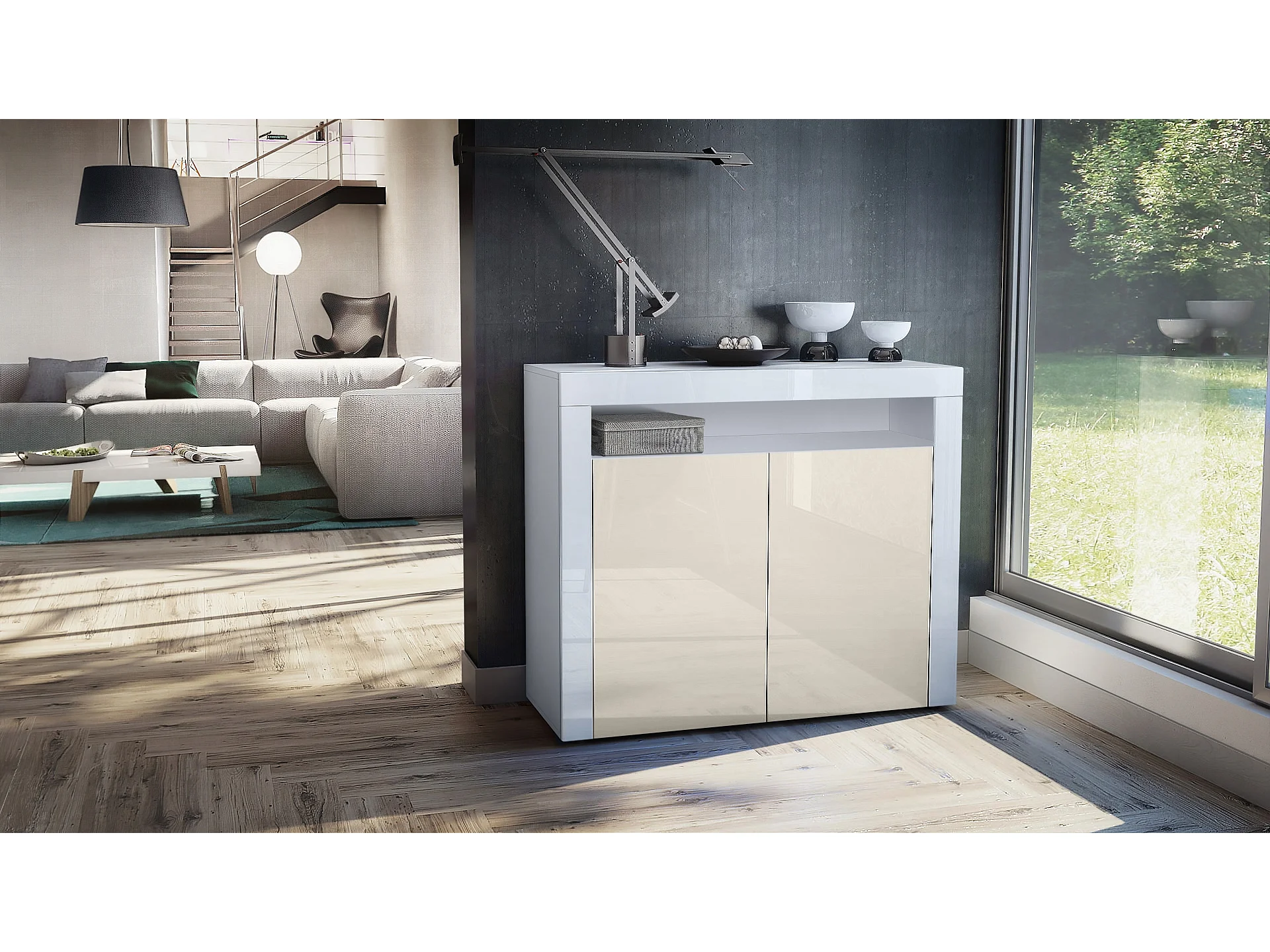 Buffet Valencia, Commode avec 2 portes et 1 compartiment ouvert, Blanc mat/crème haute brillance/blanc haute brillance (108 x 92 x 40 cm)