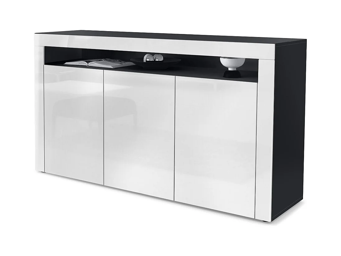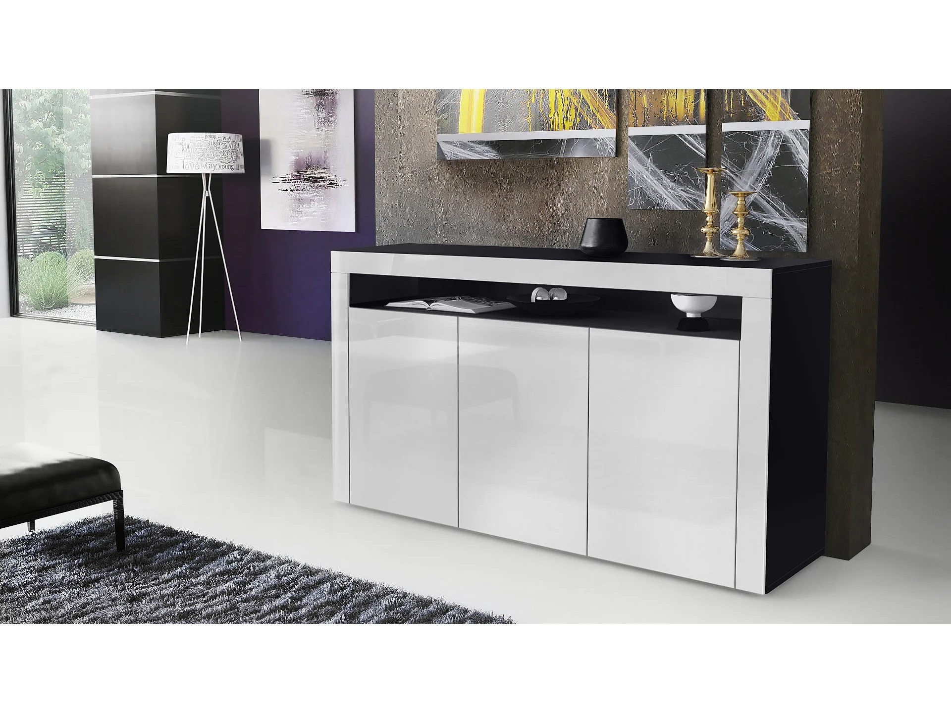 Buffet Valencia, Commode avec 3 portes et 1 compartiment ouvert, Noir mat/blanc haute brillance/blanc haute brillance (155 x 92 x 40 cm)