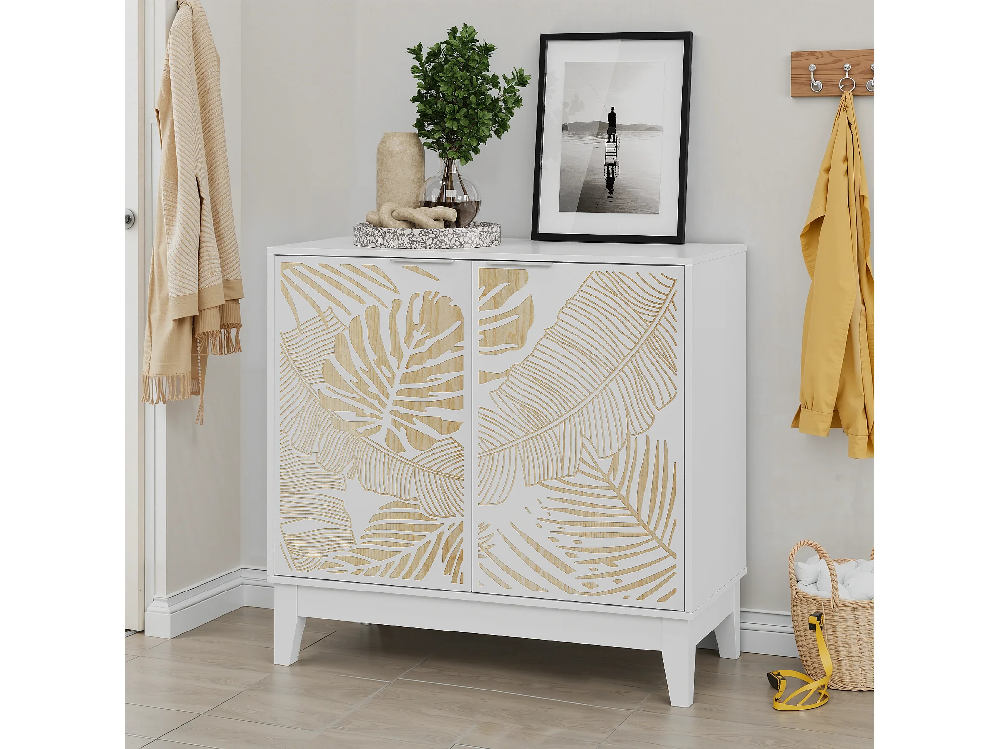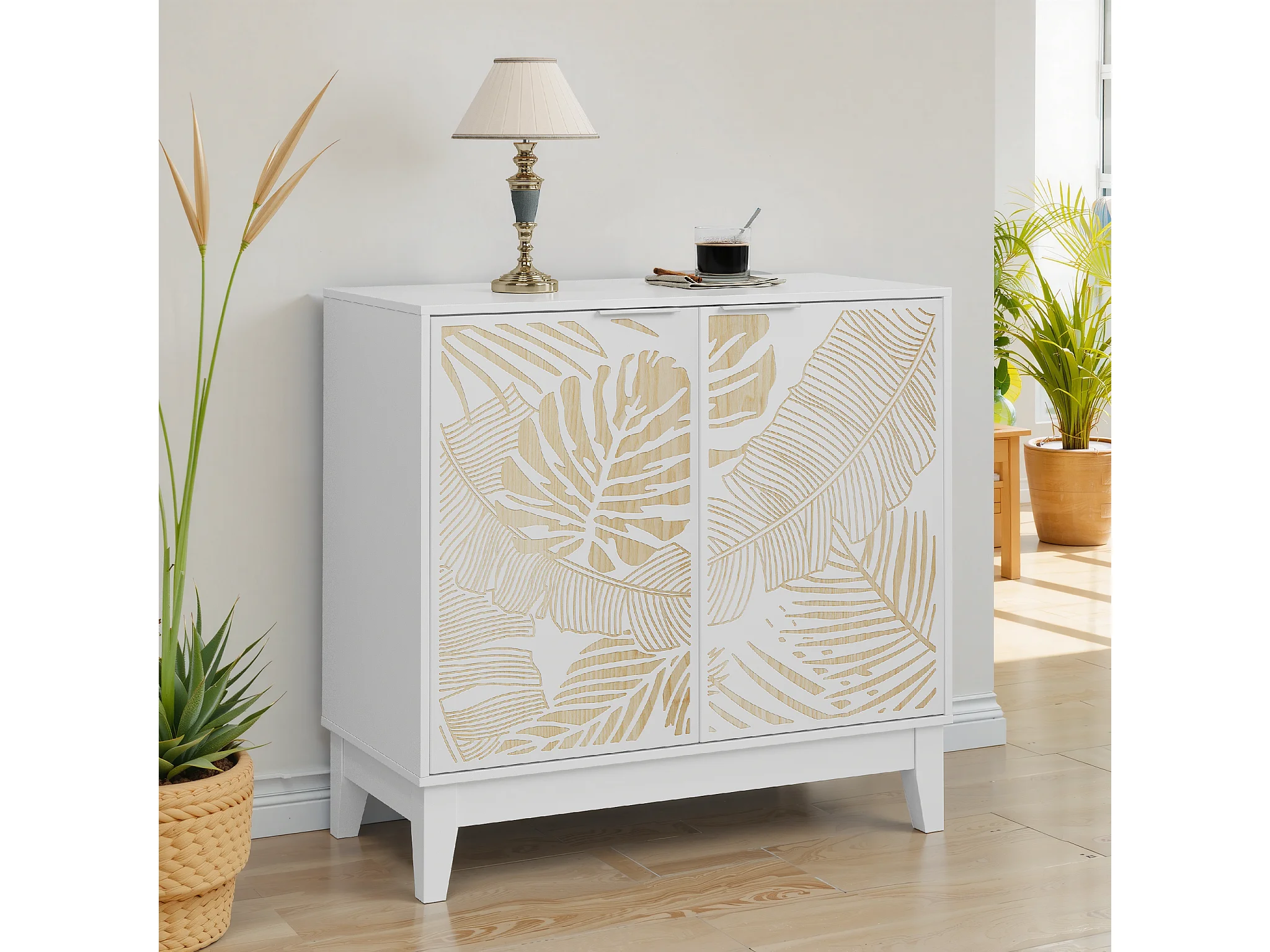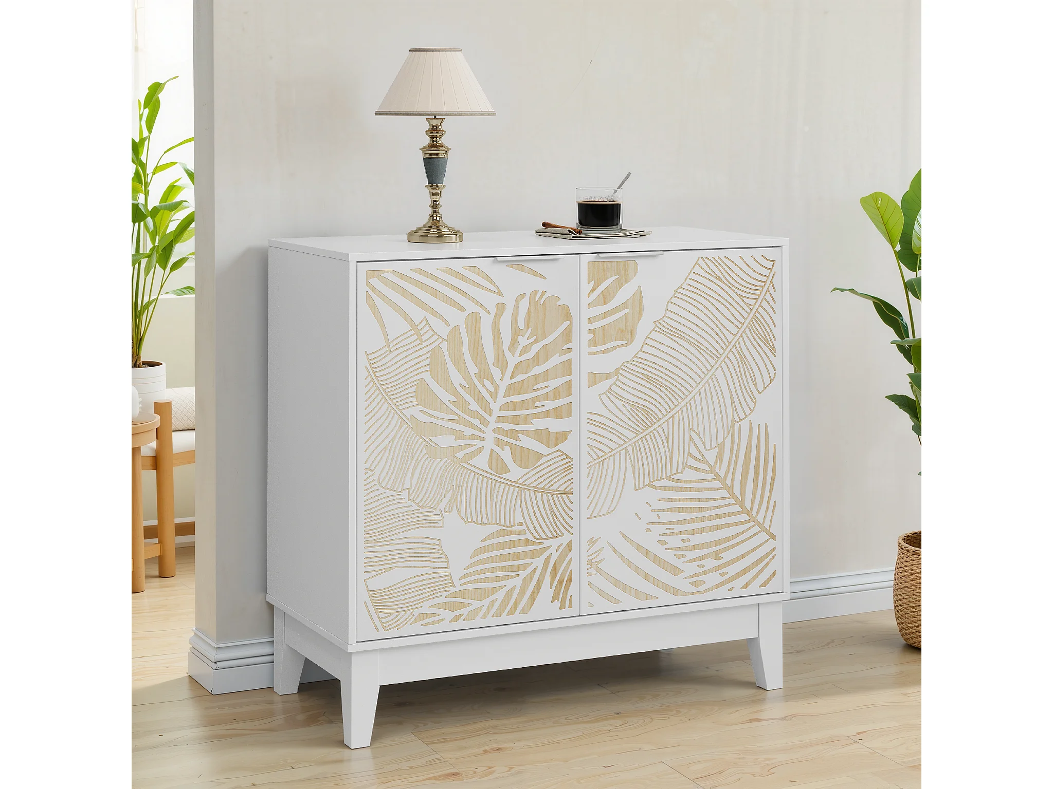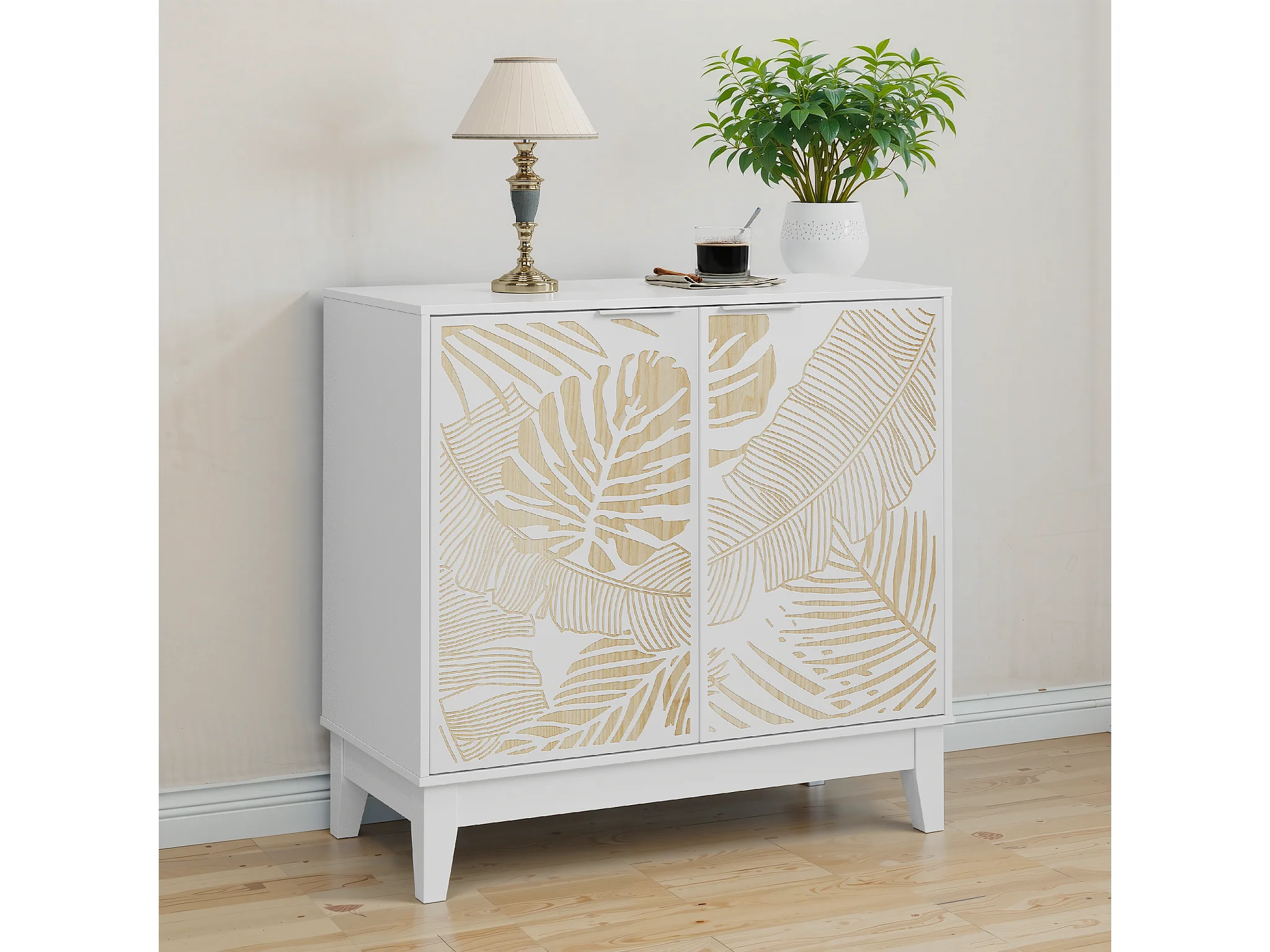 Buffet vintage avec portes décoratives en feuille, MDF, blanc (80x38x76 cm)