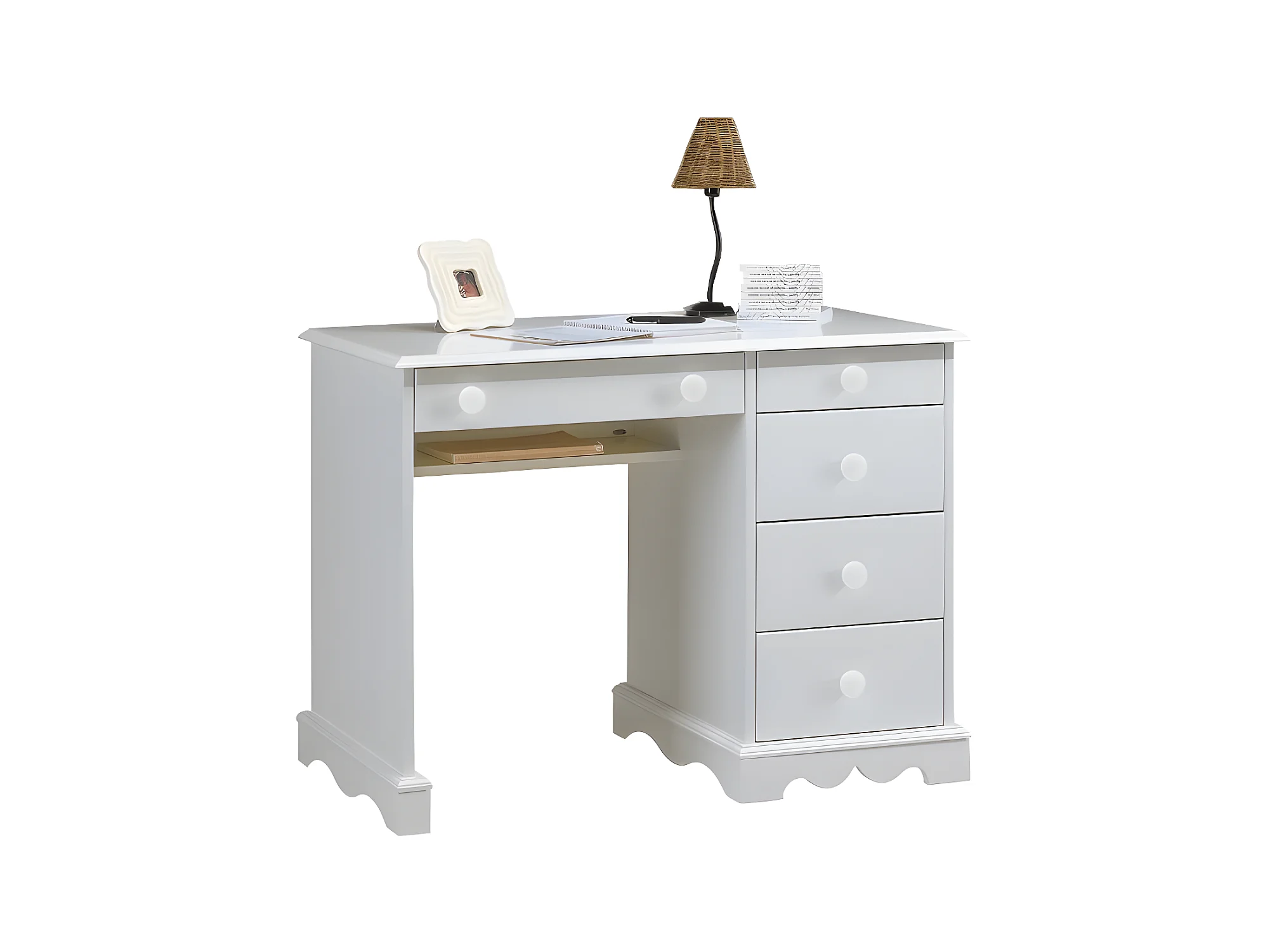 Bureau 1 Caisson 5 Tiroirs Blanc 1 Etagère Style Anglais L 100 H 74.7 P 58.3 cm