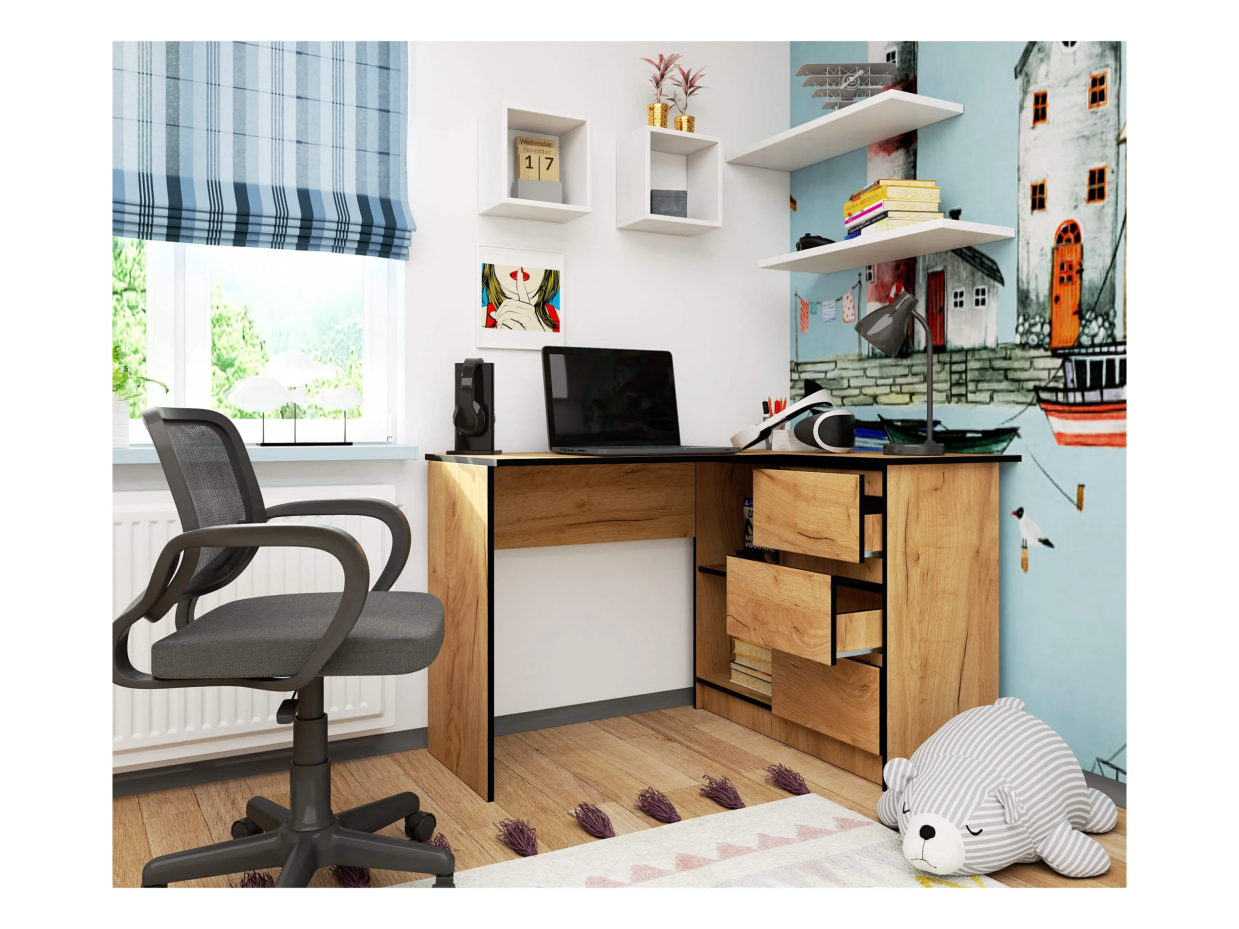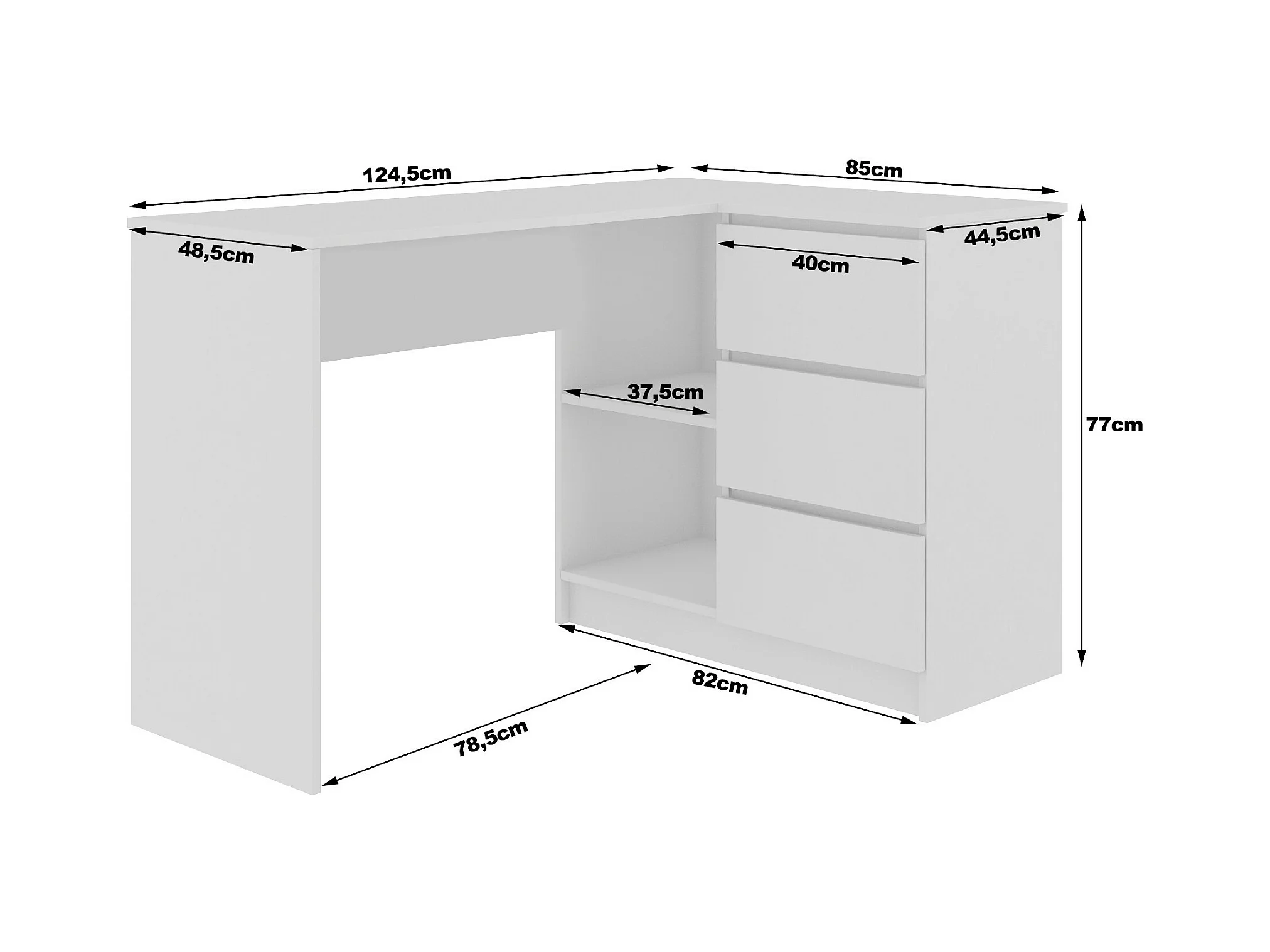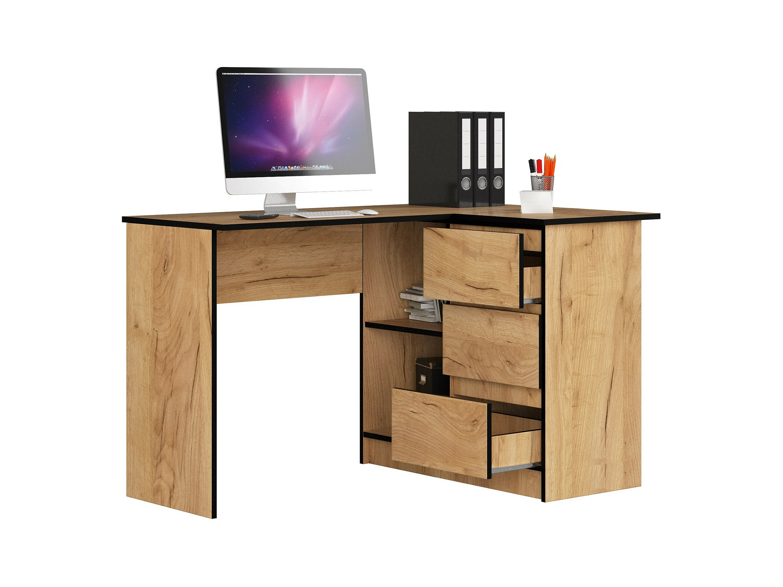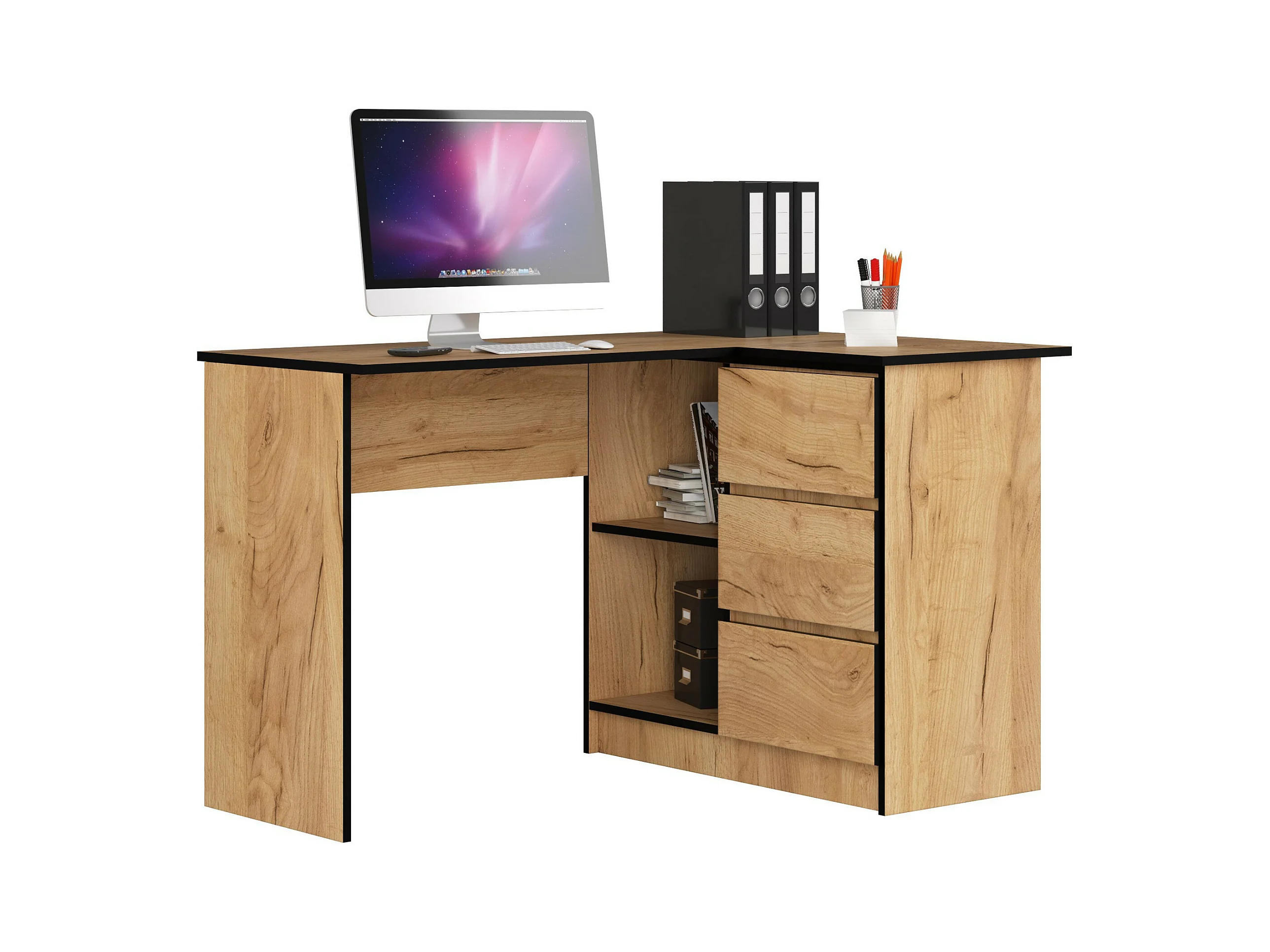 Bureau AKORD d'angle droit B16 Chêne Craft 124 cm 3 tiroirs façade Chêne Craft 2 étagères 124x85x77 cm
