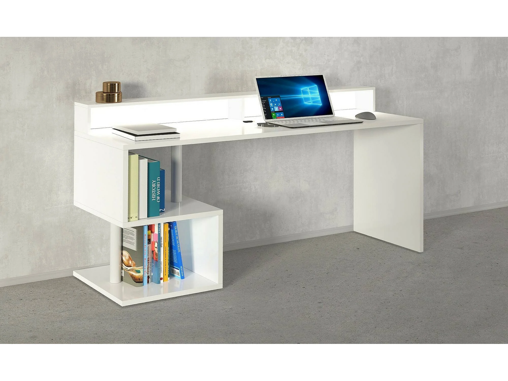 Bureau Alban, Bureau linéaire avec étagères de rangement avec lampes LED, Bureau polyvalent avec plateau, 180x60h93 cm, Blanc