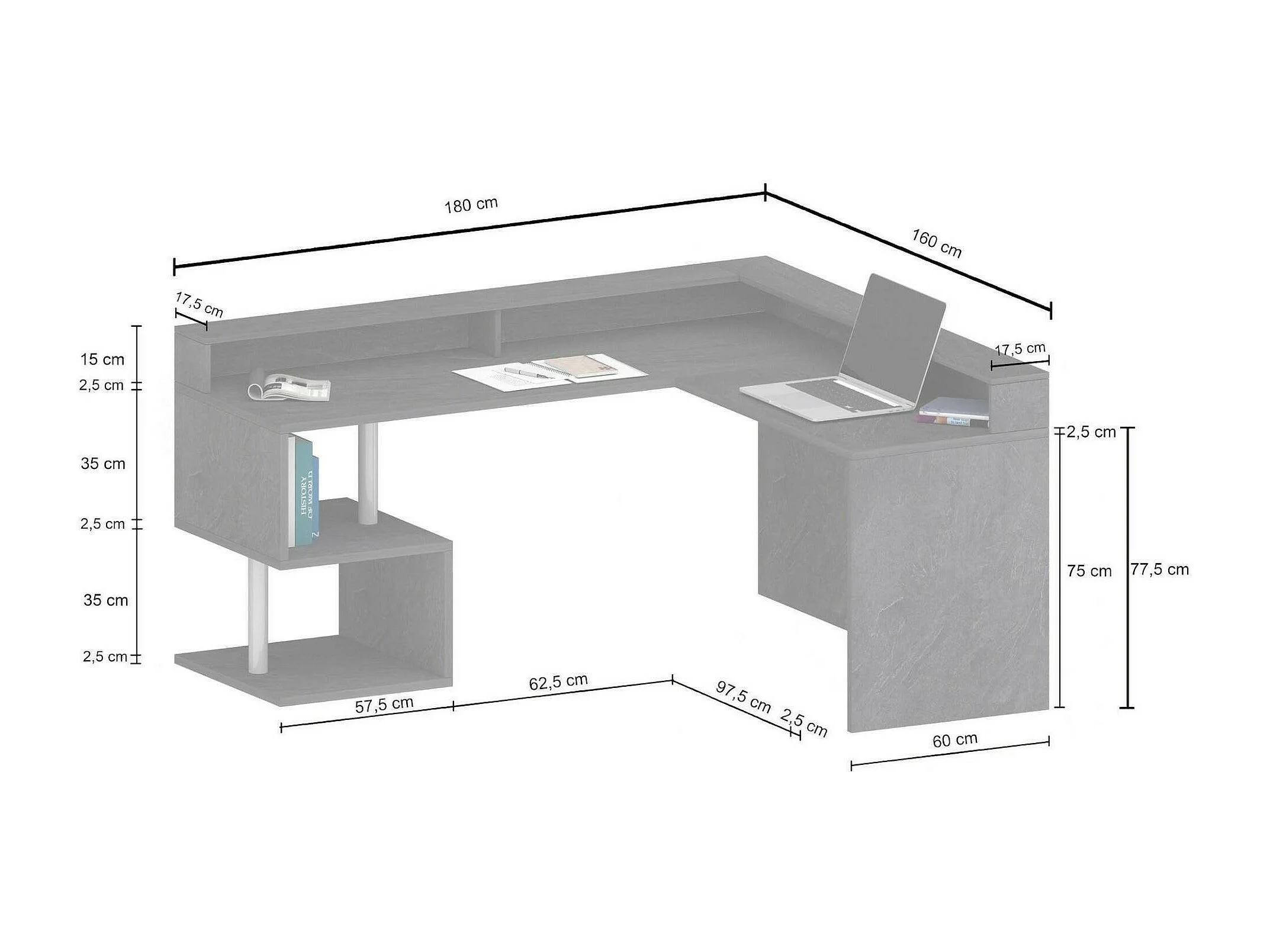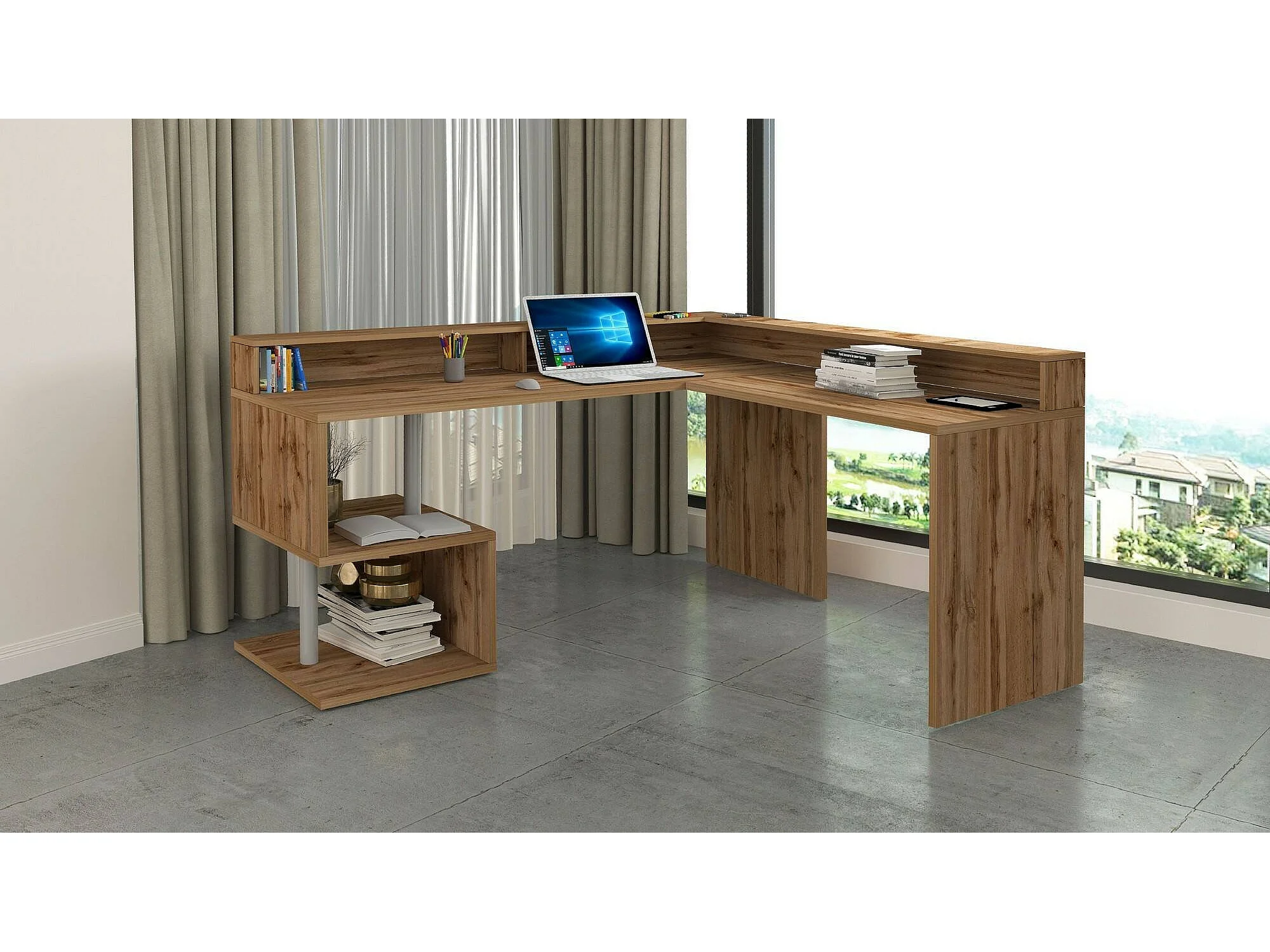 Bureau Albert, Bureau d'angle avec étagères de rangement avec lampes LED, Bureau polyvalent avec plateau, 180x60h93 cm, Chêne