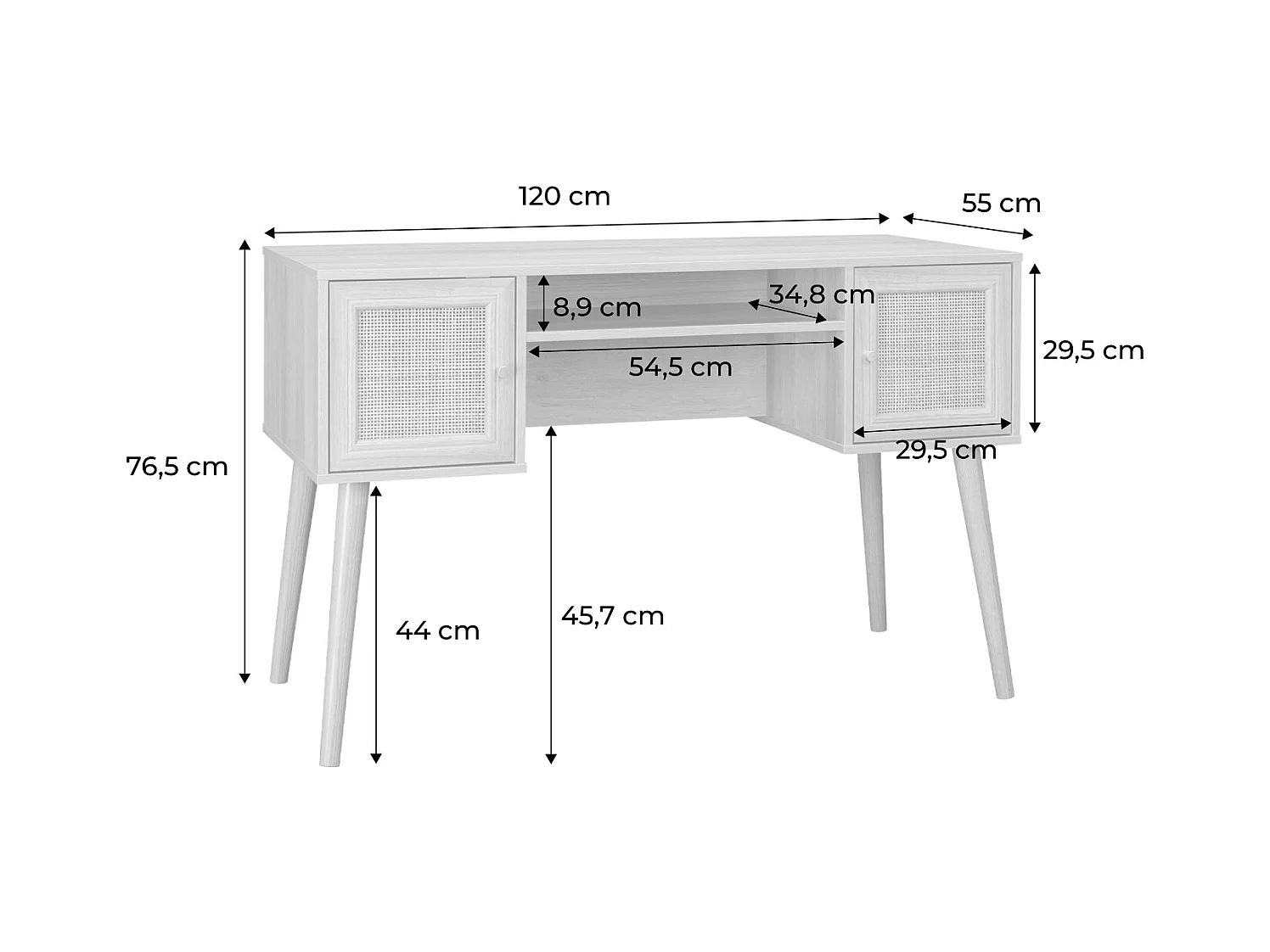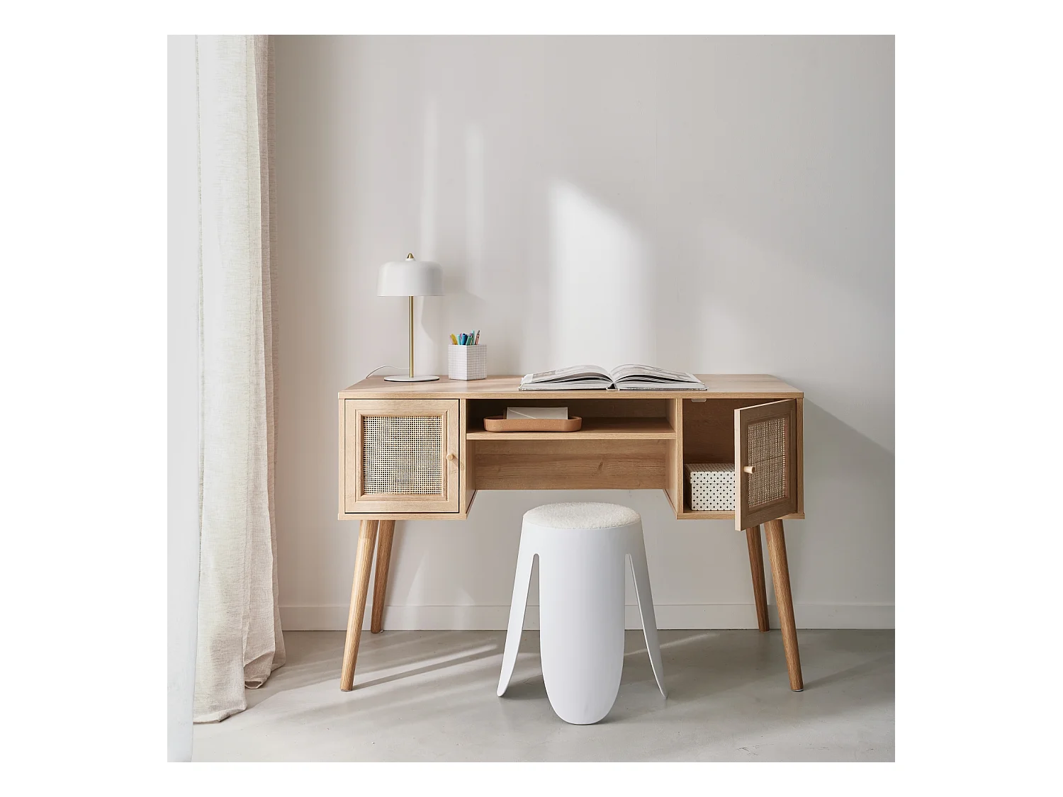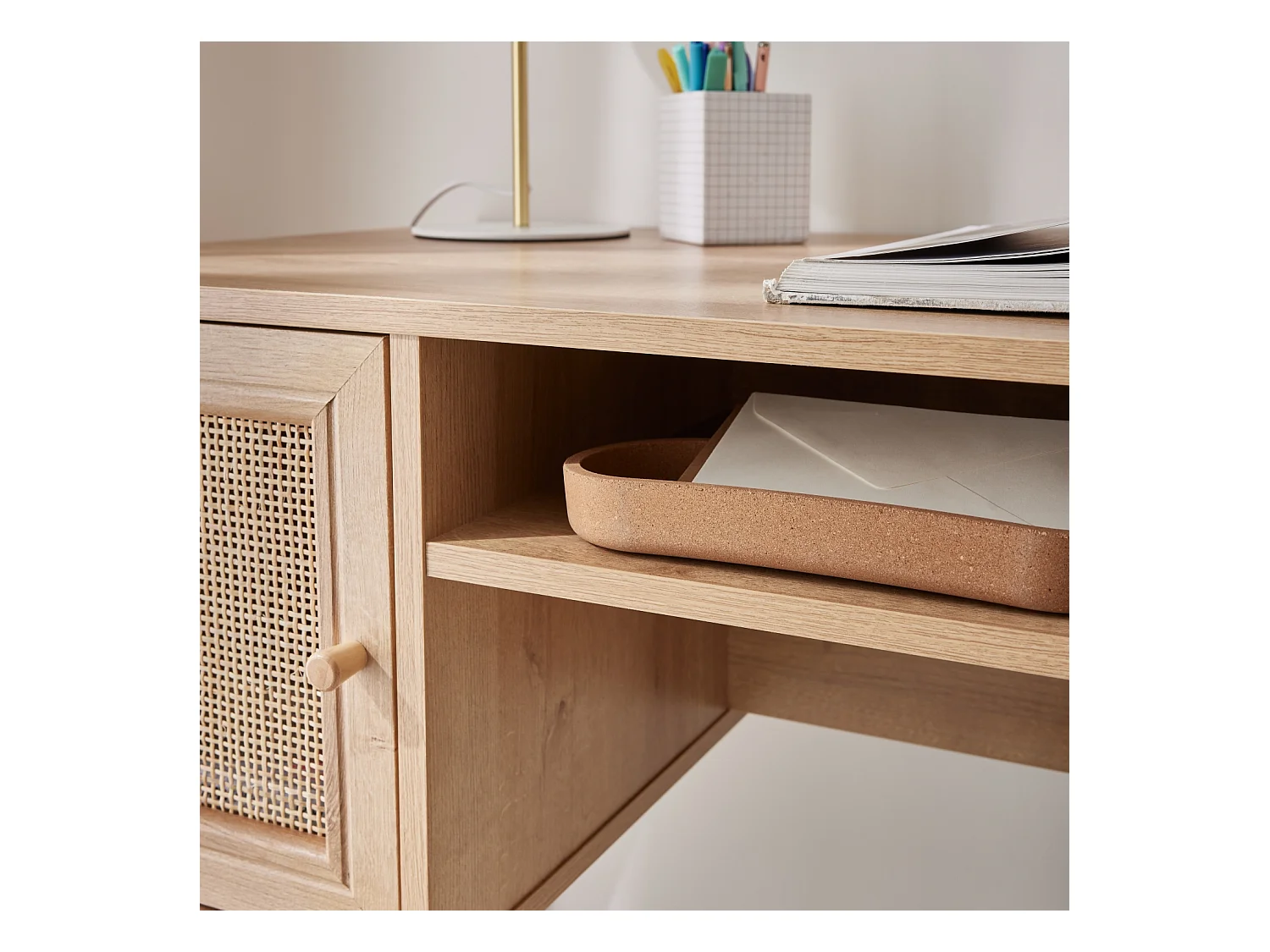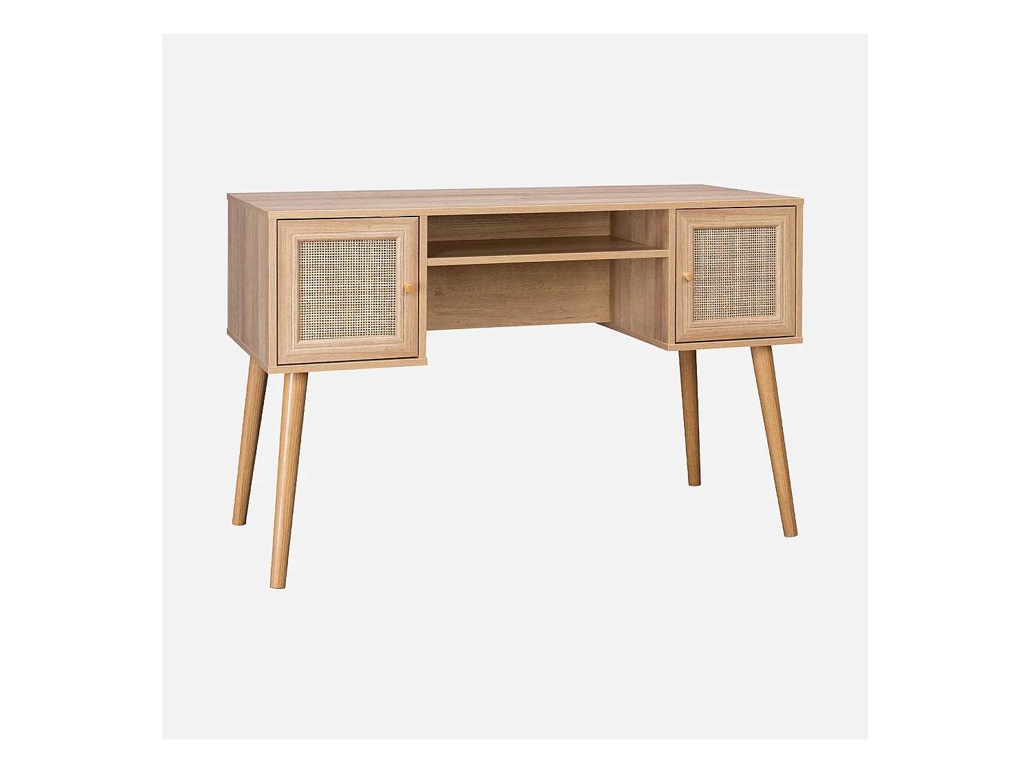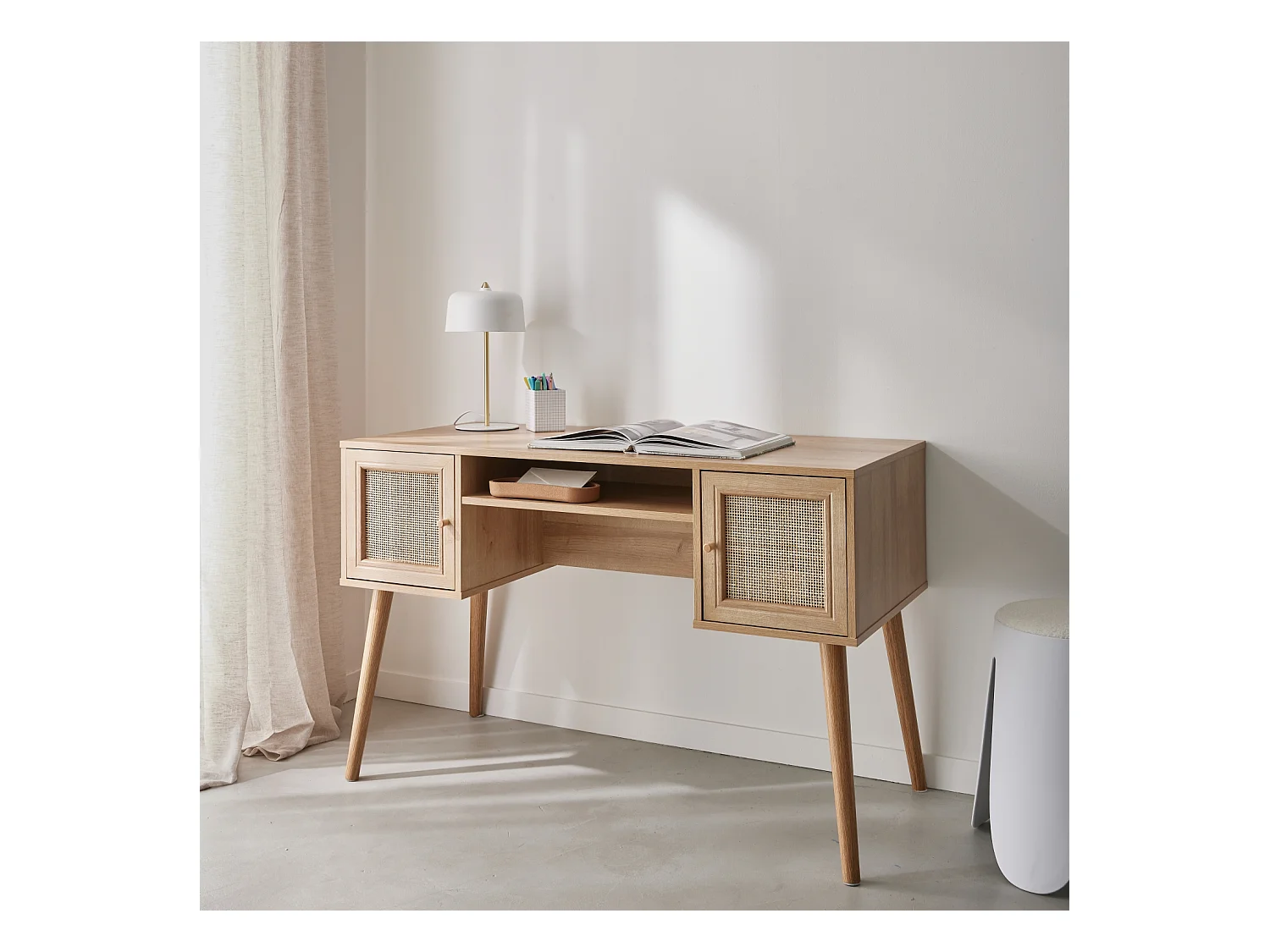 Bureau cannage et décor bois avec 2 portes. 1 casier ouvert. pieds compas