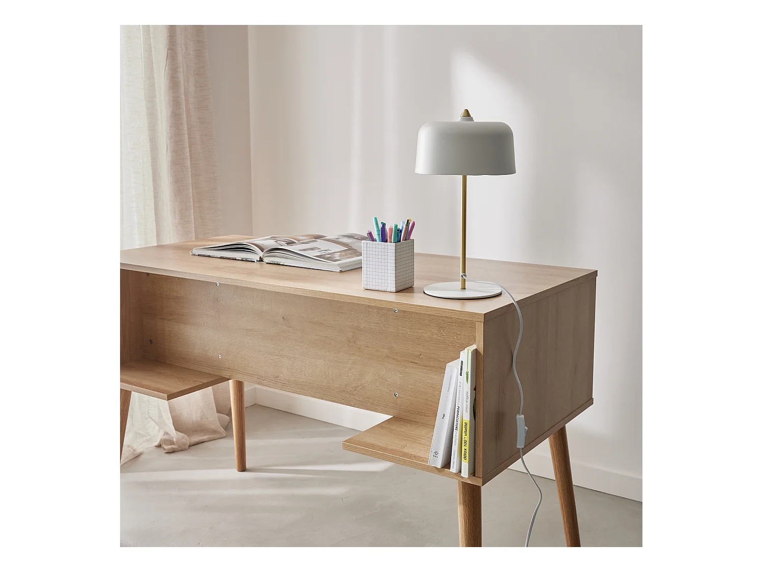 Bureau ovale décor bois rainuré avec deux espaces de rangement. L 120 x P 55 x H 77 cm