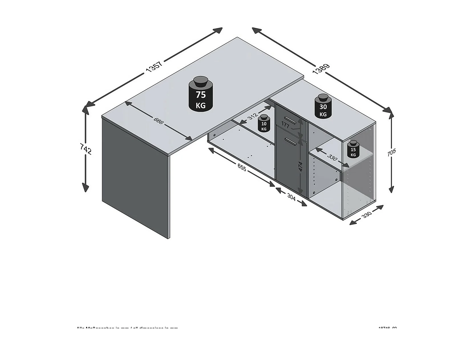 Bureau d'Angle Modulable avec Caisson, Tiroir et Étagères de Rangements - Lex