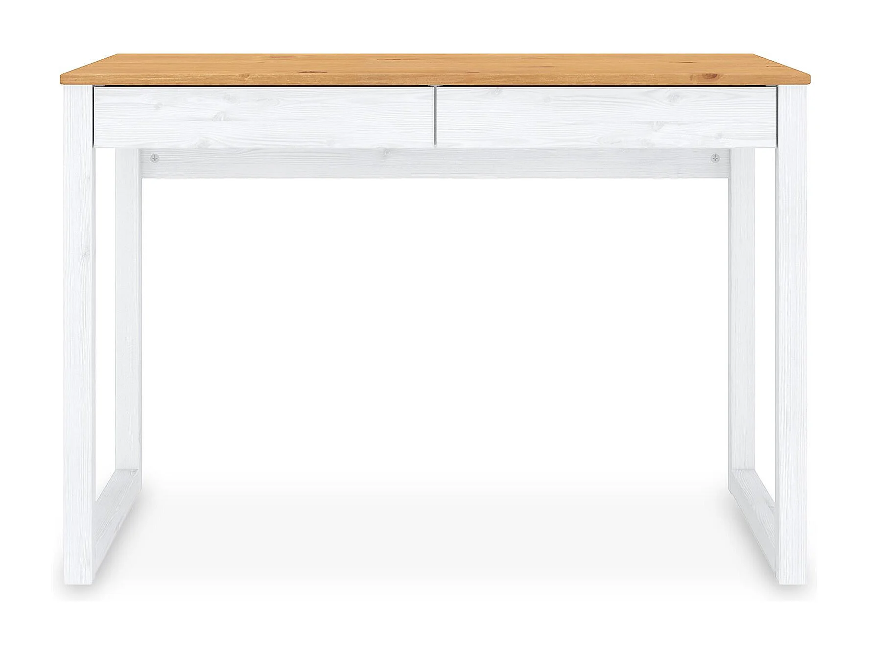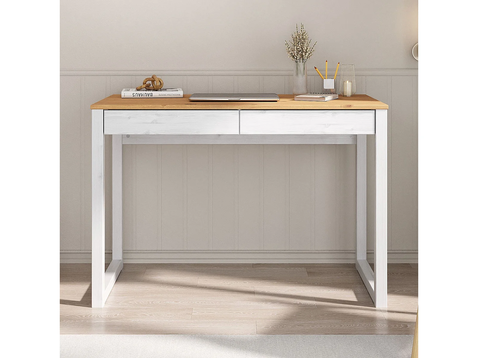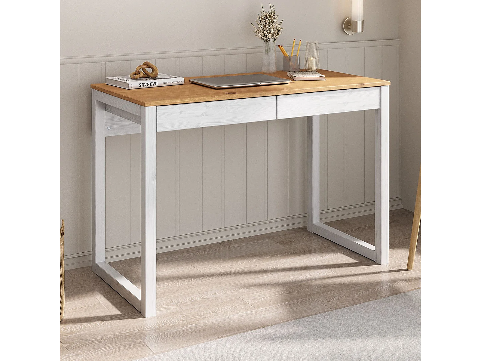 Bureau en bois avec 2 tiroirs NOAH, design scandinave, en pin massif coloris blanc et chêne