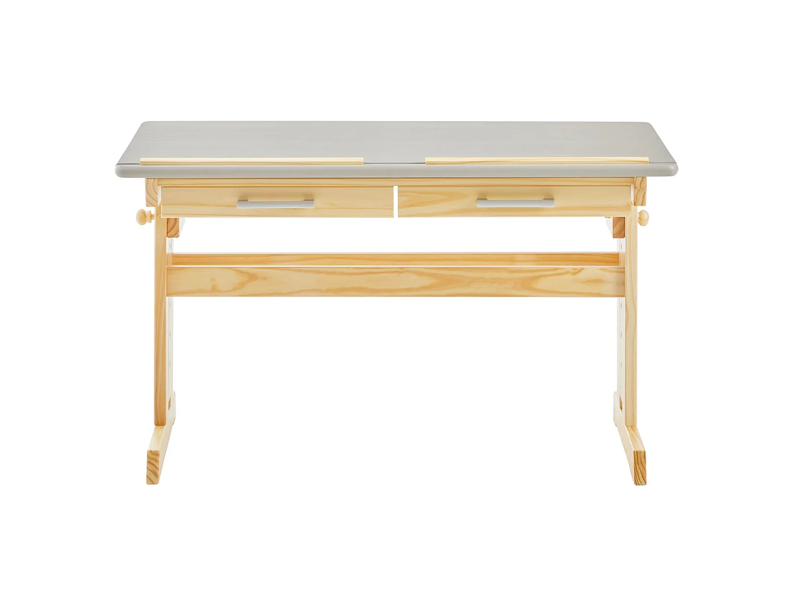 Bureau enfant écolier junior OLIVIA table à dessin réglable en hauteur et pupitre inclinable, 2 tiroirs en pin massif naturel/gris