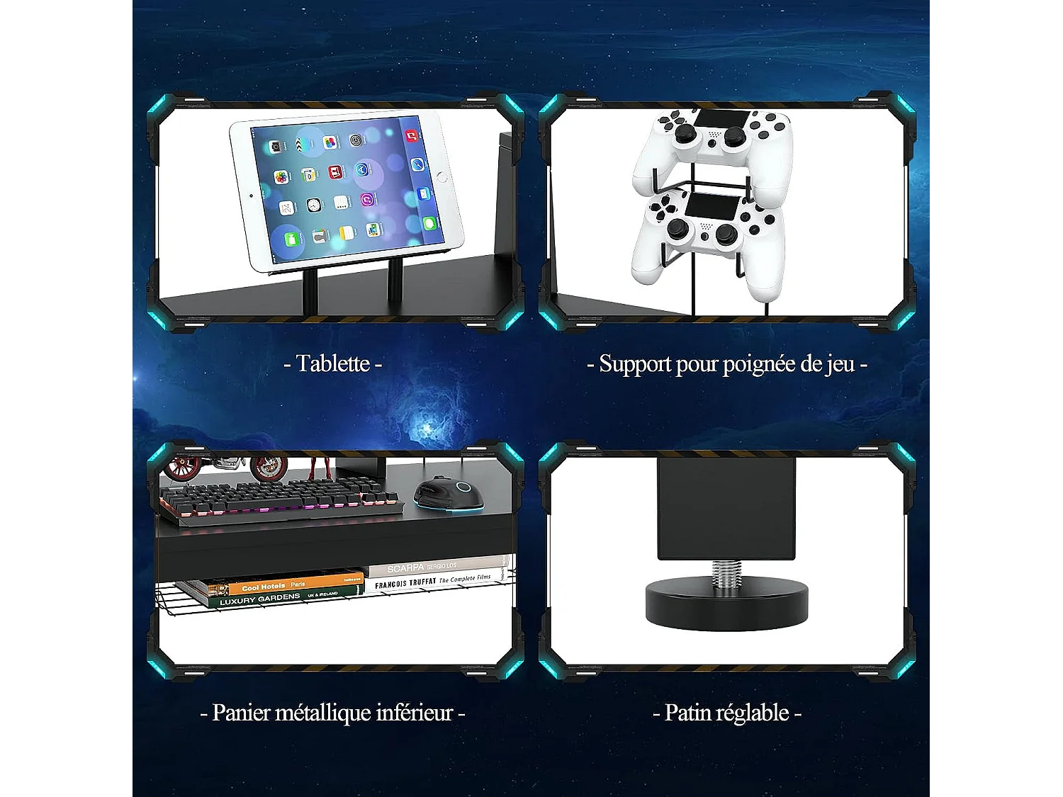 bureau gaming, gamer table avec etagère pour ecran, crochet casque, porte gobelet