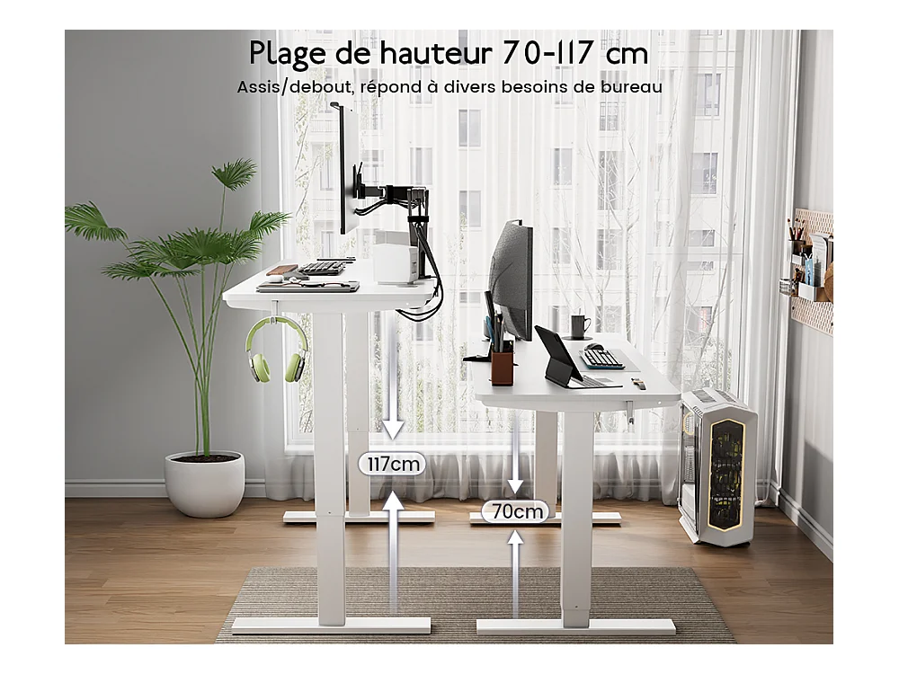 Bureau électrique assis-debout 140x70 cm – Hauteur réglable – Mémoire & anti-collision – Ports USB-A & Type-C – Coloris blanc