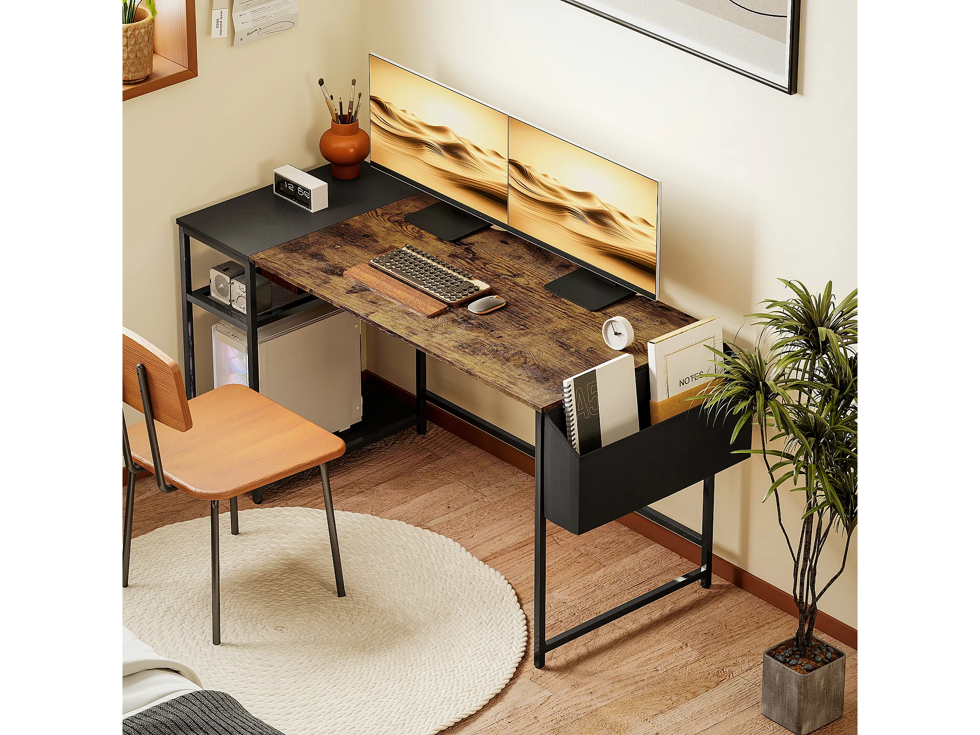 Bureau informatique style industriel dim. 150 x 60 cm - 3 étagères, panier - métal noir effet bois vieilli