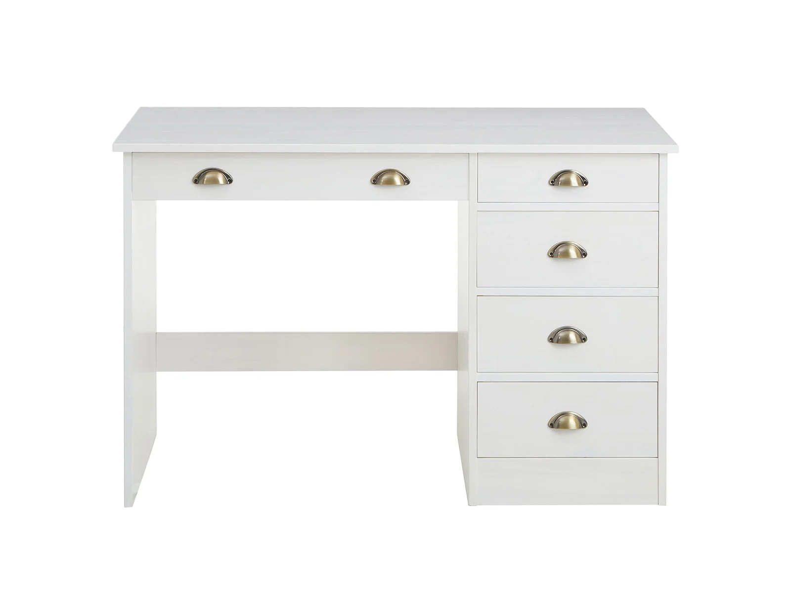 Bureau LANA avec rangement 5 tiroirs et poignées en forme de coquille, en pin massif lasuré blanc