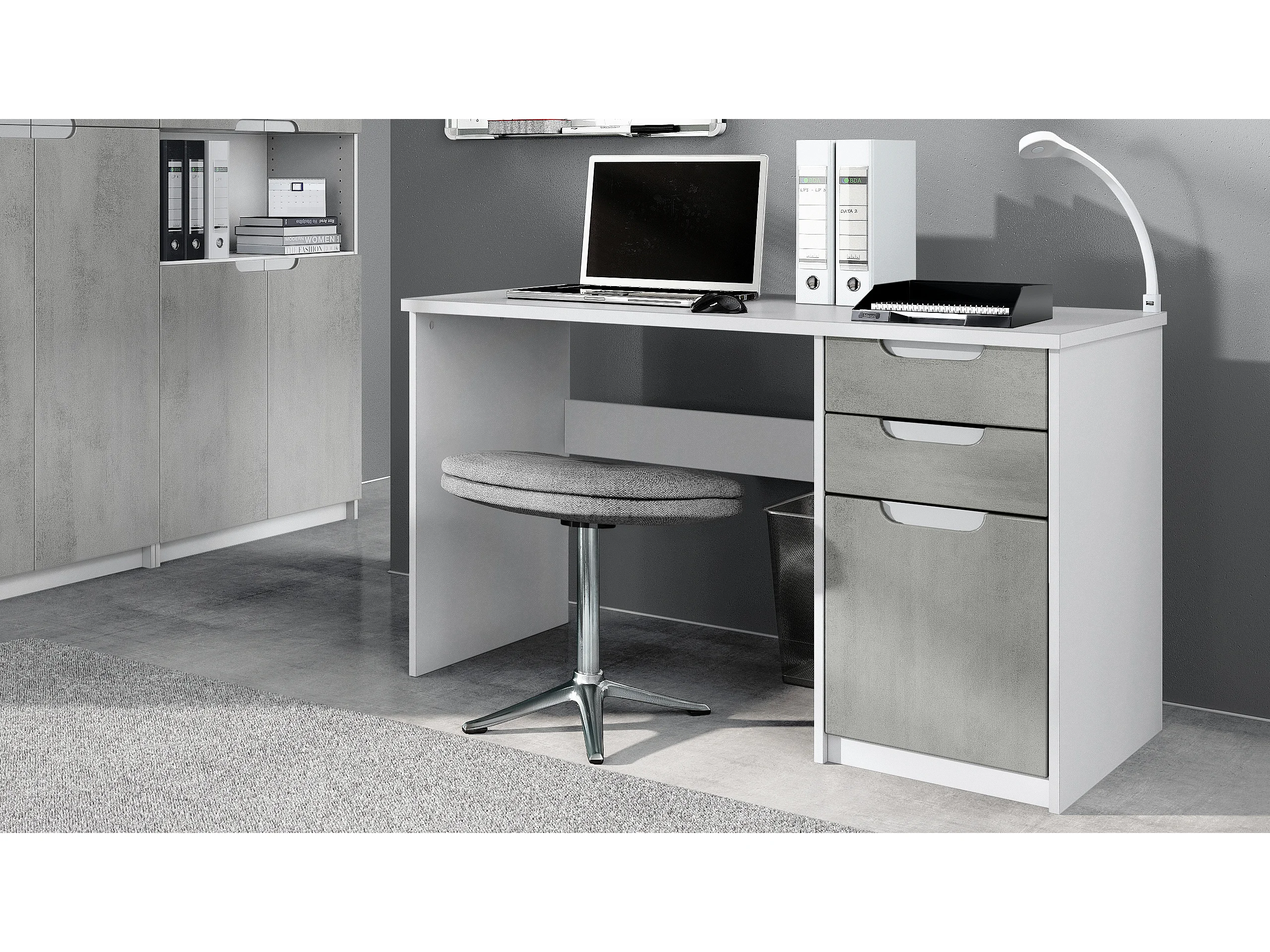 Bureau Logan, Petit bureau avec 2 tiroirs et d’une porte, blanc mat/aspect béton oxyde (129 x 76 x 60 cm)