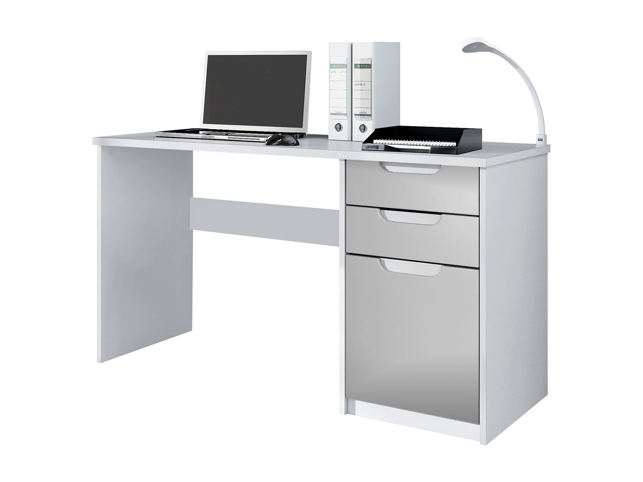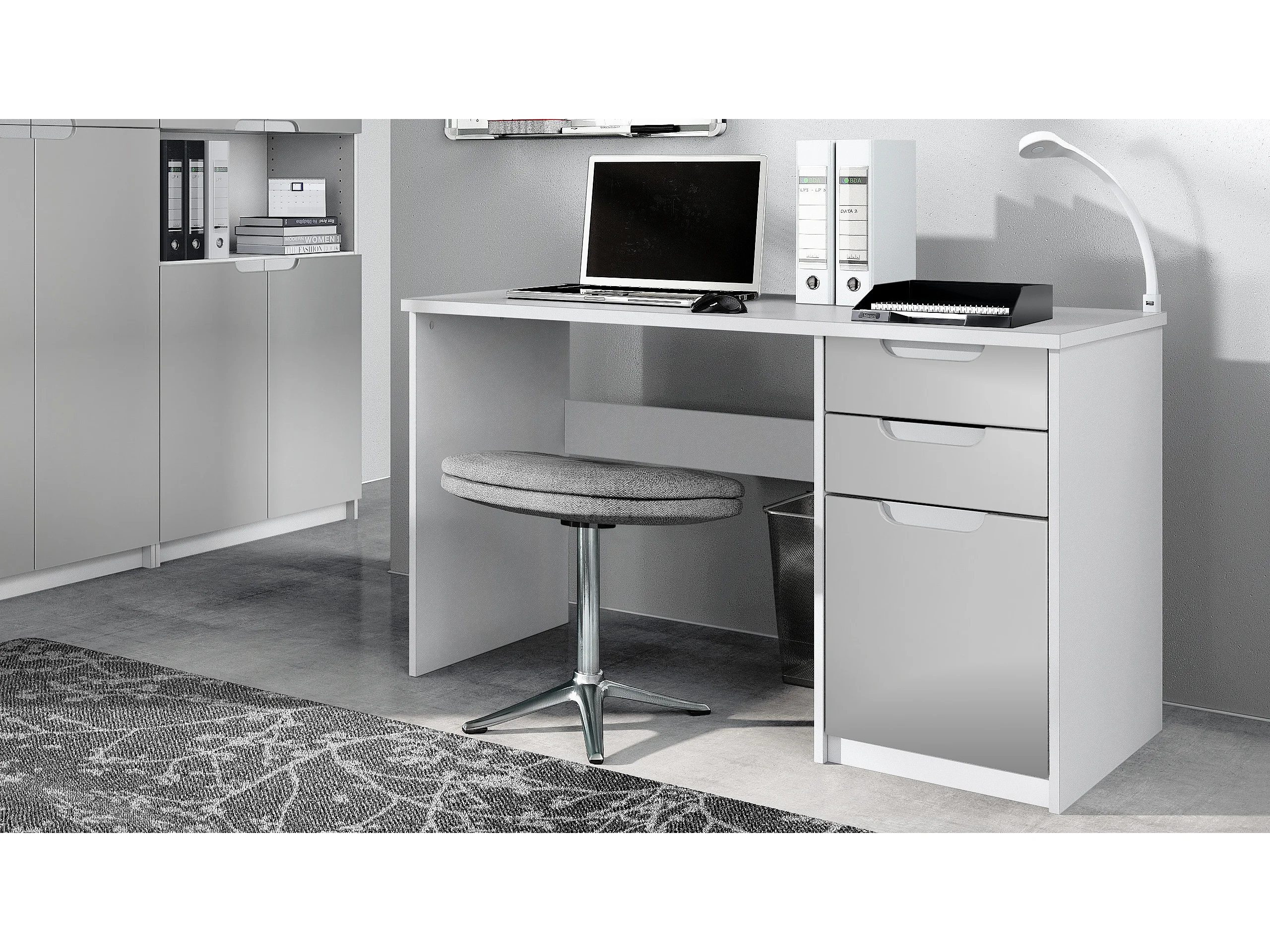 Bureau Logan, Petit bureau avec 2 tiroirs et d’une porte, blanc mat/gris clair satiné mat (129 x 76 x 60 cm)