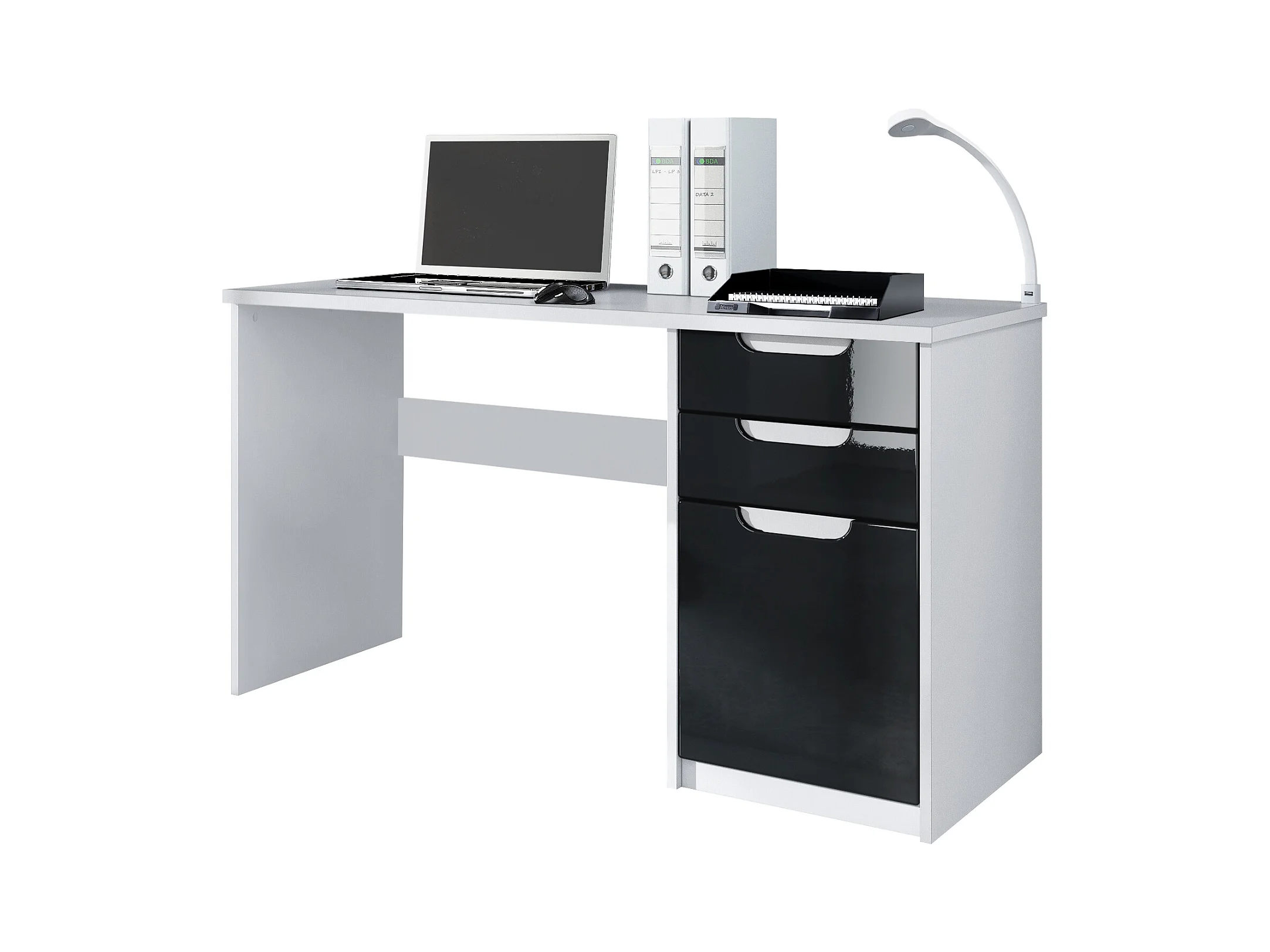 Bureau Logan, Petit bureau avec 2 tiroirs et d’une porte, blanc mat/noir haute brillance (129 x 76 x 60 cm)