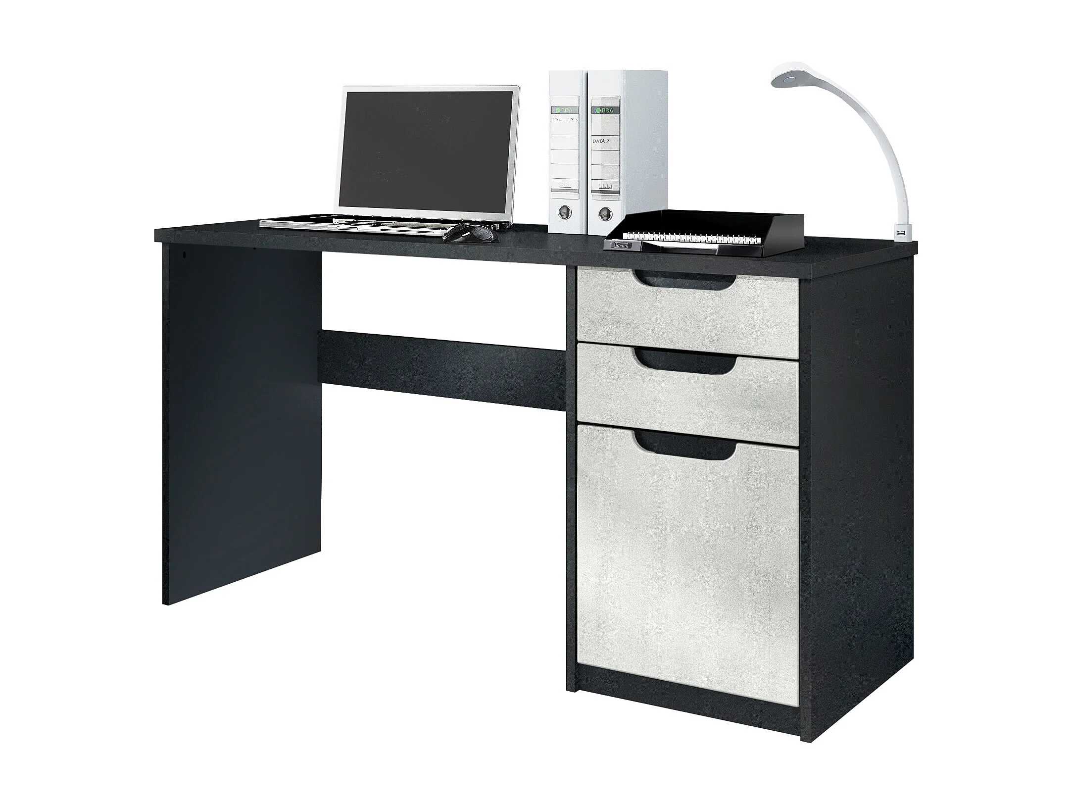 Bureau Logan, Petit bureau avec 2 tiroirs et d’une porte, noir mat/aspect béton oxyde (129 x 76 x 60 cm)