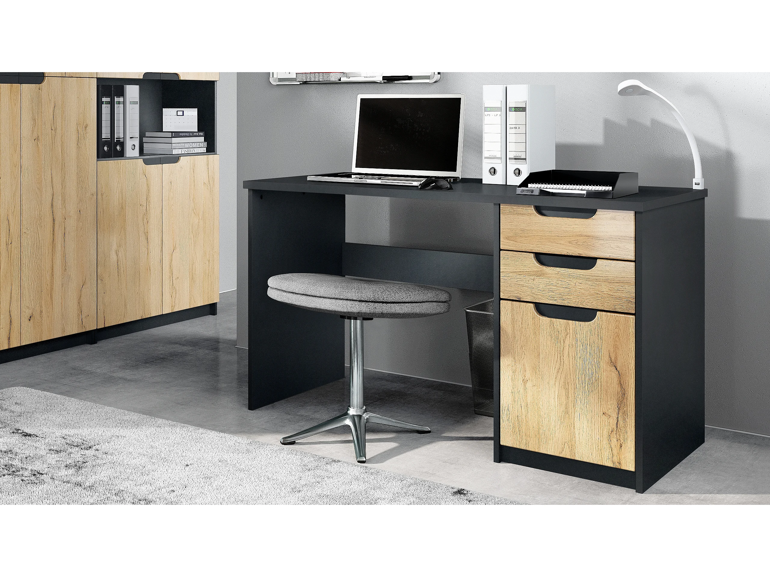 Bureau Logan, Petit bureau avec 2 tiroirs et d’une porte, noir mat/chêne nature (129 x 76 x 60 cm)