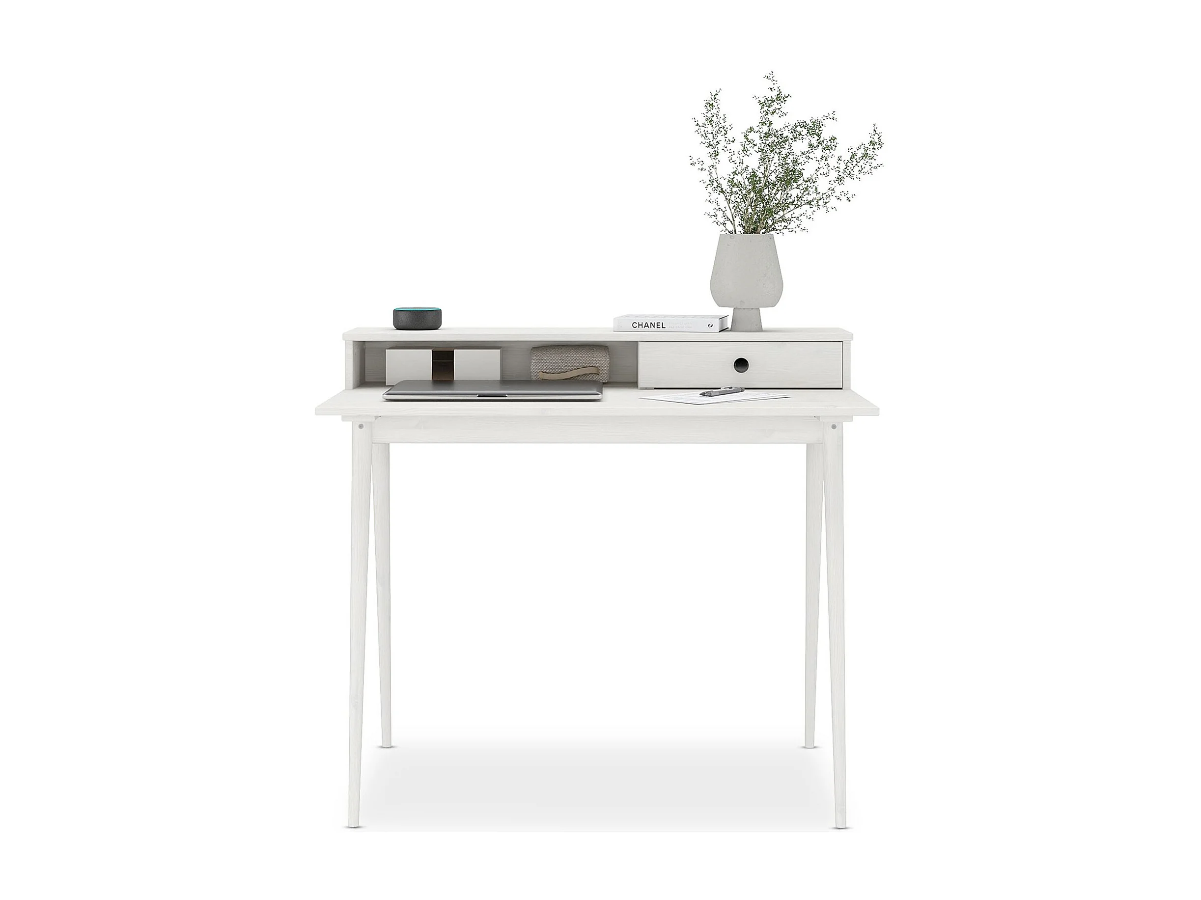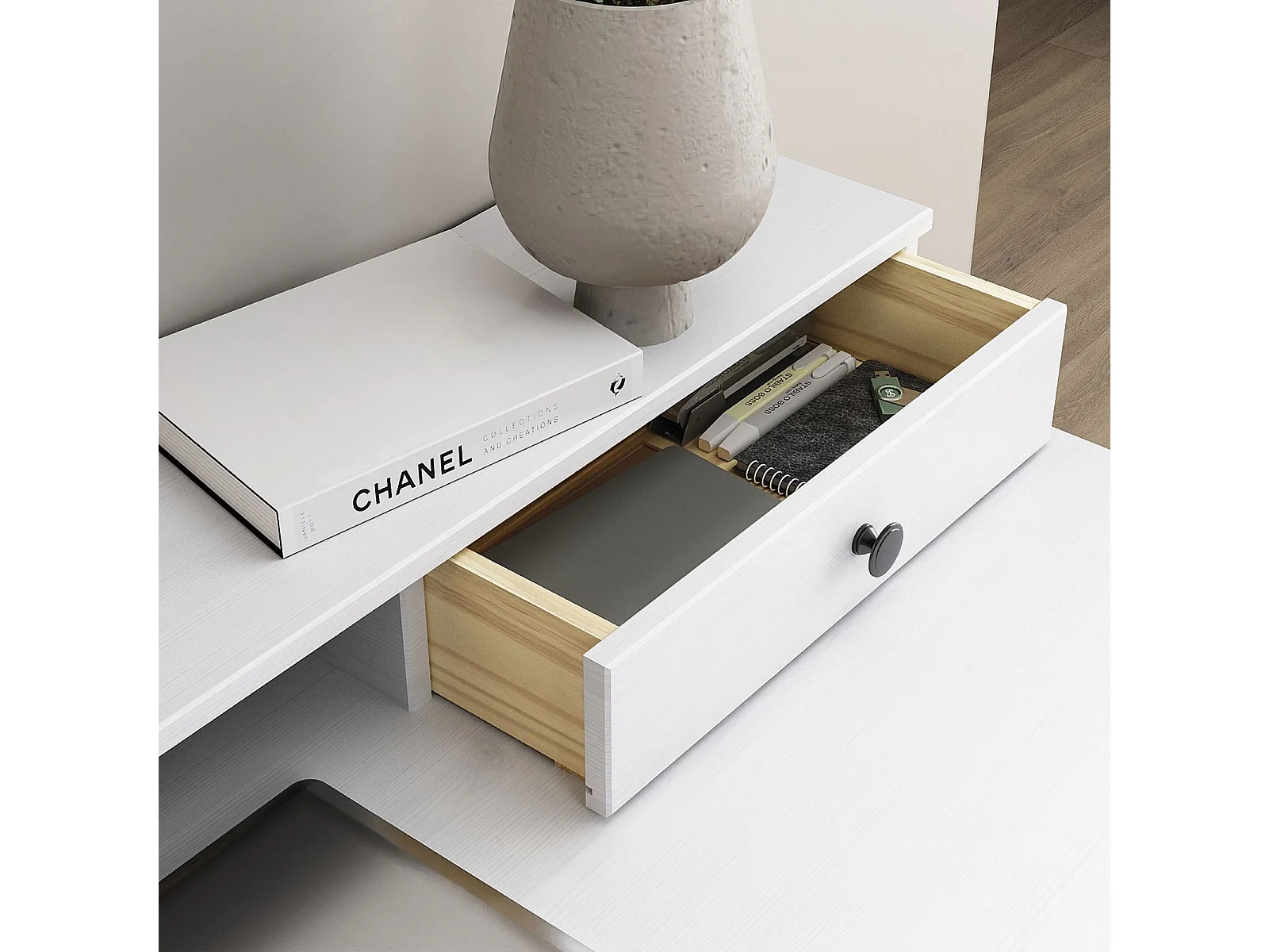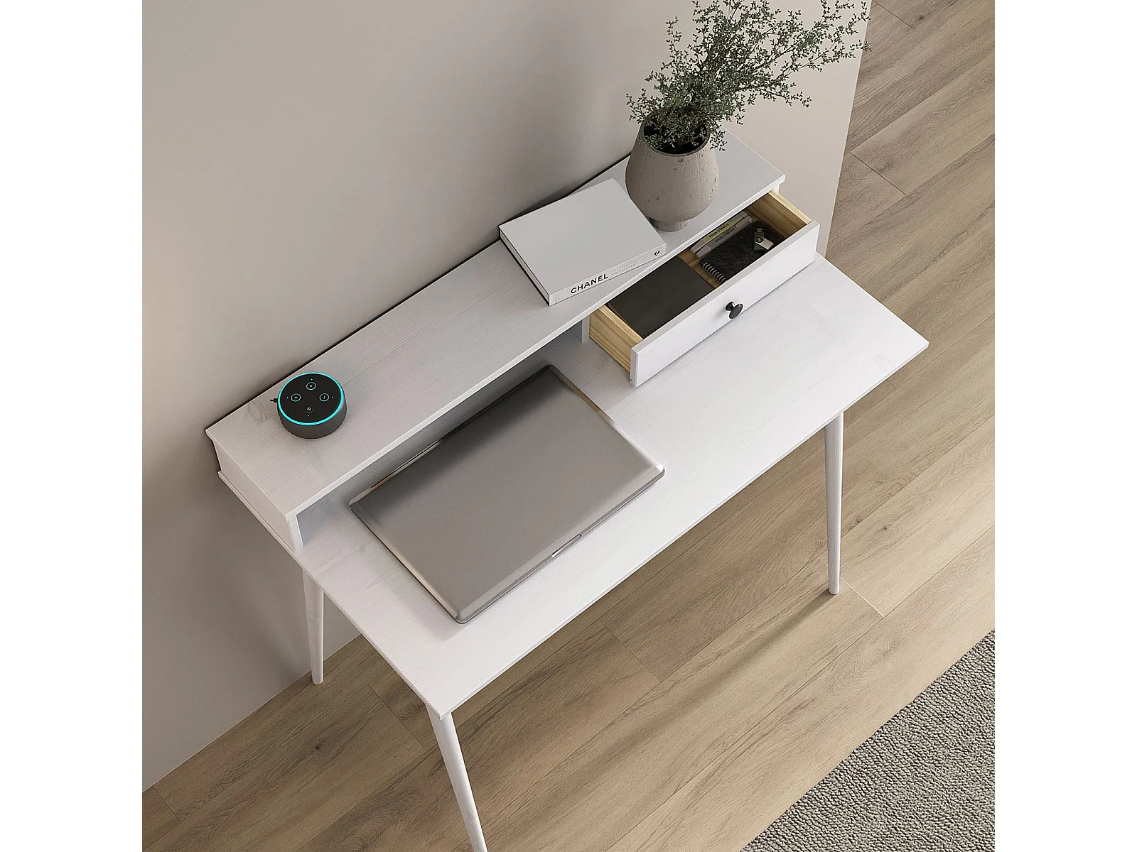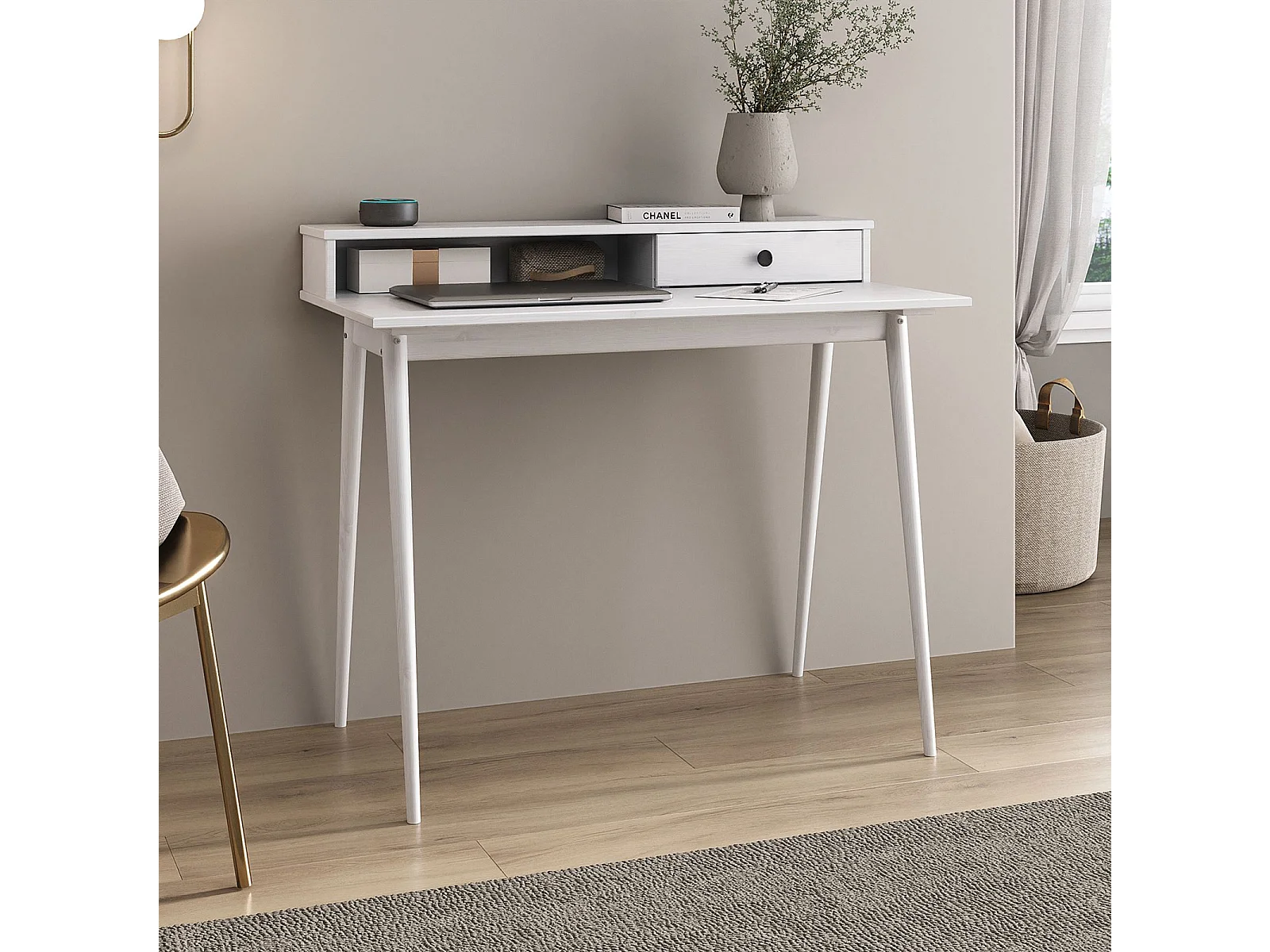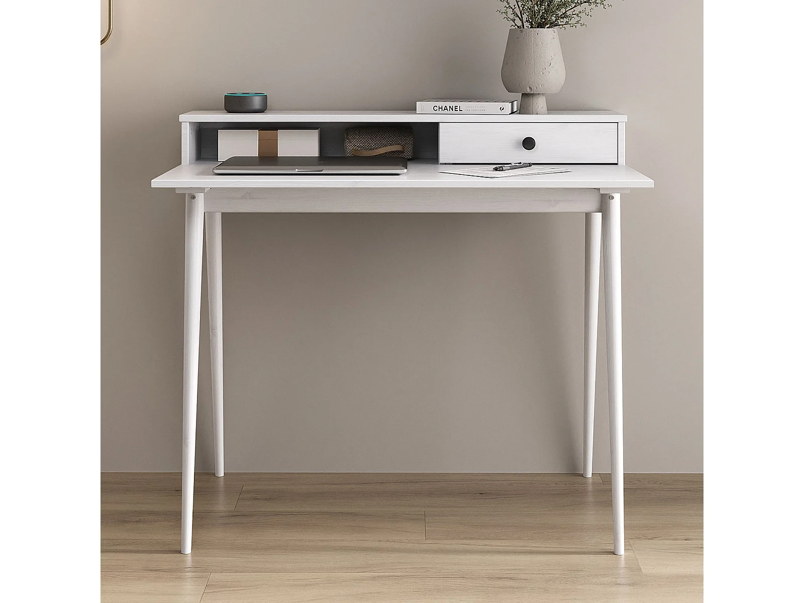 Bureau MALINA secrétaire en bois massif blanc avec rangement étagère et 1 tiroir design minimaliste 100 x 75 cm